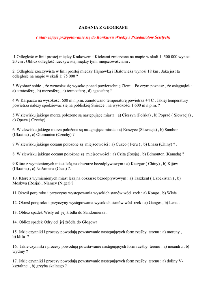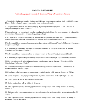 ZADANIA Z GEOGRAFII ( ułatwiające przygotowanie się do Konkursu Wiedzy z Przedmiotów Ścisłych) 1.Odległość w linii prostej między Krakowem i Kielcami zmierzona na mapie w skali 1: 500 000 wynosi 20 cm . Oblicz odległość rzeczywistą między tymi miejscowościami . 2. Odległość rzeczywista w linii prostej między Hajnówką i Białowieżą wynosi 18 km . Jaka jest ta odległość na mapie w skali 1: 75 000 ? 3.Wyobraź sobie , że wznosisz się wysoko ponad powierzchnię Ziemi . Po czym poznasz , że osiągnąłeś : a) stratosferę , b) mezosferę , c) termosferę , d) egzosferę ? 4.W Karpaczu na wysokości 600 m n.p.m. zanotowano temperaturę powietrza +4 C . Jakiej temperatury powietrza należy spodziewać się na pobliskiej Śnieżce , na wysokości 1 600 m n.p.m. ? 5.W zlewisku jakiego morza położone są następujące miasta : a) Cieszyn (Polska) , b) Poprad ( Słowacja) , c) Opava ( Czechy) . 6. W zlewisku jakiego morza położone są następujące miasta : a) Koszyce (Słowacja) , b) Sambor (Ukraina) , c) Ołomuniec (Czechy) ? 7.W zlewisku jakiego oceanu położone są miejscowości : a) Cuzco ( Peru ) , b) Lhasa (Chiny) ? . 8. W zlewisku jakiego oceanu położone są miejscowości : a) Czita (Rosja) , b) Edmonton (Kanada) ? 9.Które z wymienionych miast leżą na obszarze bezodpływowym : a) Kaszgar ( Chiny) , b) Kijów (Ukraina) , c) Ndżamena (Czad) ?. 10. Które z wymienionych miast leżą na obszarze bezodpływowym : a) Taszkent ( Uzbekistan ) , b) Moskwa (Rosja) , Niamey (Niger) ? 11.Określ porę roku i przyczyny występowania wysokich stanów wód rzek : a) Kongo , b) Wisła . 12. Określ porę roku i przyczyny występowania wysokich stanów wód rzek : a) Ganges , b) Lena . 13. Oblicz spadek Wisły od jej źródła do Sandomierza . 14. Oblicz spadek Odry od jej źródła do Głogowa . 15. Jakie czynniki i procesy powodują powstawanie następujących form rzeźby terenu : a) moreny , b) klifu ? 16. Jakie czynniki i procesy powodują powstawanie następujących form rzeźby terenu : a) meandru , b) wydmy ? 17. Jakie czynniki i procesy powodują powstawanie następujących form rzeźby terenu : a) doliny Vkształtnej , b) grzyba skalnego ? 18.Za pomocą schematycznego rysunku przedstaw powstawanie monsunu letniego . 19. Za pomocą schematycznego rysunku przedstaw powstawanie monsunu zimowego . 20. Za pomocą schematycznego rysunku przedstaw powstawanie przypływów syzygijnych. Podpisz fazy Księżyca. 21. Za pomocą schematycznego rysunku przedstaw powstawanie przypływów kadrowych. Podpisz fazy Księżyca. 22 .Określ typ genetyczny następujących jezior : a) Bajkał , b) Śniardwy , c) Albano . 23. Określ typ genetyczny następujących jezior : a) Wielki Staw , b) Tanganika , c) Łebsko . 24. Podane morza zaklasyfikuj do odpowiednich typów :a) Bałtyckie , b) Czarne , c) Celebes . 25. Podane morza zaklasyfikuj do odpowiednich typów : a) Arabskie , b) Północne , c) Karaibskie . 26. Podaj przyczyny bardzo małego zasolenia Morza Bałtyckiego. 27. Podaj przyczyny bardzo dużego zasolenia Morza Czerwonego . 28. Na podstawie danych zamieszczonych w tabeli oblicz : a) amplitudę roczną temperatury , b) sumę roczna opadów . Temp. C Opady w mm I -1,1 27 II -0,8 23 III 4,0 26 IV 8.2 37 V 13,9 57 VI 16,0 85 VII 18,1 61 VIII 17,7 67 IX 13,8 47 X 9,7 31 XI 3,6 35 XII 0,8 35 29. Na podstawie danych zamieszczonych w tabeli oblicz : a) amplitudę roczną temperatury , b) sumę roczna opadów . Temp. C Opady w mm I II III IV V -26,8 -27,9 -25,9 -17,7 -7,6 5 4 3 3 3 VI 0,6 9 VII 3,9 20 VIII IX 3,3 -0,8 23 16 X -8,6 13 XI -18,2 6 XII -24,0 4 30.Podaj pełna nazwę i miejsce powstawania mas powietrza o skrócie : a) Ppm , b) Pzk . 31. Podaj pełna nazwę i miejsce powstawania mas powietrza o skrócie : a) Ppk , b) PA. 32. Na czym polegają i gdzie występują procesy krasowe ? . Podaj trzy przykłady form krasu podziemnego . 33. Oblicz wysokość górowania Słońca w pierwsze dni kalendarzowych pór roku w a) Damaszku 33ºN b) Manaus 2ºS opracowała mgr Beata Kryczka
