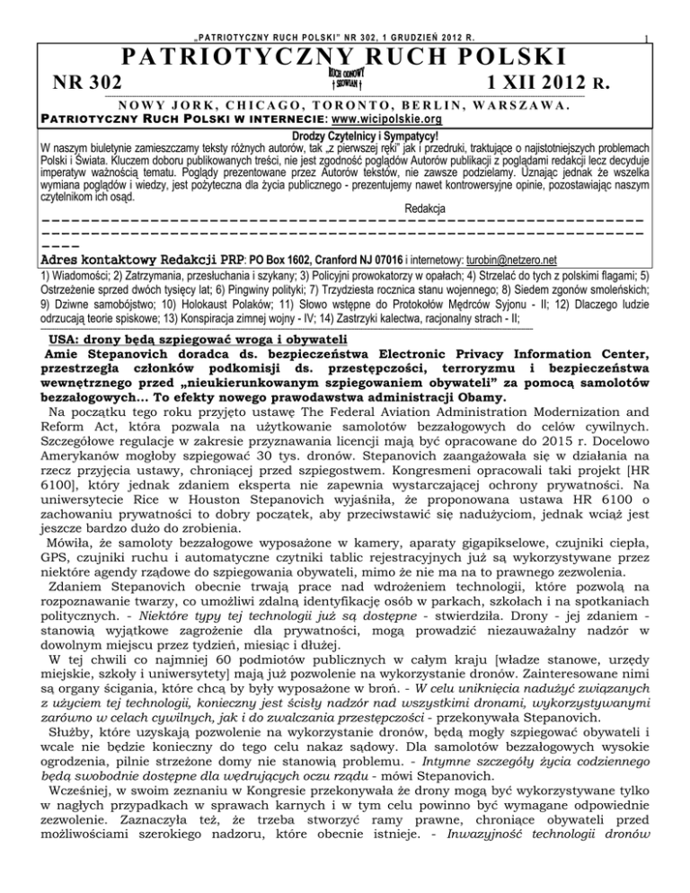 „PATRIOTYCZNY RUCH POLSKI” NR 302, 1 GRUDZIEŃ 2012 R. 1 PATRIOTYCZNY RUCH POLSKI NR 302 1 XII 2012 R . --------------------------------------------------------------------------------------------------------------------------------------------------------------------------------------------------------------------- NOWY JORK, CHICAGO, TORONTO, BERLIN, WARSZAWA. P ATRIOTYCZNY R UCH P OLSKI W INTERNECIE : www.wicipolskie.org Drodzy Czytelnicy i Sympatycy! W naszym biuletynie zamieszczamy teksty różnych autorów, tak „z pierwszej ręki” jak i przedruki, traktujące o najistotniejszych problemach Polski i Świata. Kluczem doboru publikowanych treści, nie jest zgodność poglądów Autorów publikacji z poglądami redakcji lecz decyduje imperatyw ważnością tematu. Poglądy prezentowane przez Autorów tekstów, nie zawsze podzielamy. Uznając jednak że wszelka wymiana poglądów i wiedzy, jest pożyteczna dla życia publicznego - prezentujemy nawet kontrowersyjne opinie, pozostawiając naszym czytelnikom ich osąd. Redakcja ---------------------------------------------------------------------------------------------------------------------------Adres kontaktowy Redakcji PRP: PO Box 1602, Cranford NJ 07016 i internetowy: [email protected] 1) Wiadomości; 2) Zatrzymania, przesłuchania i szykany; 3) Policyjni prowokatorzy w opałach; 4) Strzelać do tych z polskimi flagami; 5) Ostrzeżenie sprzed dwóch tysięcy lat; 6) Pingwiny polityki; 7) Trzydziesta rocznica stanu wojennego; 8) Siedem zgonów smoleńskich; 9) Dziwne samobójstwo; 10) Holokaust Polaków; 11) Słowo wstępne do Protokołów Mędrców Syjonu - II; 12) Dlaczego ludzie odrzucają teorie spiskowe; 13) Konspiracja zimnej wojny - IV; 14) Zastrzyki kalectwa, racjonalny strach - II; -------------------------------------------------------------------------------------------------------------------------------------------------------------------------------------------------------------------------------------------------------------------------------------------------------------------------------- USA: drony będą szpiegować wroga i obywateli Amie Stepanovich doradca ds. bezpieczeństwa Electronic Privacy Information Center, przestrzegła członków podkomisji ds. przestępczości, terroryzmu i bezpieczeństwa wewnętrznego przed „nieukierunkowanym szpiegowaniem obywateli” za pomocą samolotów bezzałogowych... To efekty nowego prawodawstwa administracji Obamy. Na początku tego roku przyjęto ustawę The Federal Aviation Administration Modernization and Reform Act, która pozwala na użytkowanie samolotów bezzałogowych do celów cywilnych. Szczegółowe regulacje w zakresie przyznawania licencji mają być opracowane do 2015 r. Docelowo Amerykanów mogłoby szpiegować 30 tys. dronów. Stepanovich zaangażowała się w działania na rzecz przyjęcia ustawy, chroniącej przed szpiegostwem. Kongresmeni opracowali taki projekt [HR 6100], który jednak zdaniem eksperta nie zapewnia wystarczającej ochrony prywatności. Na uniwersytecie Rice w Houston Stepanovich wyjaśniła, że proponowana ustawa HR 6100 o zachowaniu prywatności to dobry początek, aby przeciwstawić się nadużyciom, jednak wciąż jest jeszcze bardzo dużo do zrobienia. Mówiła, że samoloty bezzałogowe wyposażone w kamery, aparaty gigapikselowe, czujniki ciepła, GPS, czujniki ruchu i automatyczne czytniki tablic rejestracyjnych już są wykorzystywane przez niektóre agendy rządowe do szpiegowania obywateli, mimo że nie ma na to prawnego zezwolenia. Zdaniem Stepanovich obecnie trwają prace nad wdrożeniem technologii, które pozwolą na rozpoznawanie twarzy, co umożliwi zdalną identyfikację osób w parkach, szkołach i na spotkaniach politycznych. - Niektóre typy tej technologii już są dostępne - stwierdziła. Drony - jej zdaniem stanowią wyjątkowe zagrożenie dla prywatności, mogą prowadzić niezauważalny nadzór w dowolnym miejscu przez tydzień, miesiąc i dłużej. W tej chwili co najmniej 60 podmiotów publicznych w całym kraju [władze stanowe, urzędy miejskie, szkoły i uniwersytety] mają już pozwolenie na wykorzystanie dronów. Zainteresowane nimi są organy ścigania, które chcą by były wyposażone w broń. - W celu uniknięcia nadużyć związanych z użyciem tej technologii, konieczny jest ścisły nadzór nad wszystkimi dronami, wykorzystywanymi zarówno w celach cywilnych, jak i do zwalczania przestępczości - przekonywała Stepanovich. Służby, które uzyskają pozwolenie na wykorzystanie dronów, będą mogły szpiegować obywateli i wcale nie będzie konieczny do tego celu nakaz sądowy. Dla samolotów bezzałogowych wysokie ogrodzenia, pilnie strzeżone domy nie stanowią problemu. - Intymne szczegóły życia codziennego będą swobodnie dostępne dla wędrujących oczu rządu - mówi Stepanovich. Wcześniej, w swoim zeznaniu w Kongresie przekonywała że drony mogą być wykorzystywane tylko w nagłych przypadkach w sprawach karnych i w tym celu powinno być wymagane odpowiednie zezwolenie. Zaznaczyła też, że trzeba stworzyć ramy prawne, chroniące obywateli przed możliwościami szerokiego nadzoru, które obecnie istnieje. - Inwazyjność technologii dronów 2 „PATRIOTYCZNY RUCH POLSKI” NR 302, 1 GRUDZIEŃ 2012 R. zwiększa zagrożenie dla prywatności osób fizycznych, wykonujących codzienne czynności. Nawet jeśli organy ścigania nie są w stanie dostrzec, co dokładnie dana osoba mówi lub kupuje w określonym miejscu, to jednak śledzenie ruchów osób publicznych w sposób systematyczny przez dłuższy czas może stworzyć żywy opis ich życia prywatnego - przestrzegała ekspertka. Źródło: wnd.com, Agnieszka Stelmach – [data publikacji: 2012-11-09] Za: http://www.pch24.pl/usa--drony-beda-szpiegowac-wroga-i-obywateli,-7318,i.html Read more: http://www.pch24.pl/usa--drony-beda-szpiegowac-wroga-i-obywateli,7318,i.html#ixzz2BgL7XZOF # # # ONZ: u progu stania się rządem świa