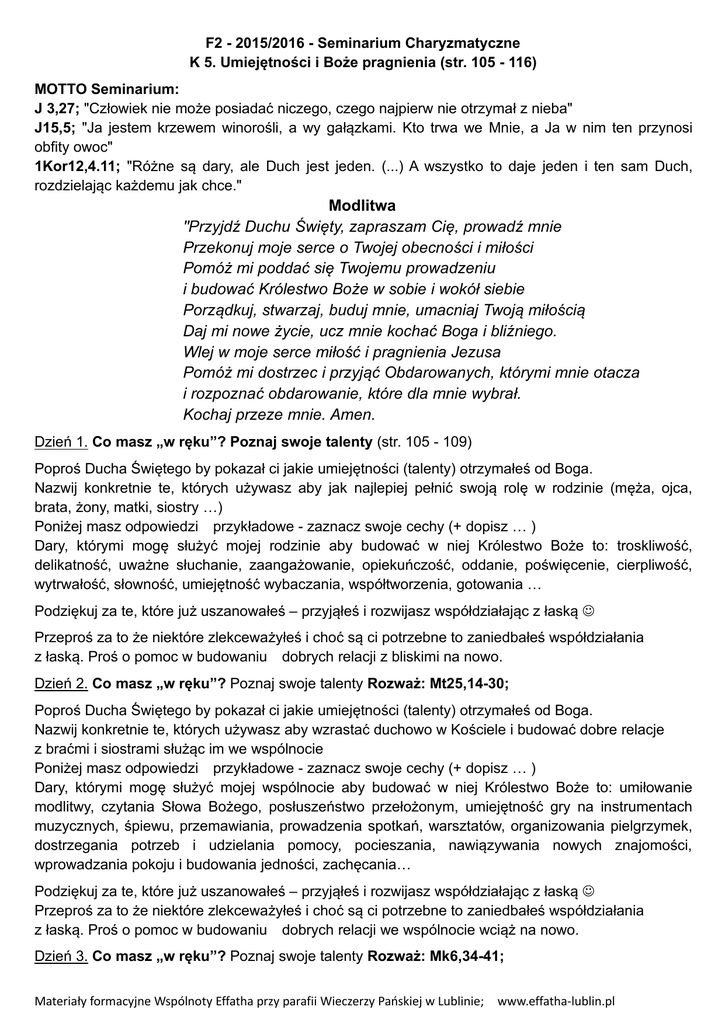F2 - 2015/2016 - Seminarium Charyzmatyczne K 5. Umiejętności i Boże pragnienia (str. 105 - 116) MOTTO Seminarium: J 3,27; "Człowiek nie może posiadać niczego, czego najpierw nie otrzymał z nieba" J15,5; "Ja jestem krzewem winorośli, a wy gałązkami. Kto trwa we Mnie, a Ja w nim ten przynosi obfity owoc" 1Kor12,4.11; "Różne są dary, ale Duch jest jeden. (...) A wszystko to daje jeden i ten sam Duch, rozdzielając każdemu jak chce." Modlitwa "Przyjdź Duchu Święty, zapraszam Cię, prowadź mnie Przekonuj moje serce o Twojej obecności i miłości Pomóż mi poddać się Twojemu prowadzeniu i budować Królestwo Boże w sobie i wokół siebie Porządkuj, stwarzaj, buduj mnie, umacniaj Twoją miłością Daj mi nowe życie, ucz mnie kochać Boga i bliźniego. Wlej w moje serce miłość i pragnienia Jezusa Pomóż mi dostrzec i przyjąć Obdarowanych, którymi mnie otacza i rozpoznać obdarowanie, które dla mnie wybrał. Kochaj przeze mnie. Amen. Dzień 1. Co masz „w ręku”? Poznaj swoje talenty (str. 105 - 109) Poproś Ducha Świętego by pokazał ci jakie umiejętności (talenty) otrzymałeś od Boga. Nazwij konkretnie te, których używasz aby jak najlepiej pełnić swoją rolę w rodzinie (męża, ojca, brata, żony, matki, siostry …) Poniżej masz odpowiedzi przykładowe - zaznacz swoje cechy (+ dopisz … ) Dary, którymi mogę służyć mojej rodzinie aby budować w niej Królestwo Boże to: troskliwość, delikatność, uważne słuchanie, zaangażowanie, opiekuńczość, oddanie, poświęcenie, cierpliwość, wytrwałość, słowność, umiejętność wybaczania, współtworzenia, gotowania … Podziękuj za te, które już uszanowałeś – przyjąłeś i rozwijasz współdziałając z łaską Przeproś za to że niektóre zlekceważyłeś i choć są ci potrzebne to zaniedbałeś współdziałania z łaską. Proś o pomoc w budowaniu dobrych relacji z bliskimi na nowo. Dzień 2. Co masz „w ręku”? Poznaj swoje talenty Rozważ: Mt25,14-30; Poproś Ducha Świętego by pokazał ci jakie umiejętności (talenty) otrzymałeś od Boga. Nazwij konkretnie te, których używasz aby wzrastać duchowo w Kościele i budować dobre relacje z braćmi i siostrami służąc im we wspólnocie Poniżej masz odpowiedzi przykładowe - zaznacz swoje cechy (+ dopisz … ) Dary, którymi mogę służyć mojej wspólnocie aby budować w niej Królestwo Boże to: umiłowanie modlitwy, czytania Słowa Bożego, posłuszeństwo przełożonym, umiejętność gry na instrumentach muzycznych, śpiewu, przemawiania, prowadzenia spotkań, warsztatów, organizowania pielgrzymek, dostrzegania potrzeb i udzielania pomocy, pocieszania, nawiązywania nowych znajomości, wprowadzania pokoju i budowania jedności, zachęcania… Podziękuj za te, które już uszanowałeś – przyjąłeś i rozwijasz współdziałając z łaską Przeproś za to że niektóre zlekceważyłeś i choć są ci potrzebne to zaniedbałeś współdziałania z łaską. Proś o pomoc w budowaniu dobrych relacji we wspólnocie wciąż na nowo. Dzień 3. Co masz „w ręku”? Poznaj swoje talenty Rozważ: Mk6,34-41; Materiały formacyjne Wspólnoty Effatha przy parafii Wieczerzy Pańskiej w Lublinie; www.effatha-lublin.pl Poproś Ducha Świętego by pokazał ci jakie umiejętności (talenty) otrzymałeś od Boga. Nazwij konkretnie te, których używasz aby budować dobre relacje z przyjaciółmi, sąsiadami, kolegami i znajomymi, przełożonymi i podwładnymi w pracy Poniżej masz odpowiedzi przykładowe - zaznacz swoje cechy (+ dopisz … ) Dary, którymi mogę służyć innym ludziom aby budować między ludźmi Królestwo Boże to: gościnność, pamiętanie i podtrzymywanie kontaktu, hojność, umiejętności: słuchania, wspierania, współdziałania, pozostawiania wolności wyboru, bezstronność, dokładność, szczerość, asertywność, odpowiedzialność, sumienność, umiejętności: przewidywania, planowania, organizowania, właściwej oceny możliwości osób, którym zlecam zadania, motywowania i rozliczania pracowników Podziękuj za te, które już uszanowałeś – przyjąłeś i rozwijasz współdziałając z łaską Przeproś za to że niektóre zlekceważyłeś i choć są ci potrzebne to zaniedbałeś współdziałania z łaską. Proś o pomoc w budowaniu dobrych relacji we wspólnocie wciąż na nowo. Dzień 4. Co mam „w sercu”? Jakie pragnienia od dawna w sobie noszę ? (str. 110-116) Jakim dziełem mojego życia chciałbym uwielbić Boga? Pomoc: Jacy bohaterowie mi imponują? Kto z ludzi konkretnie jest dla mnie wzorem? Jakie cechy tej osoby mnie pociągają? (Odwaga, wytrwałość, mądrość, zaangażowanie …) Podziękuj za te pragnienia, które rozpoznałeś jako Boże wezwanie do miłości i proś, aby uwolnił Cię od tych, które są tylko pokusami pychy lub egoizmu. Dzień 5. Co mam „w sercu”? Jakim dziełem mojego życia chciałbym uwielbić Boga? J4,10-34; Jakie pragnienia od dawna w sobie noszę ? Czy umiem rozpoznać, które pragnienia pochodzą od Boga, a które nie? Czy znam reguły rozeznawania? Czy mam stałego spowiednika lub kierownika duchowego? Czy przyjmuję prawdę o sobie? Czy oddaję Bogu część w Duchu i Prawdzie, szczerym i miłującym sercem? Czy Bóg jest w nim na pierwszym miejscu? Czy szukam Jego woli? Czy wierzę, ufam, że Bóg chce dla mnie szczęścia i wie, co jest dla mnie najlepsze? Podziękuj za te pragnienia, które rozpoznałeś jako Boże wezwanie do miłości i proś, aby uwolnił Cię od tych, które są tylko pokusami pychy lub egoizmu. Dzień 6. Między „szarym dziś”, a „wspaniałym jutro” Rozważ: Rz 8,28; Rz5,1-5; Przypomnij sobie „Zasady dzielenia się w grupie” oraz „Jak składa się świadectwo” – przygotuj się do spotkania małej grupy tak aby KAŻDY mógł podzielić się swoimi odkryciami dokonanymi podczas rozważania tych treści: Co (jakie umiejętności, talenty, dary) mam „w ręku”? Co (jakie pragnienia) m