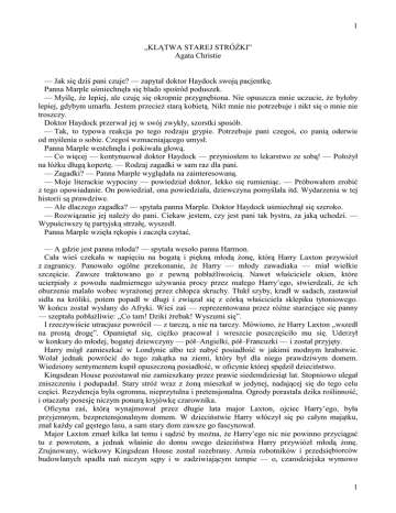 1 „KLĄTWA STAREJ STRÓśKI” Agata Christie — Jak się dziś pani czuje? — zapytał doktor Haydock swoją pacjentkę. Panna Marple uśmiechnęła się blado spośród poduszek. — Myślę, Ŝe lepiej, ale czuję się okropnie przygnębiona. Nie opuszcza mnie uczucie, Ŝe byłoby lepiej, gdybym umarła. Jestem przecieŜ starą kobietą. Nikt mnie nie potrzebuje i nikt się o mnie nie troszczy. Doktor Haydock przerwał jej w swój zwykły, szorstki sposób. — Tak, to typowa reakcja po tego rodzaju grypie. Potrzebuje pani czegoś, co panią oderwie od myślenia o sobie. Czegoś wzmacniającego umysł. Panna Marple westchnęła i pokiwała głową. — Co więcej — kontynuował doktor Haydock — przyniosłem to lekarstwo ze sobą! — PołoŜył na łóŜku długą kopertę. — Rodzaj zagadki w sam raz dla pani. — Zagadki? — Panna Marple wyglądała na zainteresowaną. — Moje literackie wypociny — powiedział doktor, lekko się rumieniąc. — Próbowałem zrobić z tego opowiadanie. On powiedział, ona powiedziała, dziewczyna pomyślała itd. Wydarzenia w tej historii są prawdziwe. — Ale dlaczego zagadka? — spytała panna Marple. Doktor Haydock uśmiechnął się szeroko. — Rozwiązanie jej naleŜy do pani. Ciekaw jestem, czy jest pani tak bystra, za jaką uchodzi. — Wypuściwszy tę partyjską strzałę, wyszedł. Panna Marple wzięła rękopis i zaczęła czytać. — A gdzie jest panna młoda? — spytała wesoło panna Harmon. Cała wieś czekała w napięciu na bogatą i piękną młodą Ŝonę, którą Harry Laxton przywiózł z zagranicy. Panowało ogólne przekonanie, Ŝe Harry — młody zawadiaka — miał wielkie szczęście. Zawsze traktowano go z pewną pobłaŜliwością. Nawet właściciele okien, które ucierpiały z powodu nadmiernego uŜywania procy przez małego Harry’ego, stwierdzali, Ŝe ich oburzenie malało wobec wyraŜonej przez chłopca skruchy. Tłukł szyby, kradł w sadach, zastawiał sidła na króliki, potem popadł w długi i związał się z córką właściciela sklepiku tytoniowego. W końcu został wysłany do Afryki. Wieś zaś — reprezentowana przez róŜne starzejące się panny — szeptała pobłaŜliwie: „Co tam! Dziki źrebak! Wyszumi się”. I rzeczywiście utracjusz powrócił — z tarczą, a nie na tarczy. Mówiono, Ŝe Harry Laxton „wszedł na prostą drogę”. Opamiętał się, cięŜko pracował i wreszcie poszczęściło mu się. Uderzył w konkury do młodej, bogatej dziewczyny — pół–Angielki, pół–Francuzki — i został przyjęty. Harry mógł zamieszkać w Londynie albo teŜ nabyć posiadłość w jakimś modnym hrabstwie. Wolał jednak powrócić do tego zakątka na ziemi, który był dla niego prawdziwym domem. Wiedziony sentymentem kupił opuszczoną posiadłość, w oficynie której spędził dzieciństwo. Kingsdean House pozostawał nie zamieszkany przez prawie siedemdziesiąt lat. Stopniowo ulegał zniszczeniu i podupadał. Stary stróŜ wraz z Ŝoną mieszkał w jedynej, nadającej się do tego celu części. Rezydencja była ogromna, nieprzytulna i pretensjonalna. Ogrody porastała dzika roślinność, i otaczały posesję niczym ponurą kryjówkę czarownika. Oficyna zaś, którą wynajmował przez długie lata major Laxton, ojciec Harry’ego, była przyjemnym, bezpretensjonalnym domem. W dzieciństwie Harry włóczył się po całym majątku, znał kaŜdy cal gęstego lasu, a sam stary dom zawsze go fascynował. Major Laxton zmarł kilka lat temu i sądzić by moŜna, Ŝe Harry’ego nic nie powinno przyciągać tu z powrotem, a jednak właśnie do domu swego dzieciństwa Harry przywiózł młodą Ŝonę. Zrujnowany, wiekowy Kingsdean House został rozebrany. Armia robotników i przedsiębiorców budowlanych spadła nań niczym sępy i w zadziwiającym tempie — o, czarodziejska wymowo 1 2 pieniądza! — nowy, biały dom zajaśniał wśród drzew. Następnie przybyła ekipa ogrodników, po niej zaś przedefilowały cięŜarówki z meblami. Dom był gotów. Wynajęto słuŜbę. Wreszcie elegancka limuzyna przywiozła Harry’ego i panią Laxton przez frontowe drzwi. Pani Price, właścicielka największego domu w okolicy, uwaŜająca się za inspiratorkę Ŝycia towarzyskiego w miejscowości, rozesłała karty z zaproszeniami na przyjęcie, „aby poznać pannę młodą”. Cała wieś pospieszyła z wizytą. Było to wielkie wydarzenie. Z tej okazji niektóre damy nawet szyły sobie nowe suknie. Wszyscy byli podnieceni, niecierpliwi, ciekawi poznać tę fantastyczną osobę. Wszystko wyglądało jak w bajce! Panna Harmon, ogorzała, krzepka stara panna, wyrzuciła z siebie pytanie, przeciskając się przez zatłoczone wejście do salonu. Mała, chuda, zawsze skwaszona panna Brent nerwowo udzieliła informacji: — Och, moja droga, ona jest po prostu urocza. Ma takie dobre maniery. I jakŜe młodziutka. Wiesz, budzi się w człowieku nutka zazdrości na widok osoby, która posiada wszystko — urodę, pieniądze, znakomite pochodzenie. Nie ma w niej nic, absolutnie nic pospolitego — i drogi Harry taki oddany! — Och — westchnęła panna Harmon — to dopiero pierwsze dni! Cienki nos panny Brent drgnął znacząco. — Och, moja droga, czy naprawdę uwaŜasz… — Wszyscy wiemy, jaki jest Harry — odparła panna Harmon. — Wiemy, jaki był! Spodziewam się, Ŝe teraz… — Ach — przerwała panna Harmon — męŜczyźni się nie zmieniają. Oszust zawsze pozostanie oszustem. Znam ich. — O mój BoŜe, biedne, młode stworzenie. — Panna Brent wyglądała teraz na o wiele szczęśliwszą. — Przypuszczam, Ŝe będzie miała z nim kłopoty. Ktoś naprawdę powinien ją ostrzec. Zastanawiam się, czy słyszała coś o tej historii? Nie jest w porządku, jeśli nic o tym nie wie. To przecieŜ Ŝenujące. Szczególnie, Ŝe w miasteczku jest tylko jedna apteka. Od pewnego czasu córka właściciela trafiki była Ŝoną pana Edge’a, miejscowego aptekarza. — Byłoby 