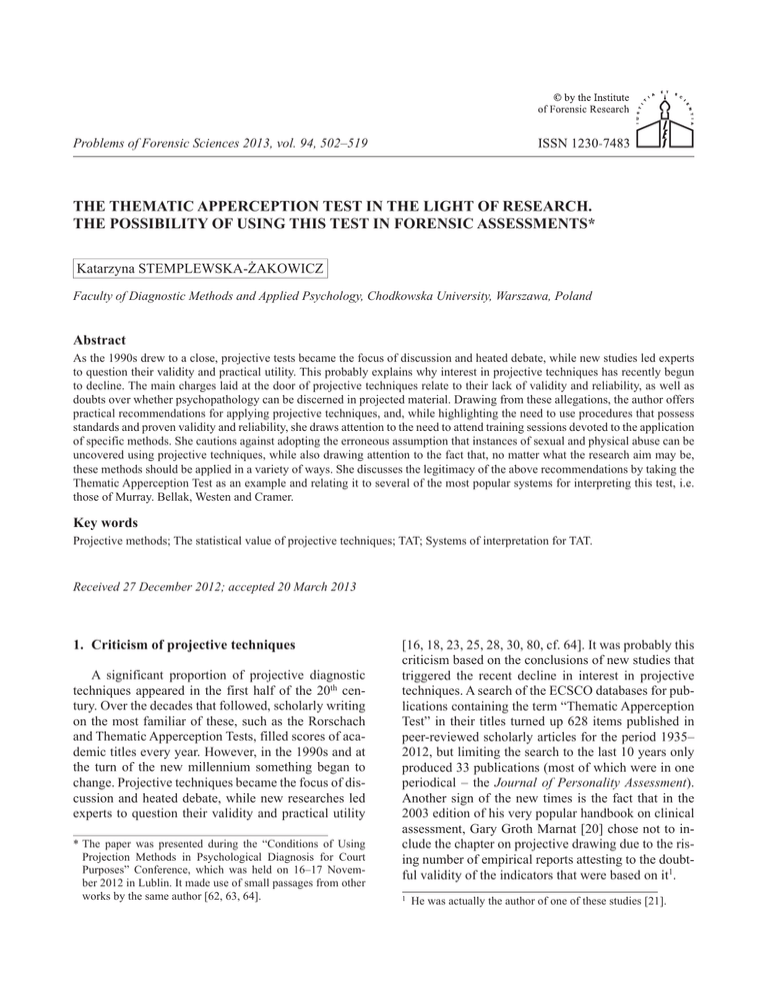 Problems of Forensic Sciences 2013, vol. 94, 502–519 The Thematic Apperception Test in the light of research. The Possibility of using this test in forensic assessments* Katarzyna Stemplewska-Żakowicz Faculty of Diagnostic Methods and Applied Psychology, Chodkowska University, Warszawa, Poland Abstract As the 1990s drew to a close, projective tests became the focus of discussion and heated debate, while new studies led experts to question their validity and practical utility. This probably explains why interest in projective techniques has recently begun to decline. The main charges laid at the door of projective techniques relate to their lack of validity and reliability, as well as doubts over whether psychopathology can be discerned in projected material. Drawing from these allegations, the author offers practical recommendations for applying projective techniques, and, while highlighting the need to use procedures that possess standards and proven validity and reliability, she draws attention to the need to attend training sessions devoted to the application of specific methods. She cautions against adopting the erroneous assumption that instances of sexual and physical abuse can be uncovered using projective techniques, while also drawing attention to the fact that, no matter what the research aim may be, these methods should be applied in a variety of ways. She discusses the legitimacy of the above recommendations by taking the Thematic Apperception Test as an example and relating it to several of the most popular systems for interpreting this test, i.e. those of Murray. Bellak, Westen and Cramer. Key words Projective methods; The statistical value of projective techniques; TAT; Systems of interpretation for TAT. Received 27 December 2012; accepted 20 March 2013 1.Criticism of projective techniques A significant proportion of projective diagnostic techniques appeared in the first half of the 20th century. Over the decades that followed, scholarly writing on the most familiar of these, such as the Rorschach and Thematic Apperception Tests, filled scores of academic titles every year. However, in the 1990s and at the turn of the new millennium something began to change. Projective techniques became the focus of discussion and heated debate, while new researches led experts to question their validity and practical utility *The paper was presented during the “Conditions of Using Projection Methods in Psychological Diagnosis for Court Purposes” Conference, which was held on 16–17 November 2012 in Lublin. It made use of small passages from other works by the same author [62, 63, 64]. [16, 18, 23, 25, 28, 30, 80, cf. 64]. It was probably this criticism based on the conclusions of new studies that triggered the recent decline in interest in projective techniques. A search of the ECSCO databases for publications containing the term “Thematic Apperception Test” in their titles turned up 628 items published in peer-reviewed scholarly articles for the period 1935– 2012, but limiting the search to the last 10 years only produced 33 publications (most of which were in one periodical – the Journal of Personality Assessment). Another sign of the new times is the fact that in the 2003 edition of his very popular handbook on clinical assessment, Gary Groth Marnat [20] chose not to include the chapter on projective drawing due to the rising number of empirical reports attesting to the doubtful validity of the indicators that were based on it. He was actually the author of one of these studies [21]. The Thematic Apperception Test in the light of research. The possibility of using this test in forensic assessments The main charges critics [30, 80] have aimed at projective techniques are in fact their lack of validity and reliability. Instead of these, impression-based interpretations are used that are not related to any standards, because as a rule such standards do not actually exist. For a long time, the objection has also been raised that psychopathology is being discerned in projected material and moreover, that the greater the quantity of projected material a given person “produces”, the more disturbances are effectively being “identified” in him. Bernard [52], in principle an advocate rather than one of the critics of projective techniques, cautioned against drawing such an erroneous inference. Due to the aforementioned weaknesses, projective techniques lack incremental validity, i.e. there is no observable improvement in the validity of a complete assessment after additional data from a projective technique have been made available for it [15]. Since it is clear that projective techniques cannot – in view of the aforementioned flaws – lead to valid conclusions, their application in psychological assessment should, in the opinion of their critics, be regarded as questionable. So what is to be done? 2.Practical recommendations for applying projective techniques As far as the tendency to overestimate psychopathology is concerned, it is very possible that it is “in the eye of the beholder” and it would be prudent to regard this as one of the errors of informal diagnostic inference that Meehl [42] cautioned against. The remedy advised for this is for the diagnostician to extract herself from sole reliance on her experience or clinical intuition, and to base her diagnostic judgements on the confirmation – or non-confirmation – of the presence of “hard” indicators of psychopathology. Only, what indicators may we regard as “hard”? By way of response, Garb, Wood, Lilienfield and Nezworski [16] formulated three conditions which an indicator should meet in order for it to form the basis of a responsible ruling on psychopathology. These conditions are as follows: 1.the indicator must be clearly linked to a given disorder, trait or syndrome; 2.the data proving this should be attained in methodologically sound studies; 3.the results should be independently replicat