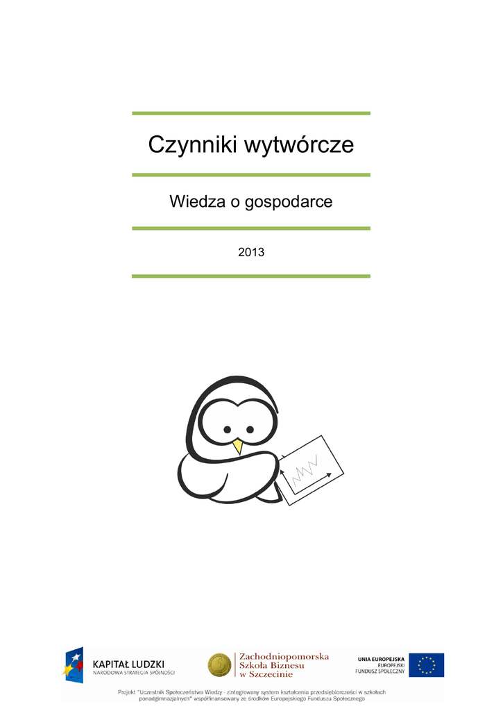 Czynniki wytwórcze Wiedza o gospodarce 2013 Czynniki wytwórcze Spis treści 1. Wstęp ............................................................................................................................. 3 2. Zasoby naturalne............................................................................................................ 5 3. Zasoby Ludzkie .............................................................................................................. 5 4. Zasoby kapitałowe.......................................................................................................... 5 5. Zasoby nienamacalne .................................................................................................... 6 6. Podsumowanie ............................................................................................................... 8 7. Literatura ........................................................................................................................ 8 2 Czynniki wytwórcze 1. Wstęp Posiadanie określonych zasobów, zarówno w przedsiębiorstwie, jak i w gospodarstwie domowym, potrzebne jest w celu wytworzenia produkcji bądź uzyskania określonej użyteczności. Produkcja potrzebna jest po to, aby zaspokoić potrzeby materialne i niematerialne. Niestety, poziom zasobów jest ograniczony. Problem ograniczoności zasobów, przed którym stoi każde społeczeństwo, jest problemem znaczącym i złożonym. Dysponując zasobami trzeba podejmować decyzje, jak mają one być używane. Trzeba również podejmować decyzje, w jakich ilościach zasoby te będą produkowane. Podczas tej lekcji dowiesz się, jakie zasoby wyróżniamy, jakie one mają znaczenie w produkcji, a także na czym polega alokacja zasobów. Permanentną cechą otaczającego nas świata jest ograniczoność zasobów, którą inaczej nazywamy rzadkością. Rzadkość zasobów oznacza, że zawsze jest ich zbyt mało, żeby zaspokoić wszystkie nasze potrzeby. Ekonomia jest nauką, dzięki której próbujemy zrozumieć zjawisko ograniczoności otaczających nas zasobów, jak również w najlepszy możliwy sposób radzić sobie z tym problemem. Problem rzadkości zasobów dotyczy wszystkich. Teorie ekonomiczne próbują wyjaśniać problem rzadkości, zarówno w życiu codziennym, na gruncie dylematów pojedynczych jednostek (każdego z nas), a także przedsiębiorstw w ich decyzjach gospodarczych, jak również - całych gospodarek. Można powiedzieć, że ekonomia jest nauką o gospodarowaniu ograniczonymi (rzadkimi) zasobami. Cele gospodarowania wynikają z potrzeb ludzkich. Człowiek odczuwa niezliczoną ilość potrzeb, które pragnie zaspokoić. Są to m.in. potrzeby ekonomiczne, które mają podstawowe znaczenie i stanowią bezpośredni impuls do gospodarowania, a ludzie gospodarując - osiągają swoje cele życiowe. Zaspokajanie potrzeb jest naturalnym celem działalności gospodarczej ludzi. Zaspokajanie potrzeb odbywa się w warunkach ograniczeń rzadkości. To oznacza, że występowanie danego dobra nie jest wystarczające, aby zaspokoić wszystkie potrzeby każdej osoby. Potrzeby są impulsem do działań, których efektem jest produkcja, czyli wyroby i usługi. To one stanowią siłą napędową gospodarowania. Dla producenta celem gospodarowania jest maksymalizacja zysku z prowadzonej przez niego działalności gospodarczej. Dla konsumenta celem gospodarowania jest maksymalizacja użyteczności z nabywanych przez niego dóbr czy usług. Jak widać, zarówno pojedyncze jednostki ludzkie, jak i przedsiębiorstwa, realizują pewien bardzo ważny dla siebie cel: próbują w warunkach ograniczoności zasobów dążyć do maksymalizacji właściwego dla siebie efektu. Klasycznym celem każdego przedsiębiorstwa jest maksymalizacja zysku. Oznacza to, że w procesie gospodarowania, używając ograniczonych zasobów, dąży ono do osiągnięcia możliwie największego efektu. Jest nim zysk, czyli różnica między przychodami uzyskanymi ze sprzedaży wyprodukowanych przez przedsiębiorstwo dóbr i usług a poniesionymi przez nie kosztami. Z kolei każdy z nas, pełniąc na rynku rolę konsumenta, również dąży do maksymalizacji właściwego dla siebie efektu i również dzieje się to w warunkach ograniczonych zasobów. Dążenie do maksymalizacji użyteczności oznacza, że każda jednostka ludzka stara się uzyskać możliwie jak najwyższy poziom zadowolenia (satysfakcji) z zakupu i konsumpcji danego dobra lub usługi. 3 Czynniki wytwórcze Gospodarowanie zawsze związane jest z niepewnością. Oznacza to, że środowisko, w jakim funkcjonuje przedsiębiorstwo, może dawać szanse na zysk lub zagrażać poniesieniem przez nie straty. To oznacza, że firma zawsze ponosi ryzyko ekonomiczne. Przedsiębiorstwo gospodarujące zasobami charakteryzuje się trzema cechami: wyodrębnieniem ekonomicznym (alienacją), wyodrębnieniem prawnym, wyodrębnieniem techniczno-organizacyjnym. Wyodrębnienie ekonomiczne jest jednym z podstawowych warunków istnienia gospodarki towarowo-pieniężnej i funkcjonowania przedsiębiorstw. Oznacza ono przede wszystkim, że przedsiębiorstwo ma odrębność, reprodukuje zużywane zasoby, a dochody pracowników przedsiębiorstwa zależne są od wyników produkcyjnych. Odrębność prawna oznacza, że firma jest zdolna do zawierania umów, zaciągania kredytów bankowych itp. Oznacza również, że firma jest zarejestrowana w odpowiednim rejestrze, w zależności od przyjętej formy prawnej działalności. Odrębność techniczno-organizacyjna oznacza, że firma tworzy jedną spójną całość, posiada własną strukturę organizacyjną i podporządkowana jest zazwyczaj jednemu szefowi. Zaspokajanie potrzeb, zarówno materialnych, jak i niematerialnych, zawsze wymaga podjęcia określonych działań i posiadania określonych zasobów. Zasoby te przekształcane są w trakcie procesów produkcyjnych w dobra i usługi. Niestety, rzadkość zasobów często uniemo