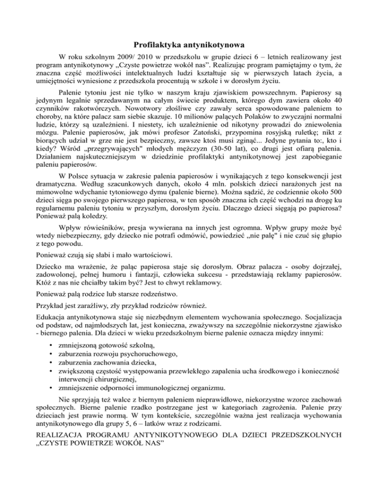Profilaktyka antynikotynowa W roku szkolnym 2009/ 2010 w przedszkolu w grupie dzieci 6 – letnich realizowany jest program antynikotynowy „Czyste powietrze wokół nas”. Realizując program pamiętajmy o tym, że znaczna część możliwości intelektualnych ludzi kształtuje się w pierwszych latach życia, a umiejętności wyniesione z przedszkola procentują w szkole i w dorosłym życiu. Palenie tytoniu jest nie tylko w naszym kraju zjawiskiem powszechnym. Papierosy są jedynym legalnie sprzedawanym na całym świecie produktem, którego dym zawiera około 40 czynników rakotwórczych. Nowotwory złośliwe czy zawały serca spowodowane paleniem to choroby, na które palacz sam siebie skazuje. 10 milionów palących Polaków to zwyczajni normalni ludzie, którzy są uzależnieni. I niestety, ich uzależnienie od nikotyny prowadzi do zniewolenia mózgu. Palenie papierosów, jak mówi profesor Zatoński, przypomina rosyjską ruletkę; nikt z biorących udział w grze nie jest bezpieczny, zawsze ktoś musi zginąć... Jedyne pytania to:, kto i kiedy? Wśród „przegrywających" młodych mężczyzn (30-50 lat), co drugi jest ofiarą palenia. Działaniem najskuteczniejszym w dziedzinie profilaktyki antynikotynowej jest zapobieganie paleniu papierosów. W Polsce sytuacja w zakresie palenia papierosów i wynikających z tego konsekwencji jest dramatyczna. Według szacunkowych danych, około 4 mln. polskich dzieci narażonych jest na mimowolne wdychanie tytoniowego dymu (palenie bierne). Można sądzić, że codziennie około 500 dzieci sięga po swojego pierwszego papierosa, w ten sposób znaczna ich część wchodzi na drogę ku regularnemu paleniu tytoniu w przyszłym, dorosłym życiu. Dlaczego dzieci sięgają po papierosa? Ponieważ palą koledzy. Wpływ rówieśników, presja wywierana na innych jest ogromna. Wpływ grupy może być wtedy niebezpieczny, gdy dziecko nie potrafi odmówić, powiedzieć „nie palę" i nie czuć się głupio z tego powodu. Ponieważ czują się słabi i mało wartościowi. Dziecko ma wrażenie, że paląc papierosa staje się dorosłym. Obraz palacza - osoby dojrzałej, zadowolonej, pełnej humoru i fantazji, człowieka sukcesu - przedstawiają reklamy papierosów. Któż z nas nie chciałby takim być? Jest to chwyt reklamowy. Ponieważ palą rodzice lub starsze rodzeństwo. Przykład jest zaraźliwy, zły przykład rodziców również. Edukacja antynikotynowa staje się niezbędnym elementem wychowania społecznego. Socjalizacja od podstaw, od najmłodszych lat, jest konieczna, zważywszy na szczególnie niekorzystne zjawisko - biernego palenia. Dla dzieci w wieku przedszkolnym bierne palenie oznacza między innymi: zmniejszoną gotowość szkolną, zaburzenia rozwoju psychoruchowego, zaburzenia zachowania dziecka, zwiększoną częstość występowania przewlekłego zapalenia ucha środkowego i konieczność interwencji chirurgicznej, • zmniejszenie odporności immunologicznej organizmu. • • • • Nie sprzyjają też walce z biernym paleniem nieprawidłowe, niekorzystne wzorce zachowań społecznych. Bierne palenie rzadko postrzegane jest w kategoriach zagrożenia. Palenie przy dzieciach jest prawie normą. W tym kontekście, szczególnie ważna jest realizacja wychowania antynikotynowego dla grupy 5, 6 – latków wraz z rodzicami. REALIZACJA PROGRAMU ANTYNIKOTYNOWEGO DLA DZIECI PRZEDSZKOLNYCH „CZYSTE POWIETRZE WOKÓŁ NAS” Instytuty Matki i Dziecka oraz Onkologii na zlecenie Ministerstwa Zdrowia opracowały 10 zaleceń strategicznych, które, uwzględnione w programach nauczania, pozwalają na osiągnięcie pozytywnych rezultatów w zakresie wdrażania i kształtowania postaw dzieci i młodzieży wobec palenia papierosów. W zaleceniach zwrócono uwagę na potrzebę realizacji programu antynikotynowego na różnych poziomach edukacji, biorąc też pod uwagę najstarszą grupę przedszkolaków. Program opracowany został przez zespól lekarzy, pedagogów, psychologów, socjologa z Instytutu Matki i Dziecka, Centrum Onkologii w Warszawie oraz Uniwersytetu Łódzkiego. Założenia programu: 1. Program jest adresowany do dzieci przedszkolnych - najstarszej grupy przedszkolaków. 2. Stanowi kolejne ogniwo w cyklu programów antynikotynowych (istnieją dla szkoły podstawowej). 3. Program ma charakter profilaktyczny, ale przede wszystkim ma na celu wykształcenie u dzieci świadomej umiejętności radzenia sobie w sytuacjach, w których inne osoby palą przy nich papierosy. Cele szczegółowe programu: 1. Umiejętności określania różnych źródeł dymu. 2. Umiejętności określania przyczyn wydobywania się różnych dymów, „wydobycie" dymu papierosowego. 3. Uwrażliwienie dzieci na szkodliwość dymu papierosowego. 4. Uświadomienie skutków palenia papierosów. 5. Uwrażliwienie dzieci na miejsca, w których mogą być narażone na dym. 6. Radzenie sobie z innymi palącymi. Strukturę programu stanowi pięć scenariuszy zajęć. Poszczególne zajęcia skoncentrowane są na pobudzeniu oraz stymulowaniu różnych form aktywności dziecka i zabawy twórczej, grupowej, konstrukcyjnej. Zajęcia mają charakter warsztatowy. Ta forma dostarcza dzieciom najwięcej okazji do uczenia się przez doświadczenie. W pracy uwzględniono następujące aspekty pracy warsztatowej: metody aktywizujące( wycieczka, burza mózgów, drama) praca w małych grupach( aktywizowanie dzieci nieśmiałych, trening asertywności)wspierająca rola nauczyciela. Literatura: Program antynikotynowy dla dzieci w wieku przedszkolnym „Czyste powietrze wokół nas”. Opracowała Elżbieta Łukomska