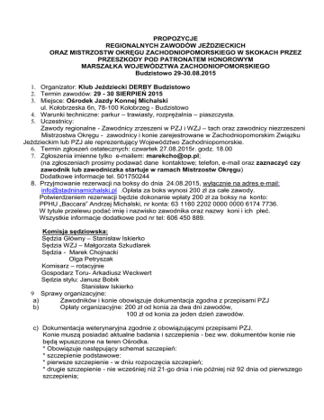 PROPOZYCJE REGIONALNYCH ZAWODÓW JEŹDZIECKICH ORAZ MISTRZOSTW OKRĘGU ZACHODNIOPOMORSKIEGO W SKOKACH PRZEZ PRZESZKODY POD PATRONATEM HONOROWYM MARSZAŁKA WOJEWÓDZTWA ZACHODNIOPOMORSKIEGO Budzistowo 29-30.08.2015 1. Organizator: Klub Jeździecki DERBY Budzistowo 2. Termin zawodów: 29 - 30 SIERPIEŃ 2015 3. Miejsce: Ośrodek Jazdy Konnej Michalski ul. Kołobrzeska 6n, 78-100 Kołobrzeg - Budzistowo 4. Warunki techniczne: parkur – trawiasty, rozprężalnia – piaszczysta. 5. Uczestnicy: Zawody regionalne - Zawodnicy zrzeszeni w PZJ i WZJ – tach oraz zawodnicy niezrzeszeni Mistrzostwa Okręgu - zawodnicy i konie zarejestrowane w Zachodniopomorskim Związku Jeździeckim lub PZJ ale reprezentujący Województwo Zachodniopomorskie. 6. Termin zgłoszeń ostatecznych: czwartek 27.08.2015r. godz. 18.00 7. Zgłoszenia imienne tylko e-mailem: [email protected]; (na zgłoszeniach prosimy podawać dane kontaktowe; telefon, e-mail oraz zaznaczyć czy zawodnik lub zawodniczka startuje w ramach Mistrzostw Okręgu) Dodatkowe informacje tel. 501750244 8. Przyjmowanie rezerwacji na boksy do dnia 24.08.2015, wyłącznie na adres e-mail: [email protected] .Opłata za boks wynosi 200 zł za całe zawody. Potwierdzeniem rezerwacji będzie dokonanie wpłaty 200 zł za boksy na konto: PPHU „Baccara” Andrzej Michalski, nr konta: 63 1160 2202 0000 0000 6174 7736. W tytule przelewu podać imię i nazwisko zawodnika oraz nazwy koni i ich płeć. Wszystkie informacje dodatkowe pod nr tel: 606 450 889. Komisja sędziowska: Sędzia Główny – Stanisław Iskierko Sędzia WZJ – Małgorzata Szkudlarek Sędzia - Marek Chojnacki Olga Petryszak Komisarz – rotacyjnie Gospodarz Toru- Arkadiusz Weckwert Sędzia stylu: Janusz Bobik Stanisław Iskierko 9 Sprawy organizacyjne: a) Zawodników i konie obowiązuje dokumentacja zgodna z przepisami PZJ b) Opłaty organizacyjne: 200 zł od konia za dwa dni zawodów, 100 zł od konia za jeden dzień zawodów. c) Dokumentacja weterynaryjna zgodnie z obowiązującymi przepisami PZJ. Konie muszą posiadać aktualne badania i szczepienia - bez ww. dokumentów konie nie będą wpuszczone na teren Ośrodka. * Obowiązuje następujący schemat szczepień: * szczepienie podstawowe: * pierwsze szczepienie - w dniu rozpoczęcia szczepień; * drugie szczepienie - nie wcześniej niż 21-go dnia i nie później niż 92 dnia od pierwszego szczepienia; d) e) f) g) h) i) j) * szczepienie przypominające: co 6 miesięcy od ostatniego szczepienia (jest dopuszczalny 21 dniowy okres karencji); * żadne szczepienie przypominające nie może się odbyć później niz na 7 dni przed przybyciem na zawody. Organizator nie ponosi żadnej odpowiedzialności w razie wypadków, zachorowań zawodników, członków ekip i koni, jak również w przypadku kradzieży, zniszczeń, pożarów i innych zdarzeń, zarówno w czasie zawodów jak i w trakcie transportu na i z zawodów. Zgłaszając się na zawody zawodnik, luzak zobowiązuje się do noszenia bezpiecznego, trzypunktowego nakrycia głowy, każdorazowo dosiadając konia, Każda zmiana na listach startowych po wydrukowaniu 30 zł. Zgodnie z regulaminem B PZJ 2015 – koń sześcioletni lub starszy, może startować w konkursach do klasy L1 włącznie, trzykrotnie w ciągu dnia, z zachowaniem zasady maksymalnej liczby dwóch startów w jednym konkursie. Zakwaterowanie zawodników we własnym zakresie. Organizator zastrzega sobie prawo do zmian w programie zawodów. W dniu 29.08 (sobota) o godz. 20.00 organizator zaprasza na bankiet z okazji 20-lecia Ośrodka Jazdy Konnej Michalski. 10. Odprawa techniczna: sobota 29.08.2015 godz. 09.30 Program zawodów: Sobota 29.08.2015 godz. 10,00 Konkurs nr 1: Towarzyski - Tylko kuce. wys.50-60 cm - dokładności bez rozgrywki art.238.1.1 Dla startujących w MO Młodzików- konkurs „na styl jeźdźca” - półfinał Konkurs nr 2: Towarzyski – mini LL wys. 70-80 cm – dokładności z trafieniem w normę czasu. Dla JM na kucach w ramach MO - konkurs „na styl jeźdźca” - półfinał Konkurs nr 3: klasa L ( wys. 100cm) – dokładności z trafieniem w normę czasu. Dla JM w ramach MO konkurs na styl jeźdźca - półfinał Konkurs nr 4: klasa P (wys. 110 cm.) zwykły (art. 238.2.1) Dla Juniorów w ramach MO, konkurs półfinałowy Konkurs nr 5: klasa N (wys. 120 cm) zwykły (art. 238.2.1) Dla MJ w ramach MO, konkurs półfinałowy Konkurs nr 6: klasa C (wys. 130 cm) zwykły (art. 238.2.1) Dla Seniorów w ramach MO, konkurs półfinałowy Niedziela 30.08.2015 godz. 9.00 Konkurs nr 7: Towarzyski - Tylko kuce. Wys. 60-70 cm - dokładności bez rozgrywki art.238.1.1 Dla startujących w MO Młodzików - konkurs „ na styl jeźdźca” - finał Konkurs nr 8: Towarzyski – mini LL wys. 70-80 cm – z trafieniem w normę czasu. Dla JM w ramach MO konkurs „na styl jeźdźca” - finał Konkurs nr 9: klasa L (wys. 100 cm) - z trafieniem w normę czasu. Dla JM w ramach MO konkurs „na styl jeźdźca - finał Konkurs nr 10: klasa P1 (wys. 115 cm) zwykły (art. 238.2.1). Dla Juniorów w ramach MO konkurs finałowy Konkurs nr 11: klasa N1 (wys. 125 cm) zwykły (art. 238.2.1). Dla MJ w ramach MO konkurs finałowy Konkurs nr 12: klasa C1 (wys. 135 cm) zwykły z rozgrywką – art.238.2.2 Dla Seniorów w ramach MO konkurs finałowy Podział nagród Konkurs I m-ce 1, 2, 7, 8 3, 9 4, 10 5, 11 6, 12 200 250 300 500 II mce 150 200 250 300 III mIV m-ce ce nagrody rzeczowe 100 80 150 100 200 150 250 200 V m-ce Sum a 50 70 100 150 1160 1540 2000 2800 Pula nagród pieniężnych 7500,00 Dla Medalistów MO we wszystkich kategoriach wiekowych puchary i medale, derki dla mistrzów, oraz nagrody pieniężne: 1. Młodzi Jeźdźcy: 1 miejsce – 500 zł, 2 miejsce – 300 zł, 3 miejsce – 200 zł. 2. Seniorzy: 1 miejsce – 1000 zł, 2 miejsce – 600 zł, 3 miejsce – 400 zł. KODEKS POSTĘPOWANIA Z KONIEM Polski Związek Jeździecki oczekuje od wszystkich osób zaangażowanych w sport jeździecki respektowania wydanego przez PZJ 