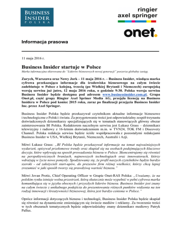 Business Insider P O L S K A Informacja prasowa 11 maja 2016 r. Business Insider startuje w Polsce Marka informacyjna skierowana do “Liderów biznesowych nowej generacji” poszerza globalny zasięg. Zurych, Warszawa oraz Nowy Jork – 11 maja 2016 r. – Business Insider, wiodąca marka cyfrowa przekazująca informacje dla środowiska biznesowego na całym świecie zadebiutuje w Polsce z kolejną, trzecią (po Wielkiej Brytanii i Niemczech) europejską wersją serwisu już jutro, 12 maja 2016 roku, o godzinie 9:30. Polska wersja serwisu Business Insider będzie dostępna pod adresem www.businessinsider.com.pl. Grupa Onet.pl, część grupy Ringier Axel Spriner Media AG, przejęła licencję na Business Insidera w Polsce pod koniec 2015 roku, zaraz po finalizacji przejęcia Business Insider Inc. przez Axel Springer. Business Insider Polska będzie przekazywał czytelnikom aktualne informacje biznesowe i technologiczne z Polski i świata. Za przygotowanie treści jest odpowiedzialny zespół trzynastu doświadczonych dziennikarzy specjalizujących się w tematach stanowiących główny obszar zainteresowania BI Polska. Redaktorem naczelnym serwisu jest Łukasz Grass – dziennikarz telewizyjny i radiowy z 16-letnim doświadczeniem m.in. w TVN24, TOK FM i Discovery Channel. Polska redakcja serwisu będzie ściśle współpracowała z pozostałymi redakcjami Business Insider w USA, Wielkiej Brytanii, Niemczech, Australii i Azji. Mówi Łukasz Grass: „BI Polska będzie przekazywał informacje na temat najważniejszych wydarzeń, opisywał przełomowe trendy oraz skupiał się na osobach podejmujących kluczowe decyzje, które wpływają na sposób prowadzenia biznesu w Polsce. Skoncentrujemy się również na perspektywicznych branżach, najnowszych technologiach oraz innowatorach, którzy wdrażają w życie nowe pomysły. Spodziewamy się, że profil naszych czytelników będzie bardzo szeroki - od założycieli start-upów, do prezesów firm różnej wielkości, którzy chcą lepiej zrozumieć w jaki sposób tworzy się prawdziwą wartość biznesu.” Mówi Jovan Protic, Chief Operating Officer w Grupie Onet-RAS Polska: „Uważamy, że na polskim rynku istnieje wolna przestrzeń, którą skutecznie może wypełnić w pełni cyfrowa marka komunikująca się w języku obecnych i przyszłych liderów biznesu. Business Insider jest znany na całym świecie z unikalnego podejścia do prezentowania różnych punktów widzenia na ten rodzaj innowacji i kreatywności biznesowej, która jest bardzo ceniona w Polsce.” Oprócz informacji dotyczących biznesu i technologii, Business Insider Polska będzie skupiał się również na dynamicznie zmieniającym się świecie mediów i reklamy. Za tworzenie treści w tych obszarach tematycznych będzie odpowiedzialny znany dziennikarz mediowy Patryk Pallus. Business Insider P O L S K A Informacja prasowa Mówi Mark Dekan, Chief Executive Officer Ringier Axel Springer Media AG oraz CEO Grupy Onet-RAS Polska: „Specjalizujemy się w cyfrowych mediach i posiadamy silne dziennikarskie DNA, dlatego wprowadzenie Business Insider Polska na tak ważny rynek jest dla nas milowym krokiem, a Business Insider Polska będzie kolejną silną pozycją, którą dostarczymy naszym czytelnikom. Bardzo cieszy mnie również perspektywa współpracy z Business Insider oraz ich zespołami redakcyjnymi na całym świecie.” Business Insider jest wiodącym portalem informacyjnym w USA i jedną z najszybciej rozwijających się marek informacyjnych na świecie. Firma jest pionierem w dostarczaniu wiadomości biznesowych dostosowanych do cyfrowych mediów – udostępnianych w czasie rzeczywistym, dostosowanych do świata mediów społecznościowych i dostępnych w wersji mobilnej. Według Google Analytics, z sieci portali Business Insider korzysta w sumie 94 milionów unikalnych użytkowników miesięcznie. Mówi Henry Blodget, Redaktor Naczelny oraz CEO Business Insider: „Jesteśmy zachwyceni tym, że uruchamiamy dziewiątą międzynarodową wersję portalu właśnie w Polsce - jednym z kluczowych rynków w Europie. Grupa Onet-RAS Polska doskonale rozumie cyfrową przestrzeń i jest idealnym partnerem, który będzie wspierał nas w dostarczeniu do Polski informacji biznesowych w taki sposób, w jaki oczekuje tego nasza grupa docelowa.” *** O Business Insider Business Insider Inc. jest wydawcą Business Insider, Tech Insider, oraz dziewięciu międzynarodowych edycji Business Insider. Wprowadzony na rynek w 2007 roku, Business Insider jest największym portalem informacyjno-biznesowym w USA i jedną z najszybciej rozwijających się marek informacyjnych na świecie. Według Google Analytics sieć portali Business Insider dociera w sumie do 94 milionów unikalnych użytkowników miesięcznie. Firma jest pionierem w dostarczaniu wiadomości biznesowych dostosowanych do cyfrowych mediów i kierowanych do liderów biznesowych nowej generacji. Tech Insider został wprowadzony w lipcu 2015. Wprowadzanie marki Insider, pierwszej lifestylowej marki należąca do firmy jest planowane w tym miesiącu. Business Insider oferuje również dostępną abonamentowo usługę badawczą Business Insider Intelligence (BII), która dostarcza szczegółową wiedzę, dane oraz analizy dotyczące cyfrowego świata w kontekście m.in. ecommerce, płatności, technologii mobilnych, mediów społecznościowych, „Internetu Rzeczy” (IoT) oraz Fintech. Business Insider jest również gospodarzem dorocznej konferencji IGNITION, która jest jedną z najbardziej wpływowych konferencji w branży technologicznej.Business Insider Inc. jest spółką należącą do Axel Springer SE. Business Insider P O L S K A Informacja prasowa O Ringier Axel Springer Media AG Ringier Axel Springer Media AG został utworzony w 2010 przez szwajcarskiego Swiss Ringier AG oraz Niemieckiego Axel Springer SE i skupia aktywności obu akcjonariuszy w centralnej i zachodniej Europie. Firma prowadzi działalności na d