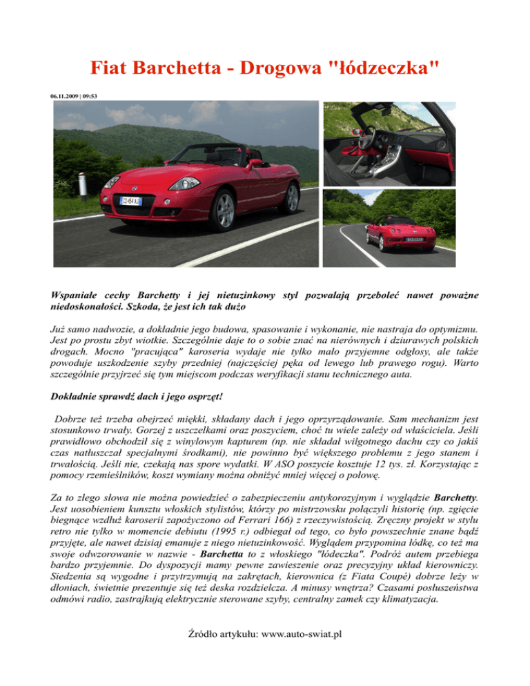 wybijają się sworznie wahaczy oraz zużywają amortyzatory. Pomimo niedoróbek Barchetta to auto