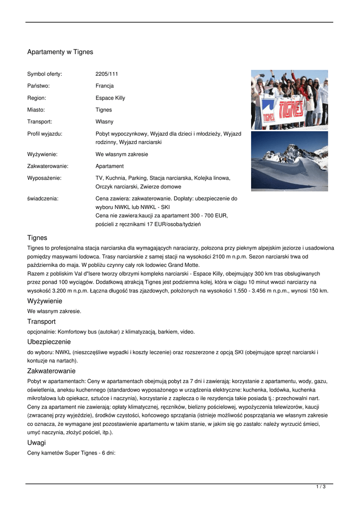 Apartamenty w Tignes Symbol oferty: 2205/111 Państwo: Francja Region: Espace Killy Miasto: Tignes Transport: Własny Profil wyjazdu: Pobyt wypoczynkowy, Wyjazd dla dzieci i młodzieży, Wyjazd Wyżywienie: We własnym zakresie Zakwaterowanie: Apartament Wyposażenie: TV, Kuchnia, Parking, Stacja narciarska, Kolejka linowa, świadczenia: Cena zawiera: zakwaterowanie. Dopłaty: ubezpieczenie do rodzinny, Wyjazd narciarski Orczyk narciarski, Zwierze domowe wyboru NWKL lub NWKL - SKI Cena nie zawiera:kaucji za apartament 300 - 700 EUR, pościeli z ręcznikami 17 EUR/osoba/tydzień Tignes Tignes to profesjonalna stacja narciarska dla wymagających naraciarzy, połozona przy pieknym alpejskim jeziorze i usadowiona pomiędzy masywami lodowca. Trasy narciarskie z samej stacji na wysokości 2100 m n.p.m. Sezon narciarski trwa od października do maja. W pobliżu czynny cały rok lodowiec Grand Motte. Razem z pobliskim Val d"lsere tworzy olbrzymi kompleks narciarski - Espace Killy, obejmujący 300 km tras obsługiwanych przez ponad 100 wyciągów. Dodatkową atrakcją Tignes jest podziemna kolej, która w ciągu 10 minut wwozi narciarzy na wysokość 3.200 m n.p.m. Łączna długość tras zjazdowych, położonych na wysokości 1.550 - 3.456 m n.p.m., wynosi 150 km. Wyżywienie We własnym zakresie. Transport opcjonalnie: Komfortowy bus (autokar) z klimatyzacją, barkiem, video. Ubezpieczenie do wyboru: NWKL (nieszczęśliwe wypadki i koszty leczenie) oraz rozszerzone z opcją SKI (obejmujące sprzęt narciarski i kontuzje na nartach). Zakwaterowanie Pobyt w apartamentach: Ceny w apartamentach obejmują pobyt za 7 dni i zawierają: korzystanie z apartamentu, wody, gazu, oświetlenia, aneksu kuchennego (standardowo wyposażonego w urządzenia elektryczne: kuchenka, lodówka, kuchenka mikrofalowa lub opiekacz, sztućce i naczynia), korzystanie z zaplecza o ile rezydencja takie posiada tj.: przechowalni nart. Ceny za apartament nie zawierają: opłaty klimatycznej, ręczników, bielizny pościelowej, wypożyczenia telewizorów, kaucji (zwracanej przy wyjeździe), środków czystości, końcowego sprzątania (istnieje możliwość posprzątania we własnym zakresie co oznacza, że wymagane jest pozostawienie apartamentu w takim stanie, w jakim się go zastało: należy wyrzucić śmieci, umyć naczynia, złożyć pościel, itp.). Uwagi Ceny karnetów Super Tignes - 6 dni: 1/3 Terminy 04.12-11.12 i 11.12-18.12 Nasza cena 150 EUR Terminy 22.04-01.05 Nasza cena 160 EUR Do karnetu konieczne zdjęcie. Zwrotna kaucja za karnet 3 EUR. Za dodatkową opłatą (38,50 - terminy grudniowe lub 44,50 EUR - termin kwietniowy) możliwość jazdy na obszarze Espace Killy (Tignes + Val d"Isere). Cena nie obejmuje obowiązkowej kaucji zwrotnej za apartament: 300 -700 EUR, opłaty klimatycznej 0,70 EUR/dzień/os., ręcznik + pościel: 17 EUR/tydz./os., środków czystości, TV 40 EUR/tydz. Przy dokwaterowaniu: kaucja w wysokości 50 EUR. Dokwaterowanie Zalecamy kupno całych apartamentów. W przypadku mniejszej ilości zakupionych miejsc w apartamencie, należy liczyć się z dokwaterowaniem obcej osoby. Przy rezerwacji na dokwaterowaniu nalezy wybrać pobyt w obiekcie: dokwaterowanie. Tereny narciarskie: różnica poziomów:1850-3650 m n.p.m. łączna długość tras ponad 300 km Liczba tras: 125 w tym: bardzo trudnych: 11 trudnych: 36 łatwych: 59 bardzo łatwych: 19 Wyciągi: 100 w tym: 2 kolejki podziemne, 4 kolejki linowe, 4 gondole, 50 krzesełkowych, 40 orczykowych. Armatki śnieżne 225 Trasy biegowe 44km 2 lodowce w tym całoroczny Grand Motte - 3600 m n.p.m. Dla snowbordzistów: Stacja narciarska Tignes przygotowała dla snowbordzistów najlepsze na świecie tereny narciarskie. Ale największą atrakcją są tereny do jazdy poza wyznaczonymi trasami obsługiwany przez wyciągi. Jazda między drzewami z lodowca do Le Fornet, trasy z wyciągu Grand Pré ze strony Bellevarde do wyciągu krzesełkowego Manchet. Liczne trasy dla snowboardzistów wokół Bellevarde (La Daille) i w La Combe du Mont Blanc. Przyjazd i wyjazd: zakwaterowanie w sobotę o godz. 17:00 wykwaterowanie do godz. 10:00 Samochód Miejsce do parkowanie, możliwość wynajmu garażu. Samolot - transfery "door to door" Dodatkowo świadczymy usługę transferu "door to door" - "od drzwi do drzwi" oraz przelot samolotem do apartamentów w Tignes. Autokar, mikrobus, transfery "door to door" Nowością w naszej ofercie jest usługa "door to door" - "od drzwi do drzwi" - usługa zapewniająca transfer i transport bezpośrednio z domu do apartamentów w Tignes. TERMINY: od: 2018-01-14 do: 2018-01-21 (8 dni), miejsca: sprawdź miejsca cena od: 553 PLN = 127 EUR od: 2018-01-14 do: 2018-01-28 (15 dni), miejsca: sprawdź miejsca cena od: 1456 PLN = 334 EUR 2/3 od: 2018-01-21 do: 2018-01-28 (8 dni), miejsca: sprawdź miejsca cena od: 902 PLN = 207 EUR od: 2018-01-21 do: 2018-02-04 (15 dni), miejsca: sprawdź miejsca cena od: 1883 PLN = 432 EUR od: 2018-01-28 do: 2018-02-04 (8 dni), miejsca: sprawdź miejsca cena od: 981 PLN = 225 EUR od: 2018-01-28 do: 2018-02-11 (15 dni), miejsca: sprawdź miejsca cena od: 1961 PLN = 450 EUR od: 2018-02-04 do: 2018-02-11 (8 dni), miejsca: sprawdź miejsca cena od: 981 PLN = 225 EUR od: 2018-02-04 do: 2018-02-18 (15 dni), miejsca: sprawdź miejsca cena od: 1883 PLN = 432 EUR od: 2018-02-11 do: 2018-02-18 (8 dni), miejsca: sprawdź miejsca cena od: 902 PLN = 207 EUR CENNIK: Długość pobytu: 15 dni 8 dni 8 dni 15 dni 15 dni 8 dni Grupa cenowa: F F E E B B 4800 2880 1440 348 199.8 99.9 1893.6 1058.4 529.2 3000 1749.6 874.8 1185.6 648 324 1392 799.2 399.6 3864 2138.4 1069.2 1185.6 648 324 2736 1620 810 Pobyt w obiekcie (do wyboru) (*) apartament 5-pokojowy dla 12 osób standardowo dla osób: 12 5232 2616 2400 osoba na dokwaterowaniu w apartamencie - mężczyzna 411 205.5 174 apart.2 pok.5/6 osobowy standardowo dla osób: 6 minimalnie: 5 2304 1152 946.8 apartament 3-pokojowy dla 7-8 osób standardowo dla osób: 8 minimalnie: 7 3