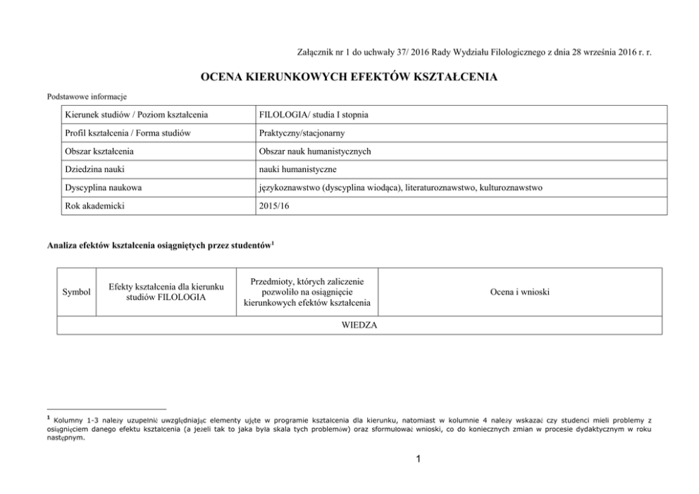 Załącznik nr 1 do uchwały 37/ 2016 Rady Wydziału Filologicznego z dnia 28 września 2016 r. r. OCENA KIERUNKOWYCH EFEKTÓW KSZTAŁCENIA Podstawowe informacje Kierunek studiów / Poziom kształcenia FILOLOGIA/ studia I stopnia Profil kształcenia / Forma studiów Praktyczny/stacjonarny Obszar kształcenia Obszar nauk humanistycznych Dziedzina nauki nauki humanistyczne Dyscyplina naukowa językoznawstwo (dyscyplina wiodąca), literaturoznawstwo, kulturoznawstwo Rok akademicki 2015/16 Analiza efektów kształcenia osiągniętych przez studentów1 Symbol Efekty kształcenia dla kierunku studiów FILOLOGIA Przedmioty, których zaliczenie pozwoliło na osiągnięcie kierunkowych efektów kształcenia Ocena i wnioski WIEDZA 1 Kolumny 1-3 należy uzupełnić uwzględniając elementy ujęte w programie kształcenia dla kierunku, natomiast w kolumnie 4 należy wskazać czy studenci mieli problemy z osiągnięciem danego efektu kształcenia (a jeżeli tak to jaka była skala tych problemów) oraz sformułować wnioski, co do koniecznych zmian w procesie dydaktycznym w roku następnym. 1 K_W01 Ma podstawową wiedzę o miejscu i znaczeniu kształcenia filologicznego w kontekście nauk humanistycznych, o specyfice kształcenia filologicznego, którego celem jest osiągnięcie poziomu językowego na poziomie C1 i kompetencji interkulturowej Łacina Praktyka zawodowa PNJA Historia literatury angielskiej i amerykańskiej/niemieckiej Historia W.Brytanii i USA/Historia Niemiec WOKAJ/PNJN/PNJR/ Metodologia badań i pisanie prac naukowo- badawczych/ Tłumaczenie ustne rozmów handlowych/ Tłumaczenie pisemne korespondencji i tekstów ekonomicznych/ Komunikacja interpersonalna/ Praktyka Historia Wielkiej Brytanii i USA: Bardzo trudno dokonać jest oceny osiągnięcia konkretnego efektu kształcenia przez studentów przede wszystkim z powodu poziomu językowego studentów; pomimo upraszczania języka na wykładach istnieje prawdopodobieństwo, że wiele osób może nie rozumieć (całości lub części) wykładów Historia Niemiec: wykład realizowany w dużej mierze w języku polskim z powodu braku dostatecznej znajomości języka. Efekty w odniesieniu do zrozumienia treści, informacji, interpretacji problemów osiągnięty. Historia literatury niemieckiej: wykład realizowany w języku polskim i niemieckim, na ćwiczeniach tylko język niemiecki, ćwiczenia połączone z problemową dyskusją na temat utworu i interpretacją pozwalają n zrozumienie znaczenia utworu w kontekście epoki 2 K_W02 Zna podstawową terminologię z dziedziny językoznawstwa, językoznawstwa stosowanego, kulturoznawstwa, literaturoznawstwa w obrębie filologii angielskiej lub germańskiej Łacina PNJA Gramatyka opisowa (fonetyka i fonologia) Gramatyka opisowa (składnia i morfologia) Historia literatury angielskiej i amerykańskiej/niemieckiej Historia W. Brytanii i USA WOKAOJ PNJN/ Metodologia badań i pisanie prac naukowo- badawczych Seminarium dyplomowe PNJA/ PNJN: student ma pełną wiedzę nt. podsystemów języka w 6 semestrze. Sprawność mówienia i pisania różnych form, potwierdzająca wiedzę o języku, znajomość leksyki i struktur, systematycznie jest rozwijana na poszczególnych etapach i osiąga poziom zbliżony do C1 w 6 semestrze. Gramatyka opisowa: Duży odsetek studentów nie poradził sobie z opanowaniem specjalistycznej terminologii, tym bardziej, że były to terminy w języku obcym. Ograniczenie ilości terminów, komentarze i opisy mogą pomóc uniknąć tego typu problemów. Rozkład procentowy ocen 3-5 wskazuje, że zdecydowana większość studentów ma uporządkowaną wiedzę szczegółową z zakresu fonetyki artykulacyjnej języka angielskiego. W przyszłości studenci dla których osiągnięcie tego efektu jest szczególnie trudne powinni częściej uczestniczyć w indywidualnych konsultacjach z wykładowcą. W celu lepszej oceny osiągnięcia efektu przez studentów należy rozważyć wprowadzenie dodatkowej metody oceny: oceny aktywności studentów podczas zajęć. Historia literatury angielskiej: Znaczna część studentów zapoznała się z podstawową terminologią z zakresu literaturoznawstwa amerykańskiego; Część studentów, która miała z tym problemy, posiada nieuporządkowaną wiedzę z zakresu literaturoznawstwa angielskiego i niski poziom znajomości języka angielskiego. Historia literatury niemieckiej: jw Seminarium dyplomowe: student rozumie podstawowe pojęcia i terminologię z dziedziny seminarium. K_W03 Ma podstawową wiedzę dotyczącą historii Wielkiej Brytanii, USA lub Republiki Federalnej Niemiec Historia W. Brytanii i USA WOKAOJ Większość studentów nie miała problemów z osiągnięciem tego efektu 3 K_W04 Ma podstawową uporządkowaną wiedzę z historii literatury Wielkiej Brytanii, USA lub Republiki Federalnej Niemiec w kontekście europejskiej historii i tradycji literackiej WOKAOJ/ Historia literatury angielskiej i amerykańskiej/niemieckiej Większość studentów nie miała problemów z osiągnięciem tego efektu Historia literatury angielskiej Studenci, którzy nie zaliczyli kursu nie posiadali wiedzy z zakresu europejskiej historii i tradycji literackiej z zajęć w szkole średniej, nie nadrobili braków we własnym zakresie, bądź nie uczęszczali na wykłady czy na zajęcia, na których takie zagadnienia były omawiane. Zamierzam wprowadzić ścisłą kontrole obecności na zajęciach z przedmiotu i nadal zachęcać do indywidualnych konsultacji w trakcie dyżuru dla osób chętnych do nadrobienia zaległości. Należy zachęcać studentów także do pracy nad językiem obcym, w którym prowadzone są wykłady i zajęcia. Historia literatury niemieckiej: studenci osiągnęli efekt, studenci poznali najważniejsze wydarzenia i kierunki w epokach literackich mające znaczenie dla rozwoju historii literatury niemieckojęzycznej 4 K_W05 Ma szczegółową wiedzę z historii literatury Wielkiej Brytanii, USA lub Republiki Federalnej Niemiec oraz wiedzę ni