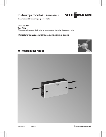 Instrukcja montażu i serwisu VIESMANN dla wykwalifikowanego personelu Vitocom 100 Typ GSM Zdalne nadzorowanie i zdalne sterowanie instalacji grzewczych Wskazówki dotyczące ważności, patrz ostatnia strona VITOCOM 100 5604 504 PL 5/2011 Proszę zachować! Wskazówki bezpieczeństwa Wskazówki dotyczące bezpieczeństwa Prosimy o dokładne przestrzeganie wskazówek bezpieczeństwa w celu wykluczenia ryzyka utraty zdrowia oraz powstania szkód materialnych. Objaśnienia do wskazówek bezpieczeństwa Niebezpieczeństwo Ten znak ostrzega przed niebezpieczeństwem zranienia. ! Uwaga Ten znak ostrzega przed stratami materialnymi i zanieczyszczeniem środowiska. ■ ustawowych przepisów o ochronie środowiska, ■ przepisów zrzeszeń zawodowo-ubezpieczeniowych, ■ stosownych przepisów bezpieczeństwa norm DIN, EN, DVGW, TRGI, TRF i VDE a ÖNORM, EN i ÖVE c SEV, SUVA, SVTI i SWKI. Prace przy instalacji Grupa docelowa Niniejsza instrukcja skierowana jest wyłącznie do wykwalifikowanego personelu. ■ Prace przy obiegu czynnika chłodniczego mogą wykonywać tylko uprawnieni do tego specjaliści. ■ Prace przy podzespołach elektrycznych mogą być wykonywane tylko przez wykwalifikowanych elektryków. ■ Pierwsze uruchomienie powinien przeprowadzić wykonawca instalacji lub wyznaczona przez niego osoba posiadająca odpowiednie uprawnienia. Przepisy Podczas prac należy przestrzegać ■ krajowych przepisów dotyczących instalacji, ■ przepisów dotyczących bezpieczeństwa i higieny pracy, 2 ■ Odłączyć instalację od źródła napięcia (np. za pomocą oddzielnego bezpiecznika lub wyłącznika głównego) i sprawdzić brak napięcia. Wskazówka Oprócz obwodu prądowego regulatora może istnieć kilka obwodów obciążeniowych. Niebezpieczeństwo Dotknięcie części przewodzących prąd może prowadzić do ciężkich obrażeń. Niektóre podzespoły na płytkach instalacyjnych przewodzą prąd nawet po wyłączeniu napięcia zasilania. Przed usunięciem osłon z urządzeń odczekać min. 4 minuty, aż napięcie spadnie. ■ Zabezpieczyć instalację przed ponownym włączeniem. 5604 504 PL Wskazówka Tekst oznaczony słowem Wskazówka zawiera dodatkowe informacje. Wskazówki bezpieczeństwa Wskazówki dotyczące bezpieczeństwa (ciąg dalszy) ! Uwaga Wyładowania elektrostatyczne mogą doprowadzić do uszkodzenia podzespołów elektronicznych. Przed rozpoczęciem prac należy dotknąć uziemionych obiektów, np. rur grzewczych i wodociągowych, w celu odprowadzenia ładunków statycznych. Prace naprawcze ! Uwaga Naprawa podzespołów spełniających funkcje zabezpieczające zagraża bezpiecznej eksploatacji instalacji. Uszkodzone części należy wymieniać na oryginalne części firmy Viessmann. Elementy dodatkowe, części zamienne i szybkozużywalne 5604 504 PL ! Uwaga Części zamienne i szybkozużywalne, które nie zostały sprawdzone wraz z instalacją, mogą zakłócić jej prawidłowe funkcjonowanie. Montaż niedopuszczonych elementów oraz dokonywanie bez zezwolenia zmian konstrukcyjnych mogą obniżyć bezpieczeństwo pracy instalacji i spowodować ograniczenie praw gwarancyjnych. Stosować wyłącznie oryginalne części zamienne firmy Viessmann lub części przez tę firmę dopuszczone. 3 Spis treści Spis treści Instrukcja montażu Bezpieczeństwo i odpowiedzialność................................................................ 6 Przygotowanie do montażu Wymogi systemowe............................................................................................. 8 Funkcje modułu Vitocom 100............................................................................... 9 Funkcje karty SIM................................................................................................. 10 Montaż Montaż modułu komunikacyjnego Vitocom 100................................................... Przegląd przyłączy elektrycznych........................................................................ Podłączanie modułu Vitocom 100........................................................................ Włączanie dodatkowych sygnałów....................................................................... Przyłącze elektryczne........................................................................................... 11 12 15 16 18 Instrukcja serwisowa Uruchomienie Warunki................................................................................................................ Wprowadzanie kodu PIN...................................................................................... Wkładanie karty SIM ........................................................................................... Wprowadzanie przez SMS................................................................................... 21 21 22 24 Konfiguracja Polecenia SMS z przykładem............................................................................... 28 Szczególne wskazówki dot. wysyłania wiadomości SMS.................................... 36 Kontrola stanu konta Ważność karty SIM.............................................................................................. 37 Diody LED Oznaczenie diod................................................................................................... 39 Natężenie pola (jakość odbioru)........................................................................... 39 Wskazanie wysyłki SMS....................................................................................... 39 Usuwanie usterek Znaczenie wzoru migotania diod.......................................................................... 40 Komunikaty o błędach.......................................................................................... 40 Poświadczenia Deklaracja zgodności........................................................................................... 44 4 5604 504 PL Dane techniczne...........................................................