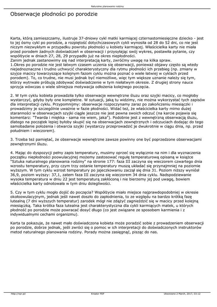 Naturalne planowanie rodziny Obserwacje płodności po porodzie Karta, którą zamieszczamy, ilustruje 37-dniowy cykl matki karmiącej czternastomiesięczne dziecko - jest to jej ósmy cykl po porodzie, a rozpiętość dotychczasowych cykli wynosiła od 28 do 52 dni, co nie jest niczym niezwykłym w przypadku powrotu płodności u kobiety karmiącej. Właścicielka karty nie miała przed porodem żadnych doświadczeń w obserwacji i przysyłając swój wykres, postawiła pytanie, czy współżycie w dniach 27, 28, 29 przypadło już na okres niepłodności. Zanim jednak zastanowimy się nad interpretacją karty, zwróćmy uwagę na kilka spraw. 1.Okres po porodzie nie jest łatwym czasem uczenia się obserwacji, ponieważ objawy często są wtedy niejednoznaczne i trudno uchwycić charakterystyczny dla rytmu płodności ich przebieg (np. zmiany w szyjce macicy towarzyszące kolejnym fazom cyklu można poznać o wiele łatwiej w cyklach przed porodem). To, co trudne, nie musi jednak być niemożliwe, więc tym większe uznanie należy się tym, którzy wytrwale próbują zdobywać doświadczenie w tym niełatwym okresie. Z drugiej strony nauce sprzyja wówczas o wiele silniejsza motywacja odłożenia kolejnego poczęcia. 2. W tym cyklu kobieta prowadziła tylko obserwacje wewnętrzne śluzu oraz szyjki macicy, co mogłoby wystarczyć, gdyby były one kompletne. W sytuacji, jaką tu widzimy, nie można wykorzystać tych zapisów dla interpretacji cyklu. Przypomnijmy: obserwacje rozpoczynamy zaraz po zakończeniu miesiączki i prowadzimy je szczególnie uważnie w fazie płodności. Widać też, że właścicielka karty mimo dużej staranności w obserwacjach szyjki ciągle jeszcze nie jest pewna swoich odczuć (na karcie pojawia się komentarz: "Twarda i miękka - sama nie wiem, jaka"). Podobnie jest z wewnętrzną obserwacją śluzu, dlatego na początek lepiej byłoby skupić się na obserwacjach zewnętrznych i odczuciach dodając do tego samobadanie położenia i otwarcia szyjki (wystarczy przeprowadzić je dwukrotnie w ciągu dnia, np. przed południem i wieczorem). 3. Trzeba też pamiętać, że obserwacje wewnętrzne zawsze powinny one być poprzedzone obserwacjami zewnętrznymi śluzu. 4. Mając do dyspozycji pełny zapis temperatury, musimy oprzeć się wyłącznie na nim i dla wyznaczenia początku niepłodności poowulacyjnej możemy zastosować regułę temperaturową opisaną w książce "Sztuka naturalnego planowania rodziny" na stronie 177: faza III zaczyna się wieczorem czwartego dnia wzrostu temperatury, przy czym trzy ostanie temperatury muszą układać się przynajmniej na poziomie wyższym. W tym cyklu wzrost temperatury po jajeczkowaniu zaczął się dnia 31. Poziom niższy wyniósł 36,9, poziom wyższy: 37,1, zatem faza III zaczyna się wieczorem 34 dnia cyklu. Nadspodziewanie wysoka temperatura w dniu 22 jest temperaturą zakłóconą i nie bierzemy jej pod uwagę, bowiem właścicielka karty odnotowała w tym dniu dolegliwości. 5. Czy w tym cyklu mogło dojść do poczęcia? Współżycie miało miejsce najprawdopodobniej w okresie okołoowulacyjnym, jednak jeśli nawet doszło do zapłodnienia, to ze względu na bardzo krótką fazę lutealną (7 dni wyższych temperatur) zarodek mógł nie zdążyć zagnieździć się w macicy przed kolejną miesiączką. Taka krótka faza lutealna jest charakterystyczna dla cykli karmiących matek, u których płodność po porodzie może powracać dosyć długo (co jest związane ze sposobem karmienia i z indywidualnymi cechami organizmu). Karta ta pokazuje, że nawet mało doświadczona kobieta może poradzić sobie z prowadzeniem obserwacji po porodzie, dobrze jednak, jeśli zwróci się o pomoc w ich interpretacji do doświadczonych instruktorów metod naturalnego planowania rodziny. Porady można zasięgnąć, pisząc do nas. http://npr.pl/ Kreator PDF Utworzono 2 March, 2017, 03:12