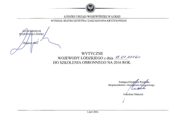 1. Wstęp 1.1 Wytyczne Wojewody Łódzkiego dla marszałków województw, starostów, wójtów, burmistrzów i prezydentów miast do szkolenia obronnego realizowanego w 2016 r., zwane dalej Wytycznymi, wydano na podstawie §13 ust. 3 pkt 1 Rozporządzenia Rady Ministrów z dnia 8 października 2015 r. w sprawie szkolenia obronnego (Dz. U. z 2015 r. poz. 1829), zwanego dalej Rozporządzeniem. 1.2 Wytyczne opracowano z uwzględnieniem postanowień następujących dokumentów: a) Wytycznych Ministra Obrony Narodowej dla ministrów i wojewodów do szkolenia obronnego w latach 2015 – 2020; b) Programu Szkolenia Obronnego Województwa Łódzkiego na lata 2013 – 2018. 1.3 Celem Wytycznych jest podsumowanie szkolenia obronnego w 2015 r. realizowanego przez jednostki samorządu terytorialnego, określenie głównych kierunków szkolenia obronnego realizowanego przez marszałka, starostów, wójtów, burmistrzów i prezydentów miast na 2016 r. oraz ustalenie sposobu ich osiągania. 2. Ocena realizacji szkolenia w 2015 r. 2.1 Ocenę realizacji szkolenia obronnego dokonano na podstawie, wyników kontroli kompleksowej desygnowanej przez Prezesa Rady Ministrów wykonywania zadań obronnych prowadzonych w jednostkach samorządu terytorialnego, wniosków z realizacji zasadniczych przedsięwzięć szkoleniowych z udziałem jednostek samorządu terytorialnego oraz uzgadnianych przez Wojewodę Łódzkiego projektów planów szkolenia obronnego. Z analizy dokumentów wynika, iż na potrzeby szkolenia opracowano trzyletnie Programy szkolenia obronnego oraz roczne plany szkolenia obronnego. Ich analiza wskazuje, że zostały opracowane poprawnie, zgodnie z wymogami rozporządzenia w sprawie szkolenia obronnego. 2.2 Z oceny dokumentów wynika, iż proces szkolenia obronnego w województwie łódzkim w 2015 r. zapewnił nabywanie umiejętności i podnoszenie kwalifikacji niezbędnych do wykonywania zadań obronnych oraz kierowania wykonywaniem tych zadań w sytuacji podwyższania gotowości obronnej państwa i w czasie wojny. 2 2.3 Realizację celów szkolenia na 2015 r. ocenia się na poziomie dobrym. Szkolenia ukierunkowane były na kontynuacje przygotowania kadry kierowniczej i zespołów zadaniowych (grup operacyjnych), wchodzących w skład stanowisk kierowania do działania w sytuacji wprowadzenia zadań ujętych w planach operacyjnych funkcjonowania jednostek administracji zespolonej i samorządu terytorialnego oraz zgrywanie wybranych elementów systemu obronnego w sytuacji podwyższenia gotowości obronnej państwa i w czasie wojny. 2.4 Do najważniejszych przedsięwzięć szkoleniowych należy zaliczyć ćwiczenie wojewódzkie obronne pk. „AGLOMERACJA-2015”, które realizowane było w ramach kontroli kompleksowej desygnowanej przez Prezesa Rady Ministrów. Jego celem priorytetowym oprócz sprawdzenia prawidłowości przyjętych rozwiązań w zakresie alarmowego uzupełnienia sił zbrojnych, było doskonalenie umiejętności kadry kierowniczej i grup zadaniowych wchodzących w skład Zespołu Kierowania Obronnością Województwa oraz stanowisk kierowania poszczególnych organów w tym doskonalenia metod zarządzania, koordynowania i kierowania realizacją zadań w wyższym stanie gotowości obronnej państwa czasu wojny oraz współdziałania z Terenowymi Organami Administracji Wojskowej. Ponadto w odniesieniu do przedsięwzięć organizowanych przez organy samorządu terytorialnego, sprawdzenie poziomu przygotowania organów i jednostek samorządu terytorialnego w ramach ćwiczeń powiatowych i treningów do funkcjonowania w wyższym stanie gotowości obronnej państwa. 2.5 Zwiększenie ilości przedsięwzięć szkoleniowych prowadzonych z wykorzystaniem praktycznych form szkolenia, wpłynęło na poprawę rzeczywistego przygotowania osób do wykonywania zadań i jednocześnie na podniesienie efektywności szkolenia obronnego. W roku 2015 na terenie województwa łódzkiego zrealizowano łącznie 6 ćwiczeń powiatowo-gminnych i 5 treningów akcji kurierskiej realizowanych przez jednostki samorządu terytorialnego. 2.6 Cele szkolenia obronnego przyjęte na 2015 r. były ukierunkowane na szkolenie zapewniające praktyczne przygotowanie kadry kierowniczej i zespołów zadaniowych (grup operacyjnych) do wykonywania zadań zawartych w planach operacyjnych funkcjonowania województwa, powiatu i gminy oraz na zgrywanie wybranych elementów systemu obronnego, ze szczególnym uwzględnieniem podsystemu kierowania obronnością w sytuacji podwyższania gotowości obronnej państwa i w czasie wojny. 2.7 Przebieg realizacji szkolenia obronnego w wytypowanych jednostkach organizacyjnych, podlegał ocenie przez zespół kontrolny Wojewody Łódzkiego w czasie prowadzonych kontroli problemowych ujętych w „Planie kontroli” w jednostkach organizacyjnych oraz w ramach kontroli 3 kompleksowej desygnowanej przez Prezesa Rady Ministrów. Do najczęstszych niedociągnięć w obszarze szkolenia obronnego należy: a) w organizowanych w powiecie szkoleniach pomija się wiele jednostek, głównie powiatowych służb, inspekcji i straży, które włączono w przygotowania obronne samorządu terytorialnego; b) tematyka szkolenia obronnego ma charakter zbyt ogólny, nie jest dostosowana do potrzeb jego uczestników, wynikających z ich miejsca i roli w całokształcie przygotowań obronnych powiatu lub gminy oraz jest powielana z roku na rok; c) w zdecydowanej większości skontrolowanych jednostek opracowano stosowne plany i programy szkolenia, przy czym ich zawartość to w dużej mierze treści skopiowane z rocznego planu szkolenia województwa łódzkiego; d) do przedsięwzięć szkoleniowych nie włącza się gminnych jednostek organizacyjnych, podział na grupy szkoleniowe jest zbyt mało przejrzysty i niekonsekwentny. 3. Zasadnicze cele szkoleniowe w 2016 r. 3.1 Głównym celem szkolenia obronnego przyjętym na rok 2016 jest przygotowanie kadry kierowniczej i zespołów zadaniowych, wchodzących w skład st