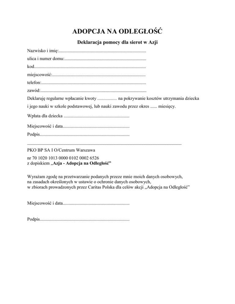 ADOPCJA NA ODLEGŁOŚĆ Deklaracja pomocy dla sierot w Azji Nazwisko i imię:............................................................................ ulica i numer domu:....................................................................... kod................................................................................................. miejscowość:................................................................................. telefon:........................................................................................... zawód:............................................................................................ Deklaruję regularne wpłacanie kwoty ................. na pokrywanie kosztów utrzymania dziecka i jego nauki w szkole podstawowej, lub nauki zawodu przez okres ...... miesięcy. Wpłata dla dziecka ......................................................... Miejscowość i data.......................................................... Podpis.............................................................................. ___________________________________________________________________ PKO BP SA I O/Centrum Warszawa nr 70 1020 1013 0000 0102 0002 6526 z dopiskiem „Azja - Adopcja na Odległość” Wyrażam zgodę na przetwarzanie podanych przeze mnie moich danych osobowych, na zasadach określonych w ustawie o ochronie danych osobowych, w zbiorach prowadzonych przez Caritas Polska dla celów akcji „Adopcja na Odległość” Miejscowość i data.......................................................... Podpis..............................................................................