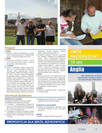 Program 1 DZIEŃ Wyjazd z miejsca zamieszkania w godzinach okołopołudniowych. Przejazd przez Niemcy, Holandię, Belgię do Francji. 2 DZIEŃ Przeprawa promowa Calais – Dover lub Eurotunel pod kanałem. Przejazd do Londynu. Zakwaterowanie. 3 – 8 DZIEŃ Londyn – zwiedzanie miasta z przewodnikiem, m.in. London Bridge, Katedra Southwark, Teatr Szekspirowski, Galeria Tate Modern, Millenium Bridge, Katedra St. Paul’s, Harrod’s, Galeria Narodowa, Buckingham Palace, Opactwo Westminsterskie, Domy Parlamentu z Wieżą Zegarową i Big Benem, Trafalgar Square, 10 Downing Street, Stajnie Królewskie, Tower of London, Tower Bridge, rejsik po Tamizie, London Eye, Piccadilly Circus, Leicester Square, China Town, SOHO, British Museum, Oxford Street, Muzeum Historii Naturalnej, Muzeum Madame Tussaud’s, Baker Street Muzeum Sherlocka Holmesa, akwarium, Covent Garden, Canary Wharf, Greenwich-południk „0”. Program zakłada również wycieczki do: Windsoru, połączony ze zwiedzaniem Zamku (pod nieobecność Krolowej) Oxfordu - wizyta w najwiekszym z College’y: Christ Church College oraz zwiedzanie miasta; całodzienna wycieczka do nadmorskiego kurortu Brighton – wizyta w orientalnym Pawilonie Królewskim, spacer po molo, plazowanie. Na terenie Ośrodka przewidywane są również gry i zabawy sportowe (piłka nożna, siatkówka…) 9 DZIEŃ Wykwaterowanie. W drodze powrotnej do domu zatrzymujemy się w miejscowości Canterbury- uważanej za najpiękniejsze średniowieczne miasto Anglii. Spacer główną ulicą przy górującej nad miastem XI wiecznej Katedrze, a na koniec ostatnie zakupy w supermarkecie. OBÓZ MŁODZIEŻOWY 10 dni Anglia PRZY GRUPIE MIN. 40 OSÓB, DODATKOWO 4 MIEJSCA GRATIS DLA NAUCZYCIELI-OPIEKUNÓW! 10 DZIEŃ Przyjazd na granicę polsko – niemiecką ok. godz. 09.00 Informacje dodatkowe PROPOZYCJA ZAWIERA przejazd autokarem klasy zachodniej przejazd Eurotunelem lub promem 7 śniadań, 7 obiadokolacji, (pakowane lunche na czas zwiedzania młodzież przygotowuje z prowiantu biura samodzielnie lub z pomocą opiekunów) 7 noclegów w Ośrodku Harcerskim, pokoje wieloosobowe, koniecznie własne śpiwory opiekę pilota pełniącego funkcję przewodnika ubezpieczenie w firmie AXA (10000 EUR KL, 2000 EUR NNW, 200 EUR bagaż) PROPOZYCJA NIE ZAWIERA biletów do zwiedzanych obiektów oraz komunikacji miejskiej ok. 80 f. dla dzieci do lat 16. WAŻNE godzinę wyjazdu określa organizator PROPOZYCJA DLA SZKÓŁ JĘZYKOWYCH www.voyage.pila.pl 19