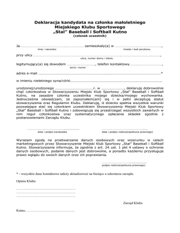 Deklaracja kandydata na członka małoletniego Miejskiego Klubu Sportowego „Stal” Baseball i Softball Kutno (członek uczestnik) Ja………………….………………..……….….… zamieszkały(a) w ………….……..…………………., imię i nazwisko miasto i kod pocztowy przy ulicy……………………………………………………………….……..…….………….….…..….…., ulica, numer domu i lokalu legitymujący(a) się dowodem ……..….……..……., telefon kontaktowy……..…….……………, seria i numer adres e-mail ………………………………………………………………………………………………………………………* w imieniu nieletniego syna/córki……………………………………………………………………………………….. urodzonej/urodzonego ……………………………………r. w ……………….….., deklaruję dobrowolnie chęć członkostwa w Stowarzyszeniu Miejski Klub Sportowy „Stal” Baseball i Softball Kutno, na zasadzie członka uczestnika mojego dziecka/mojego wychowanka. Jednocześnie oświadczam, że zapoznałem(am) się i w pełni akceptuję statut stowarzyszenia oraz Regulamin Klubu. Deklaruję, iż dziecko spełnia wszystkie warunki pozwalające stać się członkiem uczestnikiem Stowarzyszenia Miejski Klub Sportowy „Stal” Baseball i Softball Kutno i zobowiązuję się przestrzegać wszystkich zawartych w nim reguł członkostwa oraz systematycznego opłacania składek zgodnie z postanowieniami Zarządu Klubu. ……………………………................... data i podpis kandydata ………………………………....... data i podpis rodzica(opiekuna prawnego) Wyrażam zgodę na przetwarzanie danych osobowych oraz wizerunku w celach marketingowych przez Stowarzyszenie Miejski Klub Sportowy „Stal” Baseball i Softball Kutno. Stowarzyszenie informuje, że zgodnie z art. 24 ust. 1 pkt 4 ustawy o ochronie danych osobowych, podanie danych jest dobrowolne, a ponadto każdemu przysługuje prawo wglądu do swoich danych oraz ich poprawiania. ……………………...................... podpis rodzica(opiekuna prawnego) * - wszystkie dane kontaktowe należy aktualizować na bieżąco u sekretarza zarządu. Opinia Klubu: …………………………………………… …………………………………………… …………………………………………… Zarząd Klubu Kutno, …………………………………...