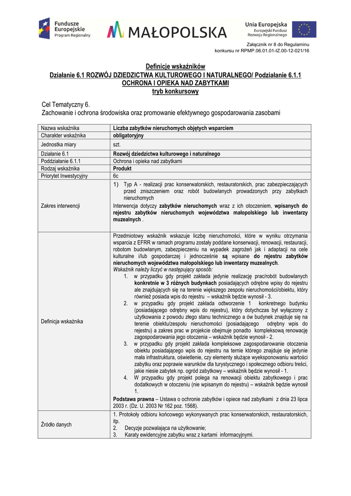 Załącznik nr 8 do Regulaminu konkursu nr RPMP.06.01.01-IZ.00-12-021/16 Definicje wskaźników Działanie 6.1 ROZWÓJ DZIEDZICTWA KULTUROWEGO I NATURALNEGO/ Podziałanie 6.1.1 OCHRONA I OPIEKA NAD ZABYTKAMI tryb konkursowy Cel Tematyczny 6. Zachowanie i ochrona środowiska oraz promowanie efektywnego gospodarowania zasobami Nazwa wskaźnika Charakter wskaźnika Liczba zabytków nieruchomych objętych wsparciem obligatoryjny Jednostka miary szt. Działanie 6.1 Poddziałanie 6.1.1 Rodzaj wskaźnika Priorytet Inwestycyjny Rozwój dziedzictwa kulturowego i naturalnego Ochrona i opieka nad zabytkami Produkt 6c 1) Typ A - realizacji prac konserwatorskich, restauratorskich, prac zabezpieczających przed zniszczeniem oraz robót budowlanych prowadzonych przy zabytkach nieruchomych Interwencja dotyczy zabytków nieruchomych wraz z ich otoczeniem, wpisanych do rejestru zabytków nieruchomych województwa małopolskiego lub inwentarzy muzealnych . Zakres interwencji Definicja wskaźnika Źródło danych Przedmiotowy wskaźnik wskazuje liczbę nieruchomości, które w wyniku otrzymania wsparcia z EFRR w ramach programu zostały poddane konserwacji, renowacji, restauracji, robotom budowlanym, zabezpieczeniu na wypadek zagrożeń jak i adaptacji na cele kulturalne i/lub gospodarczej i jednocześnie są wpisane do rejestru zabytków nieruchomych województwa małopolskiego lub inwentarzy muzealnych. Wskaźnik należy liczyć w następujący sposób: 1. w przypadku gdy projekt zakłada jedynie realizację prac/robót budowlanych konkretnie w 3 różnych budynkach posiadających odrębne wpisy do rejestru ale znajdujących się na terenie większego zespołu nieruchomości/obiektu, który również posiada wpis do rejestru – wskaźnik będzie wynosił - 3. 2. w przypadku gdy projekt zakłada odtworzenie 1 konkretnego budynku (posiadającego odrębny wpis do rejestru), który dotychczas był wyłączony z użytkowania z powodu złego stanu technicznego a ów budynek znajduje się na terenie obiektu/zespołu nieruchomości (posiadającego odrębny wpis do rejestru) a zakres prac w projekcie obejmuje ponadto kompleksową renowację zagospodarowania jego otoczenia – wskaźnik będzie wynosił - 2. 3. w przypadku gdy projekt zakłada kompleksowe zagospodarowanie otoczenia obiektu posiadającego wpis do rejestru na ternie którego znajduje się jedynie mała infrastruktura, oświetlenie, czy elementy służące wyeksponowaniu wartości zabytku oraz poprawie warunków dla turystycznego i społecznego odbioru treści, jakie niesie zabytek np. ogród zabytkowy – wskaźnik będzie wynosił - 1. 4. W przypadku gdy projekt polega na renowacji obiektu zabytkowego i prac dodatkowych w otoczeniu (nie wpisanym do rejestru) – wskaźnik będzie wynosił 1. Podstawa prawna – Ustawa o ochronie zabytków i opiece nad zabytkami z dnia 23 lipca 2003 r. (Dz. U. 2003 Nr 162 poz. 1568). 1. Protokoły odbioru końcowego wykonywanych prac konserwatorskich, restauratorskich, itp. 2. Decyzje pozwalająca na użytkowanie; 3. Karaty ewidencyjne zabytku wraz z kartami informacyjnymi. Nazwa wskaźnika Charakter wskaźnika Jednostka miary Liczba zabytków ruchomych objętych wsparciem obligatoryjny szt. Działanie 6.1 Rozwój dziedzictwa kulturowego i naturalnego Poddziałanie 6.1.1 Ochrona i opieka nad zabytkami Rodzaj wskaźnika Priorytet Inwestycyjny Produkt 6.c Typ A - realizacji prac konserwatorskich, restauratorskich, prac zabezpieczających przed zniszczeniem przy zabytkach ruchomych Interwencja dotyczy zabytków ruchomych będących elementem szerszego zakresu wsparcia w ramach danego projektu, wpisanych do rejestru zabytków ruchomych województwa małopolskiego lub wpis do inwentarzy muzealnych lub narodowego zasobu bibliotecznego lub narodowego zasobu archiwalnego. Zakres interwencji Przedmiotowy wskaźnik wskazuje liczbę obiektów ruchomych, które w wyniku otrzymania wsparcia z EFRR w ramach programu zostały zachowane, zdigitalizowane, zrewaloryzowane, poddane konserwacji, renowacji, restauracji, zabezpieczeniu na wypadek zagrożeń i jednocześnie wpisanych do rejestru zabytków ruchomych województwa małopolskiego lub do inwentarzy muzealnych lub narodowego zasobu bibliotecznego lub narodowego zasobu archiwalnego. Definicja wskaźnika Wskaźnik należy liczyć w następujący sposób: W przypadku ujęcia obiektów w rejestrze zbioru zabytków, inwentarzy muzealnych, narodowego zasobu bibliotecznego czy archiwalnego, należy podać szczegółową liczbę jego konkretnych elementów, które zostały zrewitalizowane, zachowane, zdigitalizowane, zrewaloryzowane, poddane konserwacji, renowacji, restauracji, zabezpieczone na wypadek zagrożeń w wyniku otrzymania wsparcia z programu. Przykład: Jeżeli pod jednym nr inwentarza muzealnego znajduje się kilka obiektów np. 10 szt. a wyniku wsparcia z projektu zabezpieczono 5 szt. – wskaźnik będzie wynosił 5 Podstawa prawna – Ustawa o ochronie zabytków i opiece nad zabytkami z dnia 23 lipca 2003 r. (Dz. U. 2003 Nr 162 poz. 1568). 1. Źródło danych 2. Nazwa wskaźnika Charakter wskaźnika Jednostka miary Działanie 6.1. Poddziałanie 6.1.1 Rodzaj wskaźnika Priorytet Inwestycyjny Zakres interwencji Definicja wskaźnika Protokoły odbioru końcowego wykonywanych prac restauratorskich; Karaty ewidencyjne zabytku wraz z kartami informacyjnymi. konserwatorskich, Wzrost oczekiwanej liczby odwiedzin w objętych wsparciem miejscach należących do dziedzictwa kulturowego i naturalnego oraz stanowiących atrakcje turystyczne obligatoryjny odwiedziny/rok Rozwój dziedzictwa kulturowego i naturalnego Ochrona i opieka nad zabytkami Rezultat bezpośredni 6.c Typ A - realizacji prac konserwatorskich, restauratorskich, prac zabezpieczających przed zniszczeniem oraz robót budowlanych prowadzonych przy zabytkach, Typ A i B rozwoju instytucji kultury oraz udostepnienia dziedzictwa kulturowego, Typ A - rozwoju szlaków turystycznych i rekreacyjnych w subregionach – SPR, Typ