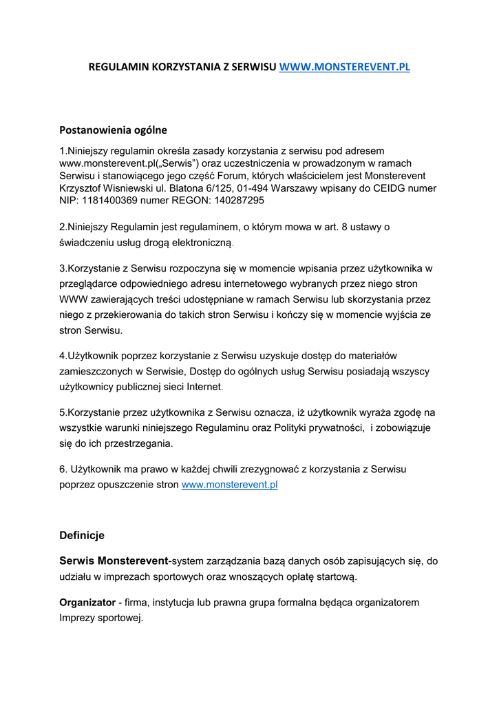 REGULAMIN KORZYSTANIA Z SERWISU WWW.MONSTEREVENT.PL Postanowienia ogólne 1.Niniejszy regulamin określa zasady korzystania z serwisu pod adresem www.monsterevent.pl(„Serwis”) oraz uczestniczenia w prowadzonym w ramach Serwisu i stanowiącego jego część Forum, których właścicielem jest Monsterevent Krzysztof Wisniewski ul. Blatona 6/125, 01-494 Warszawy wpisany do CEIDG numer NIP: 1181400369 numer REGON: 140287295 2.Niniejszy Regulamin jest regulaminem, o którym mowa w art. 8 ustawy o świadczeniu usług drogą elektroniczną. 3.Korzystanie z Serwisu rozpoczyna się w momencie wpisania przez użytkownika w przeglądarce odpowiedniego adresu internetowego wybranych przez niego stron WWW zawierających treści udostępniane w ramach Serwisu lub skorzystania przez niego z przekierowania do takich stron Serwisu i kończy się w momencie wyjścia ze stron Serwisu. 4.Użytkownik poprzez korzystanie z Serwisu uzyskuje dostęp do materiałów zamieszczonych w Serwisie, Dostęp do ogólnych usług Serwisu posiadają wszyscy użytkownicy publicznej sieci Internet. 5.Korzystanie przez użytkownika z Serwisu oznacza, iż użytkownik wyraża zgodę na wszystkie warunki niniejszego Regulaminu oraz Polityki prywatności, i zobowiązuje się do ich przestrzegania. 6. Użytkownik ma prawo w każdej chwili zrezygnować z korzystania z Serwisu poprzez opuszczenie stron www.monsterevent.pl Definicje Serwis Monsterevent-system zarządzania bazą danych osób zapisujących się, do udziału w imprezach sportowych oraz wnoszących opłatę startową. Organizator - firma, instytucja lub prawna grupa formalna będąca organizatorem Imprezy sportowej. Opłata startowa - kwota określona w regulaminie Imprezy sportowej przez Organizatora, którą wpłaca Uczestnik w zamian za możliwość wzięcia w niej udziału. Uczestnik – osoba która dokonała rejestracji w serwisie poprzez podanie wymaganych danych i zaakceptowała regulamin. Impreza sportowa - wydarzenie o charakterze sportowym, odbywające się na wolnym powietrzu lub w pomieszczeniu, posiadające organizatora i odrębny regulamin. Płatność elektroniczna - jedna z form dokonania opłaty startowej przez Uczestnika przy użyciu elektronicznych kanałów płatności obsługiwanych przez firmę Dotpay. Rejestracja- podanie w formularzu danych określonych przez organizatora danej imprezy. Wynik- Czas uzyskany przez uczestnika od momentu startu, do momentu przekroczenia linie mety. Możliwości dla użytkowników serwisu - rejestracja do imprez sportowych, - wgląd i możliwości edycji oraz usunięci danych osobowych - dokonywanie płatności za pomocą serwisów płatności elektronicznej, - prezentacja wyników imprez sportowych 1. Użytkownik który zamierza korzystać z serwisu Monsterevent winien zarejestrować się, podając swoje dane osobowe oraz dane niezbędne do udziału w imprezie sportowej lub zalogować się do systemu za pomocą otrzymanych danych od administarora. 2. W procesie rejestracji Użytkownik potwierdza poprawność podanych przez siebie informacji i wyraża zgodę na warunki zawarte w niniejszym regulaminie. 3. Po prawidłowym zalogowaniu Użytkownik ma prawo zmieniać hasło dostępu do portalu. 4. W przypadku zapomnienia hasła Użytkownik może skorzystać z opcji resetu hasła. 5. Po prawidłowej rejestracji w serwisie użytkownik otrzyma link aktywacyjny, który zostanie wysłany na podany adres @ podczas zgłoszenia. 6. Po dokonaniu prawidłowej rejestracji w serwisie Monsterevent, użytkownik będzie miał możliwość zapisania się do udziału we wszystkich aktualnie otwartych imprezach. 7.Użytkownik po zalogowaniu się do serwisu Monsterevent, będzie miał możliwość wglądu do regulaminów danych imprez, wyboru formy płatności oraz wglądu w wyniki zakończonych już wydarzeń. Płatności elektroniczne 1. Zakończenie procesu rejestracji do Imprezy sportowej skieruje Użytkownika do formularza płatność elektronicznych z podaną, właściwą kwotą do zapłaty. 2. Formularz płatności elektronicznych obsługiwany jest przez firmę Dotpay na podstawie odrębnego regulaminu i prowadzony jest w oparciu o bezpieczne połączenie szyfrowane. 3. Prawidłowo przeprowadzona operacja płatności zostanie potwierdzona mailem, a zgłoszenie Użytkownika do Imprezy sportowej będzie oznaczone jako opłacone. Wynik 1. Wyniki imprez sportowych przekazywane są organizatorowi imprezy oraz zamieszczane na stronie serwisu www.monsterevent.pl 2. W prezentowanych wynikach znajdują się dane udostępnione na życzenie organizatora imprezy 3. W uzgodnieniu z organizatorem imprezy sportowej istnieje możliwość wysyłania wyników za pomocą drogi e-mailowej lub poprzez wiadomość SMS. Ochrona danych osobowych 1. Administratorem danych osobowym w myśl ustawy z dnia 29 sierpnia 2000 r. (t.j. Dz.U. z 2001r., nr 101, poz. 926 z późn. zm.) o ochronie danych osobowych jest firma Monster Event Krzysztof Wiśniewski 2. Użytkownik wyraża zgodę na przetwarzanie jego danych osobowych w celu realizacji elektronicznego pomiaru czasu przez firmę Monsterevent.Organizatorzy imprez sportowych mogą także przetwarzać dane osobowe uczestnika na potrzeby imprezy organizatora. 3. Użytkownik w każdej chwili ma dostęp do swoich danych, ma również możliwość poprawienia ich jak i usunięcia. Reklamacje 1. W przypadku stwierdzenia nieprawidłowości w procesie płatności należy złożyć reklamację w postaci mailowej na adres [email protected]. Za rozpatrzenie reklamacji odpowiedzialna jest firma Monster Event. Podjęcie działań rozpatrzenia reklamacji nie zajmie więcej niż 24 godziny od terminu zgłoszenia i zostanie zakończone przed upływem 7 dniu od daty zgłoszenia. Wszelka korespondencja w tym zakresie będzie prowadzona pocztą elektroniczną. Żądanie zwrotu 1. Użytkownik może odwołać udział w Imprezie sportowej i żądać zwrotu opłaty startowej do 7 dni licząc od daty wpłaty. Zwrot wpłaconej kwoty
