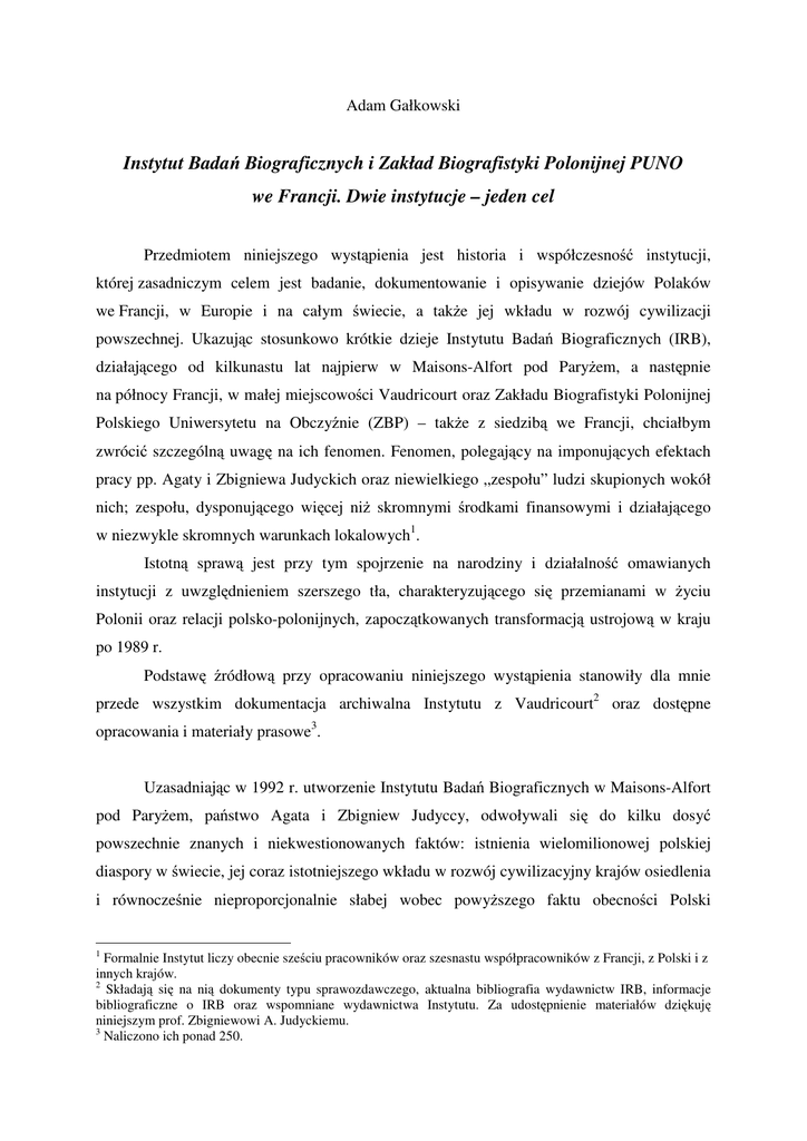 Adam Gałkowski Instytut Badań Biograficznych i Zakład Biografistyki Polonijnej PUNO we Francji. Dwie instytucje – jeden cel Przedmiotem niniejszego wystąpienia jest historia i współczesność instytucji, której zasadniczym celem jest badanie, dokumentowanie i opisywanie dziejów Polaków we Francji, w Europie i na całym świecie, a także jej wkładu w rozwój cywilizacji powszechnej. Ukazując stosunkowo krótkie dzieje Instytutu Badań Biograficznych (IRB), działającego od kilkunastu lat najpierw w Maisons-Alfort pod Paryżem, a następnie na północy Francji, w małej miejscowości Vaudricourt oraz Zakładu Biografistyki Polonijnej Polskiego Uniwersytetu na Obczyźnie (ZBP) – także z siedzibą we Francji, chciałbym zwrócić szczególną uwagę na ich fenomen. Fenomen, polegający na imponujących efektach pracy pp. Agaty i Zbigniewa Judyckich oraz niewielkiego „zespołu” ludzi skupionych wokół nich; zespołu, dysponującego więcej niż skromnymi środkami finansowymi i działającego w niezwykle skromnych warunkach lokalowych1. Istotną sprawą jest przy tym spojrzenie na narodziny i działalność omawianych instytucji z uwzględnieniem szerszego tła, charakteryzującego się przemianami w życiu Polonii oraz relacji polsko-polonijnych, zapoczątkowanych transformacją ustrojową w kraju po 1989 r. Podstawę źródłową przy opracowaniu niniejszego wystąpienia stanowiły dla mnie przede wszystkim dokumentacja archiwalna Instytutu z Vaudricourt2 oraz dostępne opracowania i materiały prasowe3. Uzasadniając w 1992 r. utworzenie Instytutu Badań Biograficznych w Maisons-Alfort pod Paryżem, państwo Agata i Zbigniew Judyccy, odwoływali się do kilku dosyć powszechnie znanych i niekwestionowanych faktów: istnienia wielomilionowej polskiej diaspory w świecie, jej coraz istotniejszego wkładu w rozwój cywilizacyjny krajów osiedlenia i równocześnie nieproporcjonalnie słabej wobec powyższego faktu obecności Polski 1 Formalnie Instytut liczy obecnie sześciu pracowników oraz szesnastu współpracowników z Francji, z Polski i z innych krajów. 2 Składają się na nią dokumenty typu sprawozdawczego, aktualna bibliografia wydawnictw IRB, informacje bibliograficzne o IRB oraz wspomniane wydawnictwa Instytutu. Za udostępnienie materiałów dziękuję niniejszym prof. Zbigniewowi A. Judyckiemu. 3 Naliczono ich ponad 250. w świadomości społeczeństw tychże krajów. Ta ostatnia kwestia wydaje się szczególnie bolesna w praktyce życia codziennego, kiedy to miejscowi urzędnicy nie potrafią określić nawet kontynentu, na którym Polska leży, czy też myląc Polaków np. z Rosjanami itp. Ale patrząc z drugiej strony, wiele do życzenia pozostawiała wówczas (a i dzisiaj jest jeszcze wiele na tym polu do zrobienia) wiedza Polaków z kraju o ich krewnych żyjących od pokoleń w świecie. Zasadniczym celem IRB jest – jak czytamy w jego statucie – „prowadzenie badań naukowych w zakresie biografistyki polonijnej, obejmujących zarówno postacie historyczne, jak i współcześnie żyjące; opracowywanie i wydawanie Ilustrowanego Słownika Biograficznego Polonii Świata, popularyzowanie osiągnięć Polaków żyjących za granicą w środkach masowego przekazu, w publikacjach specjalistycznych oraz poprzez organizowanie sympozjów i konferencji naukowych; tworzenie archiwum osobowego Polonii, ze szczególnym uwzględnieniem krajów europejskich i postaci współcześnie żyjących; opracowywanie ikonograficznego rejestru Polonii świata”. Od początku istnienia, priorytetem IRB było prowadzenie działalności wydawniczej. Że nie były to deklaracje bezpodstawne świadczą liczby – do chwili obecnej pod znakiem Instytutu ukazały się 54 publikacje książkowe. Oprócz nich dwie są w trakcie opracowywania, a kilka projektów – na etapie wstępnych przygotowań. Szczególne miejsce na tej liście zajmuje Ilustrowany Słownik Biograficzny Polonii Świata, opracowany wspólnie z Akademią Świętokrzyską w Kielcach. Ponieważ z założenia miał on pełnić rolę uzupełniającą dla Polskiego Słownika Biograficznego (PSB), do współpracy zaproszono autorów piszących do PSB i zdecydowano o podobnej konstrukcji haseł, wzbogaconych, w odróżnieniu od PSB o ilustracje. Wysokie wymagania formalne oraz problemy finansowe sprawiły jednak, że tom pierwszy tego słownika, aczkolwiek już ukończony, czeka na wydanie drukiem. Publikacje Instytutu Badań Biograficznych w przeważającej części są książkami o charakterze biograficznym i słownikowym, ale kilkanaście z nich stanowią opracowania monograficzne bądź syntezy. Te pierwsze w większości autorstwa Agaty i Zbigniewa Judyckich, ale czasami także z udziałem osób trzecich oraz przez nich redagowane. Głównie w języku polskim, choć z kilkoma wyjątkami – po francusku, po angielsku i po flamandzku. Kiedy jednak były publikowane po polsku, najczęściej opatrywano je streszczeniami w języku angielskim bądź francuskim4. 4 M.in. : A. i Z. Judyccy, Les Polonais en France, Paris 1996, ss. 380; –, Poles in Great Britain, vol. 1-2, Paryż 1995-1997, ss. 73+65 ; –, Polonia. Słownik biograficzny, Wyd. PWN, Warszawa 2000, ss. 382 [jako dodatek do Tematyka – w przypadku opracowań monograficznych – tak bogata i różnorodna, jak bogate i różnorodne jest życie emigracji, życie Polaków na całym świecie. Bogactwem treści i imponującą objętością uwagę zwraca jednak kilka książek poświęconych polskim duchownym, wojskowym i policjantom, oraz rodakom z Krakowa, z Podhala i ze Świętokrzyskiego5. Ta grupa publikacji zawiera materiały przygotowane na dziesięć kolejnych międzynarodowych sympozjów biograficznych, które same w sobie zasługują na uwagę. Nie są to bowiem zwyczajne sympozja naukowe, z jakimi mamy do czynienia w swoich instytucjach i znanej praktyce. Organizowane od 1996 roku, za każdym razem odbywają się w innym miejscu. I tak, na „map