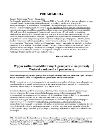 PRO MEMORIA Drodzy Pszczelarze Polscy i Europejscy Oto konspekt wykładu wygłoszonego 27 lutego 2010 w Pszczelej Woli, w którym zebrałem w ciągu ostatnich dwóch lat doświadczenia apidologów i pszczelarzy z roślinami genetycznie zmodyfikowanymi. W Parlamencie Europejskim i Komisji Europejskiej waży się przyszłość pszczół i owadów zapylających. W Europie nie ma reprezentatywnych danych dotyczących strat pszczół zarówno na szczeblu poszczególnych krajów jak i porównywalnych danych na szczeblu UE, brak generalnie standaryzacji i harmonizacji na poziomie UE1, ale to nie przeszkadza zwolennikom upraw roślin zmodyfikowanych genetycznie na otwartych przestrzeniach pól, łąk i lasów do namawiania rolników, leśników i ogrodników do wprowadzania do środowiska tych „biopatentów” nawet bez gwarancji bezpieczeństwa biologicznego. Propaganda GMO to „marsz żałobny różnorodności biologicznej flory i fauny” grany z nadzieją, że niebawem się do niego przyzwyczaimy. Nie przyzwyczaimy się. Pszczelarze i bartnicy są twardsi niż ekolodzy wchodzący na drzewa, i wolą słuchać „pszczelich rapsodii”. Niestety jest to możliwe coraz rzadziej. Oprócz wyników badań naukowych i doświadczeń polowych cytuję również stanowiska stowarzyszeń pszczelarzy z kilku krajów Europy, za udostępnienie których w imieniu Redakcji Pszczelarza Polskiego składam bardzo serdeczne podziękowanie. Wacław Święcicki Wpływ roślin zmodyfikowanych genetycznie na pszczoły Wnioski naukowców i pszczelarzy Prawna definicja organizmu genetycznie zmodyfikowanego zawarta jest w art.3 pkt.2 Ustawy z dnia 22 czerwca 2001 r. o organizmach genetycznie zmodyfikowanych: GMO - rozumie się przez to organizm inny niż organizm człowieka, w którym materiał genetyczny został zmieniony w sposób niezachodzący w warunkach naturalnych wskutek krzyżowania lub naturalnej rekombinacji, w szczególności przy zastosowaniu: a) technik rekombinacji DNA z użyciem wektorów, w tym tworzenia materiału genetycznego poprzez włączenie do wirusa, plazmidu lub każdego innego wektora cząsteczek DNA wytworzonych poza organizmem i włączenie ich do organizmu biorcy, w którym w warunkach naturalnych nie występują, ale w którym są zdolne do ciągłego powielania, b) technik stosujących bezpośrednie włączenie materiału dziedzicznego przygotowanego poza organizmem, a w szczególności: mikroiniekcji, makroiniekcji i mikrokapsułkowania, c)metod niewystępujących w przyrodzie dla połączenia materiału genetycznego co najmniej dwóch różnych komórek, gdzie w wyniku zastosowanej procedury powstaje nowa komórka zdolna do przekazywania swego materiału genetycznego odmiennego od materiału wyjściowego komórkom potomnym. 1 Bee Mortality and Bee Surveillance in Europe, (Śmiertelność pszczół i nadzór instytucjonalny nad nimi w Europie) opracowany przez grupę naukowców z Francji (AFSSA), (INRA ), Anglii (FERA), Niemiec (CVUA), Włoch (IZSVE), Szwecji (SLU), Słowenii (KIS) i Szwajcarii (APL), CFP/EFSA/AMU/2008/02. Accepted for Publication on 03 December 2009 WPROWADZENIE W literaturze popularno-naukowej organizmami zmodyfikowanymi genetycznie są nazywane rośliny, zwierzęta i drobnoustroje, których geny zostały celowo zmienione przez człowieka. (za: forum GMO i Biotechnologia) W literaturze polskiej stosuje się najczęściej skrót GMO. W języku angielskim stosowane są następujące skróty: GM - genetically modified (zmodyfikowany genetycznie), GMO - genetically modified organizms (genetycznie zmodyfikowane organizmy) i LMO - live modified organisms (żywe zmodyfikowane organizmy). W roślinach istnieją trzy stopnie modyfikacji: 1) zmniejszenie lub zwiększenie aktywności własnych genów, 2) wprowadzenie dodatkowych kopii własnych genów, 3) wprowadzenie genów z innego gatunku – tworzy tzw. organizmy transgeniczne Celem modyfikacji roślin było: 1- uzyskanie roślin odpornych na herbicydy (środki ochrony roślin) i szkodniki (pędów i korzeni), 2 – zaprogramowanie roślin na określone warunki środowiska (susza, mróz, zasolenie gleby), 3 - wykorzystywane materiału roślin GMO do produkcji farmaceutyków, np. szczepionek, przeciwciał. (za:BioTechnolog.pl) Aktualnie dominują dwa typy roślin transgenicznych I - Rośliny odporne na środek chwastobójczy, (herbicyd), np. Roundup Ready (zapisywane w skrócie - soja RR, rzepak RR) II -Rośliny, z genem bakterii glebowej Bacillus thuringiensis, której produkty – toksyczne białka Cry – są przyczyną odporności rośliny na owady (kukurydza Bt, bawełna Bt, ziemniaki Bt, pomidory Bt). Historia GMO w 1973 utworzono pierwszy organizm GMO przez Stanley Cohena i Herberta Boyer'a. W 1993 r. wprowadzono w USA pierwszą roślinę GMO, pomidor FLAVR-SAVR, dla którego wykonano pełne badania wpływu na zdrowie zwierząt. Od 1996 roku rośliny transgeniczne (soja, kukurydza, bawełna) są uprawiane w Stanach Zjednoczonych, Kanadzie, Ameryce Południowej i Azji. W Europie kukurydza Bt odporna na szkodniki była uprawiana w Hiszpanii, Portugalii, Francji, Niemczech i Republice Czeskiej, na Węgrzech i w Rumunii. W Unii Europejskiej w 2008 r. oficjalna powierzchnia upraw (GMO) wynosiła 98 000 ha, w tym: 79 300 ha w Hiszpanii, 8 400 ha w Republice Czeskiej, 7 100 ha w Rumunii, 4 900 ha w Portugalii, 3 400 ha w Niemczech, oraz 1 900 ha w Słowenii. W Europie Szwajcaria, Austria, Francja, Niemcy, Włochy, Grecja, Węgry i Luksemburg, a w 2010 roku Bułgaria przyjęły środki ochronne, zakazując uprawy genetycznie zmodyfikowanej kukurydzy MON810. Austria zakazała również uprawy genetycznie zmodyfikowanej kukurydzy T25. Strefy wolne od GMO powstały także w Szkocji, w Walii, w Irlandii Północnej, w Hiszpanii i Portugalii, na Cyprze, w Albanii, Chorwacji, Norwegii, Szwecji i Finlandii. W 2004 roku wszystkie sejmiki samorządowe w Polsce zadeklarowały wolę bycia strefą wolną od GMO. Do tworzenia organizmó