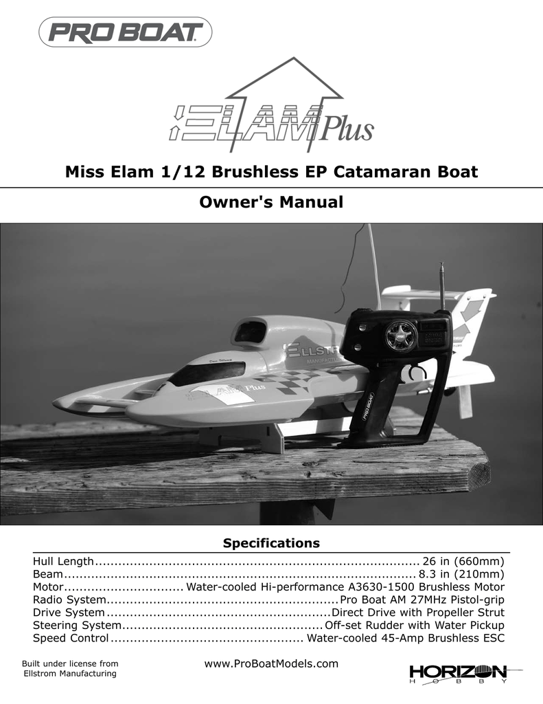 ® Miss Elam 1/12 Brushless EP Catamaran Boat Owner's Manual Specifications Hull Length..................................................................................... 26 in (660mm) Beam............................................................................................ 8.3 in (210mm) Motor................................ Water-cooled Hi-performance A3630-1500 Brushless Motor Radio System............................................................ Pro Boat AM 27MHz Pistol-grip Drive System...........................................................Direct Drive with Propeller Strut Steering System..................................................... Off-set Rudder with Water Pickup Speed Control................................................... Water-cooled 45-Amp Brushless ESC Built under license from Ellstrom Manufacturing www.ProBoatModels.com Introduction The Miss Elam Brushless EP comes ready-torun with the Pro Boat 27MHz AM radio system and electronic speed controller already installed. All assembly and building is done at the factory, allowing you to quickly get your boat running. Thank you for purchasing the Pro Boat® Miss Elam Brushless EP ready-to-run boat. Please read these instructions carefully before attempting to operate your boat. Table of Contents Introduction.......................................................................................................... 2 Table of Contents.................................................................................................. 2 Inspection............................................................................................................ 2 General Guidelines................................................................................................ 3 Additional Required Items...................................................................................... 3 Contents.............................................................................................................. 4 Section 1: Assembling the Boat Stand..................................................................... 4 Section 2: Installing the Transmitter Batteries........................................................... 4 Section 3: Installing the 7.2V Ni-MH Battery Packs.................................................... 5 Section 4: Adjusting the Transmitter........................................................................ 6 Section 5: Checking the Radio System................................................................. 6–7 Section 6: Testing Your Boat in the Water................................................................. 8 Section 7: Handling Adjustment.............................................................................. 8 Section 8: Maintenance.......................................................................................... 8 Section 9: Speed Control Programming.................................................................... 9 Section 10: Lubricating the Drive Shaft.................................................................... 9 Section 10: Lubricating the Drive Shaft Continued................................................... 10 Section 11: Warranty Information......................................................................... 11 Section 12: Replacement Parts.............................................................................. 12 General Guidelines It is important that you read and follow this instruction manual along with the radio system manual before you run this exciting boat. Failure to read and understand the manual could result in personal injury, property damage or permanent damage to your boat. It is also important to run your boat responsibly. With proper care and maintenance, you will be able to proudly enjoy your Miss Elam Brushless Catamaran for many years to come. Before you operate your model, make sure that your frequency is clear. If someone is operating on the same frequency, both models could go out of control, possibly causing damage to the models or to others. Check all of the hardware and the propeller for damage and loose screws before and after each run. If at any time while operating your model you sense any abnormal function, end your operation immediately. Do not operate your boat again until you are certain the problem has been corrected. Always stay clear of the propeller. When operating the boat, stay clear of people, full-scale boats, stationary objects and wildlife. It is preferable to operate the Miss Elam Brushless Catamaran in low wake, low wind conditions and in areas free of people, wildlife and objects. Additional Required Items You will need to purchase the following to get your boat on the water: • 8 AA alkaline batteries for the radio transmitter • 7.2V Ni-MH Battery Pack with Dean's connector (PRB3313 or PRB3314) (2) • Twin Peak Dual Battery Charger (DYN4033) • Tamiya/Dean's adapter (PRB3312) PRB3313 3600mAh Inspection Carefully remove the boat and radio transmitter from the box. Inspect the boat to make sure no damage is present. If you notice damage is present, please contact the hobby shop where you purchased it. PRB3314 4200mAh 2 3 Contents Section 3: Installing the 7.2V Ni-MH Battery Packs • Miss Elam Brushless EP RTR Attach the hook and loop material to the batteries and the battery boxes. Carefully remove the hatch from the hull. • Pro Boat radio transmitter • Boat stand Section 1: Assembling the Boat Stand Attach the side stand pieces by interlocking them into the end pieces as shown. Secure the interlocking pieces with medium CA or epoxy. Make certain you allow the adhesive to fully cure before placing your boat on the stand. The Pro Boat water-cooled ESC comes pre-wired with a Dean's connector. Use a 6-cell battery pack listed below for optimum performance. • PRB3313 7 .2V 3600mAh w/Dean's connector • PRB3314 7 .2V 4200mAh w/Dean's connector You may also remove the Tamiya connector fr