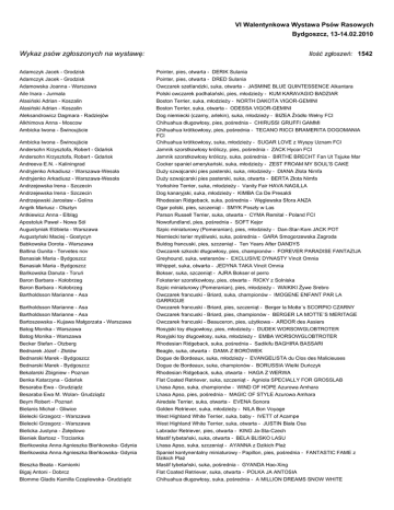 VI Walentynkowa Wystawa Psów Rasowych Bydgoszcz, 13-14.02.2010 Wykaz psów zgłoszonych na wystawę: Ilość zgłoszeń: 1542 Adamczyk Jacek - Grodzisk Pointer, pies, otwarta - DERIK Sulania Adamczyk Jacek - Grodzisk Adamowska Joanna - Warszawa Pointer, pies, otwarta - DRED Sulania Owczarek szetlandzki, suka, otwarta - JASMINE BLUE QUINTESSENCE Alkantara Aile Inara - Jurmala Polski owczarek podhalański, pies, młodzieży - KUM KARAVAGIO BADZIAR Alasiński Adrian - Koszalin Alasiński Adrian - Koszalin Boston Terrier, suka, młodzieży - NORTH DAKOTA VIGOR-GEMINI Boston Terrier, suka, otwarta - ODESSA VIGOR-GEMINI Aleksandrowicz Dagmara - Radziejów Dog niemiecki (czarny, arlekin), suka, młodzieży - BIZEA Źródło Wełny FCI Alkhimova Anna - Moscow Ambicka Iwona - Świnoujście Ambicka Iwona - Świnoujście Chihuahua długowłosy, pies, pośrednia - CHIRUSSI GRUFFI GAMMI Chihuahua krótkowłosy, pies, pośrednia - TECANO RICCI BRAMERITA DOGOMANIA FCI Chihuahua krótkowłosy, suka, młodzieży - SUGAR LOVE z Wyspy Uznam FCI Andersohn Krzysztofa, Robert - Gdańsk Andersohn Krzysztofa, Robert - Gdańsk Jamnik szorstkowłosy króliczy, pies, pośrednia - ZACK Hycon FCI Jamnik szorstkowłosy króliczy, suka, pośrednia - BIRTHE BRECHT Fan Ut Tsjuke Mar Andreeva E.N. - Kaliningrad Cocker spaniel amerykański, suka, młodzieży - ZEST FROAM MY SOUL'S CAKE Andryjenko Arkadiusz - Warszawa-Wesoła Andryjenko Arkadiusz - Warszawa-Wesoła Duży szwajcarski pies pasterski, suka, młodzieży - DIANA Złota Nimfa Duży szwajcarski pies pasterski, suka, otwarta - BERTA Złota Nimfa Andrzejewska Irena - Szczecin Yorkshire Terrier, suka, młodzieży - Vanity Fair HAVA NAGILLA Andrzejewska Irena - Szczecin Andrzejewski Jarosław - Golina Angrik Mariusz - Olsztyn Antkiewicz Anna - Elbląg Dog kanaryjski, suka, młodzieży - KIMBA Ca De Presaldi Rhodesian Ridgeback, suka, pośrednia - Węglewska Sfora ANZA Ogar polski, pies, szczeniąt - SMYK Poszły w Las Parson Russell Terrier, suka, otwarta - CYMA Remital - Poland FCI Apostoluk Paweł - Nowa Sól Augustyniak Elżbieta - Warszawa Nowofundland, pies, pośrednia - SOFT Kejor Szpic miniaturowy (Pomeranian), pies, młodzieży - Dan-Star-Kom JACK POT Augustyński Maciej - Gostycyn Babkowska Dorota - Warszawa Baltina Gunita - Tervetes nov Niemiecki terier myśliwski, suka, pośrednia - GARA Smogorzewska Zagroda Buldog francuski, pies, szczeniąt - Ten Years After DANDYS Owczarek szkocki długowłosy, pies, championów - FOREVER PARADISE FANTAZIJA Banasiak Maria - Bydgoszcz Banasiak Maria - Bydgoszcz Bańkowska Danuta - Toruń Greyhound, suka, weteranów - EXCLUSIVE DYNASTY Vincit Omnia Whippet, suka, otwarta - JEDYNA TAKA Vincit Omnia Bokser, suka, szczeniąt - AJRA Bokser el perro Baron Barbara - Kołobrzeg Baron Barbara - Kołobrzeg Bartholdsson Marianne - Asa Foksterier szorstkowłosy, pies, otwarta - RICKY z Solniska Szpic miniaturowy (Pomeranian), pies, młodzieży - WAIKIKI Żywe Srebro Owczarek francuski - Briard, suka, championów - IMOGENE ENFANT PAR LA GARRIGUE Owczarek francuski - Briard, pies, szczeniąt - Berger la Motte´s SCORPIO CZARNY Owczarek francuski - Briard, pies, championów - BERGER LA MOTTE´S MERITAGE Owczarek francuski - Beauceron, pies, użytkowa - ARDOR des Assiers Rosyjski toy długowłosy, pies, młodzieży - DUDEK WORSOWGLOBTROTER Rosyjski toy długowłosy, suka, młodzieży - EMBA WORSOWGLOBTROTER Bartholdsson Marianne - Asa Bartholdsson Marianne - Asa Bartoszewska - Kujawa Małgorzata - Warszawa Batog Monika - Warszawa Batog Monika - Warszawa Becker Stefan - Otzberg Bednarek Józef - Złotów Bednarski Marek - Bydgoszcz Bednarski Marek - Bydgoszcz Bekalarski Zbigniew - Poznan Benka Katarzyna - Gdańsk Besaraba Ewa - Grudziądz Besaraba Ewa M. Wolan- Grudziądz Beym Robert - Poznań Bielanis Michał - Gliwice Bielecki Grzegorz - Warszawa Bielecki Grzegorz - Warszawa Bielicka Justyna - Żołędowo Bieniek Bartosz - Trzcianka Bieńkowska Anna Agnieszka Bieńkowska- Gdynia Bieńkowska Anna Agnieszka Bieńkowska- Gdynia Bieszka Beata - Kamionki Bigaj Antoni - Dobrcz Blomme Gladis Kamilla Czaplewska- Grudziądz Rhodesian Ridgeback, suka, pośrednia - Sadikifu BAGHIRA BASSARI Beagle, suka, otwarta - DAMA Z BORÓWEK Dogue de Bordeaux, suka, młodzieży - EVANGELISTA du Clos des Malicieuses Dogue de Bordeaux, suka, championów - BORUSSIA Wielki Duńczyk Rhodesian Ridgeback, suka, otwarta - HAGA Z WERWA Flat Coated Retriever, suka, szczeniąt - Agniola SPECIALLY FOR GROSSLAB Lhasa Apso, suka, championów - WIND OF HOPE Azurowa Amhara Lhasa Apso, pies, pośrednia - MAGIC OF STYLE Azurowa Amhara Airedale Terrier, suka, otwarta - EVENA Sonora Golden Retriever, suka, młodzieży - NILA Bon Voyage West Highland White Terrier, suka, baby - IVETT of Acampe West Highland White Terrier, suka, otwarta - JUSTIN Biała Osa Labrador Retriever, pies, otwarta - KING Ja-Sta-Czech Mastif tybetański, suka, otwarta - BELA BLISKO LASU Lhasa Apso, suka, szczeniąt - AYANNA z Dzikich Plaż Spaniel kontynentalny miniaturowy - Papillon, pies, pośrednia - FANTASTIC FAME z Dzikich Plaż Mastif tybetański, suka, pośrednia - GYANDA Hao-Xing Flat Coated Retriever, suka, otwarta - POLKA JA ANTOSIA Chihuahua długowłosy, suka, pośrednia - A MILLION DREAMS SNOW WHITE Błaszczyk Magdalena - Grodzisk Mazowiecki Flat Coated Retriever, suka, otwarta - POINTA Helleńska Osada Błaszkowska Katarzyna - Nowe Miasto Lubawski Błaszków Janusz - Oborniki Chiński grzywacz, suka, młodzieży - BIBI BIANCO GATTACA Dog z Majorki, suka, młodzieży - Freke's BODIL Błauciak Ewa - Warszawa Wyżeł weimarski krótkowłosy, suka, pośrednia - FENOMENA TEAM ZEMES Błońska Dorota - Rytel Bobek Halina - Słupca Border Collie, suka, otwarta - HAVANA Alchera FCI Golden Retriever, suka, otwarta - DAXI JAMAJKA BANDA MIDASA Bobiński Seweryn - Piecki Polski owczarek podhalański, pies, otwarta - ARES Alpejskie Zauroczenie Bochnia Robert - Piławki 1 Bochnia Robert - Piławki 1 Czarny