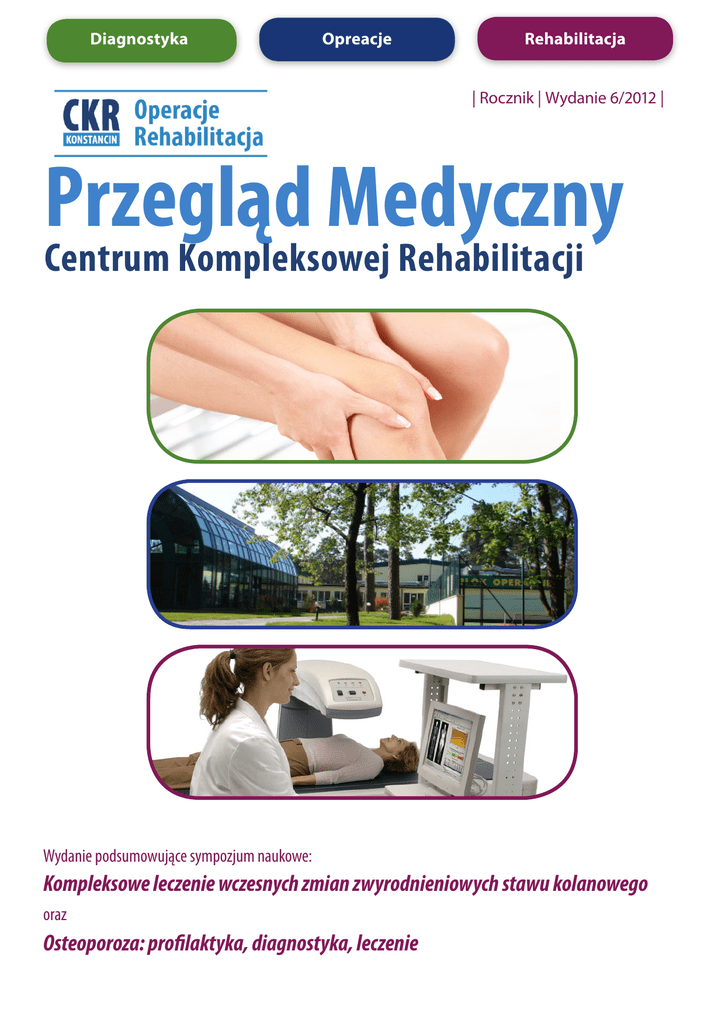 Diagnostyka Opreacje Rehabilitacja | Rocznik | Wydanie 6/2012 | Przegląd Medyczny Centrum Kompleksowej Rehabilitacji Wydanie podsumowujące sympozjum naukowe: Kompleksowe leczenie wczesnych zmian zwyrodnieniowych stawu kolanowego oraz Osteoporoza: profilaktyka, diagnostyka, leczenie Centrum Kompleksowej Rehabilitacji w Konstancinie jest ośrodkiem, który od ponad 30 lat specjalizuje się w leczeniu schorzeń narządu ruchu. Z myślą o pacjentach wymagających interwencji chirurgicznej uruchomiliśmy nowoczesny Oddział Ortopedii i Chirurgii Kręgosłupa, stanowiący dopełnienie naszej oferty leczniczej. Zakres usług: REUMOORTOPEDIA CHIRURGIA KRĘGOSŁUPA ARTROSKOPIA Wszczepienie endoprotezy (alloplastyka) Stosujemy nowoczesne, małoinwazyjne Artroskopia lecznicza stawu kolanowego, barkowego i innych. stawu biodrowego, kolanowego, stawów śródręczno-palcowych ręki. Operacje korekcyjne rąk, łokci, kolan, stóp zniekształconych przez proces zapalny. Operacje profilaktyczne i rekonstrukcyjne ścięgien: tenosynowektomie prostowników i zginaczy palców, rekonstrukcje zerwanych ścięgien. Operacje zespołów uciskowych nerwów obwodowych (zespół cieśni nagarska i inne). metody operacji dyskopatii kręgosłupa m.in.: Endoskopowe usunięcie jądra miażdżystego w odcinku lędźwiowym kręgosłupa metodą Endospine. Przezskórne usunięcie dysku Rekonstrukcja artroskopowa więzadła krzyżowego przedniego/tylnego. Artroskopowe zszycie stożka rotatorów stawu barkowego. lędźwiowego – nukleoplastyka technologią Coblation. Oferujemy również klasyczne metody leczenia chirurgicznego schorzeń kręgosłupa. Operacje wykonują renomowani lekarze specjaliści posiadający bogate doświadczenie kliniczne. W Oddziale pracują także wysoko wykwalifikowane pielęgniarki oraz dyplomowani fizjoterapeuci. Oferujemy kompleksową opiekę medyczną obejmującą: konsultację lekarską, przygotowanie do operacji, przeprowadzenie operacji, opiekę pooperacyjną oraz wczesną rehabilitację, którą można kontynuować w wybranej placówce CKR. Projekt uruchomienia bloku operacyjnego przez Centrum Kompleksowej Rehabilitacji Sp. z o.o. (dawne Centrum Kształcenia i Rehabilitacji Sp. z o.o.) uzyskał dofinansowanie w maksymalnej wysokości 1 250 000 PLN w ramach Sektorowego Programu Operacyjnego Wzrost Konkurencyjności Przedsiębiorstw, lata 2004-2006, Priorytet 2 - Bezpośrednie wsparcie przedsiębiorstw, Działanie 2.3 - Wzrost konkurencyjności małych i średnich przedsiębiorstw poprzez inwestycje. Oddział Ortopedii i Chirurgii Kręgosłupa CKR ul. Gąsiorowskiego 12/14, Konstancin, tel. (22) 703 04 36, 503 002 503 www.ckr.pl Przegląd Medyczny Centrum Kompleksowej Rehabilitacji Zarząd Centrum Kompleksowej Rehabilitacji Spis treści Jerzy Karwowski Wstęp Prezes Zarządu Jerzy Karwowski Wydanie 6/2012 5 Dr n. med. Leszek Krzyżosiak V-ce Prezes Zarządu ds. Leczniczo- Rehabilitacyjnych Część I Kompleksowe leczenie wczesnych zmian zwyrodnieniowych stawu kolanowego Rada Naukowo-Konsultacyjna Prof. dr hab. n. med. Jarosław Deszczyński Kierownik Kliniki Ortopedii i Rehabilitacji II Wydział Lekarski WUM, Mazowiecki Szpital Bródnowski w Warszawie Wojewódzki Konsultant ds. Ortopedii i Traumatologii Narządu Ruchu. Postępowanie rehabilitacyjne w kompleksowych zabiegach rekonstrukcyjnych stawu kolanowego – protokół rehabilitacji 7—9 Mgr Katarzyna Gosek, Mgr Joanna Jaczewska, Lek. med. Jarosław Michał Deszczyński Rola preparatów glukozaminy i chondroityny w leczeniu choroby zwyrodnieniowej stawów kolanowych Dr n. med. Ireneusz Babiak 10 — 12 Prof. zw. dr hab. n. med. Jan Haftek Doktor Honoris Causa Wojskowej Akademii Medycznej w Łodzi. Honorowy Członek Polskiego Towarzystwa Neurochirurgów. Honorowy Członek Polskiego Towarzystwa Rehabilitacji. Członek Komitetu Rehabilitacji, Kultury Fizycznej i Integracji Społecznej Polskiej Akademii Nauk. Część II Osteoporoza: profilaktyka, diagnostyka, leczenie Rola terapii parenteralnej w profilaktyce wtórnych złamań w przebiegu osteoporozy Lek. med. Łukasz Czarnocki, Lek. med. Robert Jopowicz, Lek. med. Inga Deszczyńska, Lek. med. Piotr Wojdasiewicz, Prof. dr hab. n. med. Jarosław Deszczyński 14 — 16 Dr n. med. Marek Krasuski Wiceprezes Polskiego Towarzystwa Rehabilitacji. Kierownik Katedry i Kliniki Rehabilitacji Warszawskiego Uniwersytetu Medycznego. Innowacyjna, Kompleksowa, Aktywna, Rehabilitacja Osteoporozy Prof. Dr hab. n. med. Jarosław Deszczyński, Dr n. med. Łukasz Nagraba, Lek. med. Tomasz Mitek, Lek. med. Jarosław Michał Deszczyński 17 — 21 Prof. dr hab. n. med. Walerian Staszkiewicz Kierownik Kliniki Chirurgii Naczyniowej i Angiologii Centrum Medycznego Kształcenia Podyplomowego w Warszawie. Prof. zw. dr hab. Marek Woźniewski Kierownik Katedry Fizjoterapii i Terapii Zajęciowej w Medycynie Zachowawczej i Zabiegowej AWF we Wrocławiu. Przewodniczący Komitetu Rehabilitacji, Kultury Fizycznej i Integracji Społecznej Polskiej Akademii Nauk. CENTRUM KOMPLEKSOWEJ REHABILITACJI 3 Wstęp Sympozjum Naukowe CKR 23 listopada 2012. Kompleksowe leczenie wczesnych zmian zwyrodnieniowych stawu kolanowego Osteoporoza: profilaktyka, diagnostyka, leczenie. Partonat honorowy: Partner wydarzenia: dr Andrzej Malinowski Prezydent Pracodawców RP Patronat medialny: Główny sponsor: Sponsorzy: 4 Przegląd Medyczny Wstęp Jerzy Karwowski Prezes Zarządu Centrum Kompleksowej Rehabilitacji Szanowni Państwo, Centrum Kompleksowej Rehabilitacji jest ośrodkiem wyspecjalizowanym w operacjach ortopedycznych, chirurgii kręgosłupa, rehabilitacji narządu ruchu oraz rehabilitacji neurologicznej. Obok działalności medycznej ważnym elementem naszej strategii jest działalność naukowa, nad którą pieczę sprawuje Rada Naukowo-Konsultacyjna. Co roku organizujemy Sympozja Naukowe, które są okazją do wymiany wiedzy i doświadczenia, a także integracji środowiska medycznego. Podsumowaniem Sympozjum jest Przegląd Medyczny 