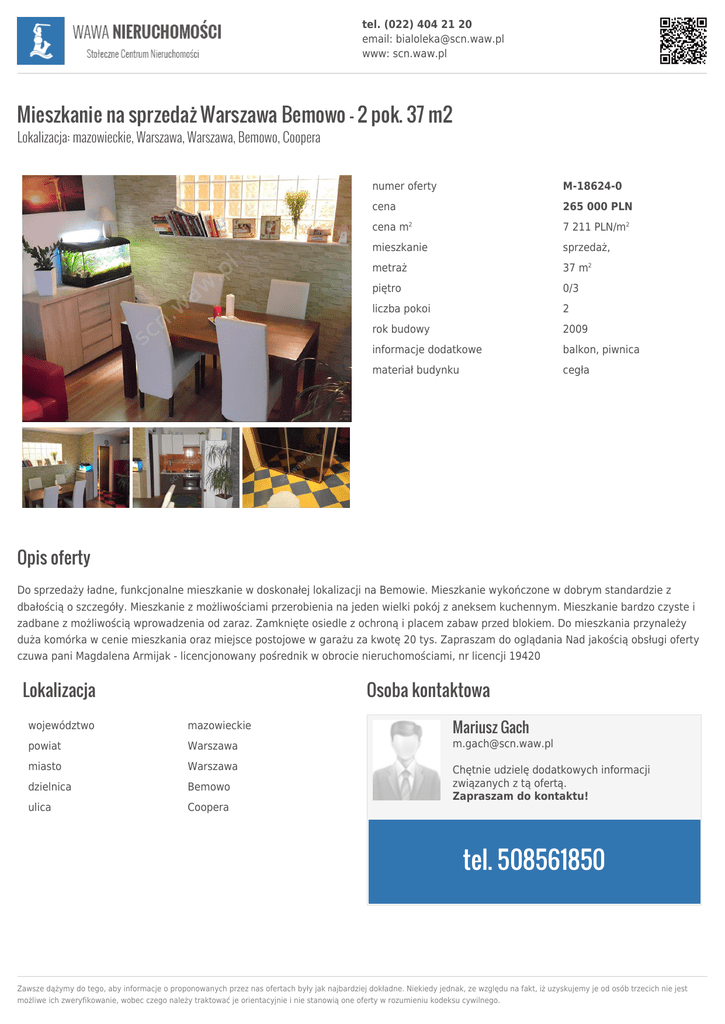 tel. (022) 404 21 20 email: [email protected] www: scn.waw.pl Mieszkanie na sprzedaż Warszawa Bemowo - 2 pok. 37 m2 Lokalizacja: mazowieckie, Warszawa, Warszawa, Bemowo, Coopera numer oferty M-18624-0 cena 265 000 PLN cena m 7 211 PLN/m2 mieszkanie sprzedaż, metraż 37 m2 piętro 0/3 liczba pokoi 2 rok budowy 2009 informacje dodatkowe balkon, piwnica materiał budynku cegła 2 Opis oferty Do sprzedaży ładne, funkcjonalne mieszkanie w doskonałej lokalizacji na Bemowie. Mieszkanie wykończone w dobrym standardzie z dbałością o szczegóły. Mieszkanie z możliwościami przerobienia na jeden wielki pokój z aneksem kuchennym. Mieszkanie bardzo czyste i zadbane z możliwością wprowadzenia od zaraz. Zamknięte osiedle z ochroną i placem zabaw przed blokiem. Do mieszkania przynależy duża komórka w cenie mieszkania oraz miejsce postojowe w garażu za kwotę 20 tys. Zapraszam do oglądania Nad jakością obsługi oferty czuwa pani Magdalena Armijak - licencjonowany pośrednik w obrocie nieruchomościami, nr licencji 19420 Lokalizacja Osoba kontaktowa Mariusz Gach województwo mazowieckie powiat Warszawa [email protected] miasto Warszawa dzielnica Bemowo ulica Coopera Chętnie udzielę dodatkowych informacji związanych z tą ofertą. Zapraszam do kontaktu! tel. 508561850 Zawsze dążymy do tego, aby informacje o proponowanych przez nas ofertach były jak najbardziej dokładne. Niekiedy jednak, ze względu na fakt, iż uzyskujemy je od osób trzecich nie jest możliwe ich zweryfikowanie, wobec czego należy traktować je orientacyjnie i nie stanowią one oferty w rozumieniu kodeksu cywilnego.