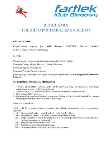 ORGANIZATOR Organizatorem imprezy jest Klub Biegowy FARTLEK Gorzyce Okolice, ul. Por. J. Sarny 1/11, 39-432 Gorzyce I. CEL Popularyzacja i promocja biegania jako najprostszej formy ruchu, Promocja Gorzyc, Gminy Gorzyce, Gminy Zaleszany, Promocja regionu Podkarpacia, Promocja Powiatu Tarnobrzeskiego, Popularyzacja zdrowego stylu życia wśród profesjonalistów a w szczególności amatorów biegania. II. TERMIN, MIEJSCE, PROGRAM 1. Termin: 25.03.2016r. (sobota) godz. 12:00 (pierwszy bieg przedszkolaka oraz biegi młodzieżowe), godz. 13:00 (bieg główny) 2. Trasa: około 12 - 13 km (nawierzchnia szutrowa utwardzona, asfaltowa 10%) 3. Start i meta: Zalew Gorzyce 4. Biuro zawodów znajdować się będzie na terenie Zalewu w Gorzycach ul. Przybyłów, którego zarządcą jest Gminny Ośrodek Sportu i Rekreacji PROGRAM IMPREZY: 10:30 – 12:30 – otwarcie biura zawodów. Weryfikacja uczestników oraz przyjmowanie zgłoszeń 11:40 – Bieg przedszkolaka – wiek dziecka 4 – 6 lat (około 100m) 12:00 – Biegi Dzieci z klas 1 – 3 szkoły podstawowej (około 300m) 12.20 – Bieg na dystansie 600 m dla dzieci z klas 4 – 6 szkoły podstawowej oraz młodzieży w wieku gimnazjalnym i starszych 13:00 – Bieg główny na dystansie około 12km 14:40 – Zamknięcie trasy. Zakończenie biegu. 15.00 – Uroczyste zakończenie biegu dekoracja zwycięzców III. OPIS TRASY 1. 2. 3. Długość trasy około 12 km po nawierzchni szutrowej Start i Meta: Zalew w Gorzycach Na mecie biegu rozstawiony będzie punkt z wodą, oraz poczęstunkiem w postaci owoców i dania z kuchni polowej. IV. LIMIT I POMIAR CZASU 1. 2. 3. Zawodników obowiązuje limit czasu wynoszący 1h 40 min. od strzału startera. Zawodnicy, którzy po upływie wskazanego wyżej czasu nie dotrą do mety nie będą klasyfikowani. Pomiar odbywa się przy pomocy chipów, które zawodnik pobiera (wraz z numerem) w biurze zawodów. Posiadanie chipa jest warunkiem wystartowania w biegu i sklasyfikowania w komunikacie końcowym. V. UCZESTNICTWO i ZGŁOSZENIA Uczestnictwo: Do startu zostaną dopuszczeni zawodnicy, którzy ukończyli 16 lat i posiadają aktualne badania lekarskie lub przedłożą oświadczenie o zdolności do biegu podpisane od opiekuna prawnego. 2. Zgłoszenia: (strona internetowa http://timekeeper.pl/zawody będzie aktywna do 01 styczeń 2017 r.) lub w dniu startu w Biurze Zawodów od godz. 10:30 do 12:30 (Namiot biura zawodów Zalew w Gorzycach ul. Przybyłów). 3. Koszty udziału i noclegów ponosi uczestnik lub instytucje delegujące. 4. Zgłoszenia online można dokonywać do 10 marzec 2017 roku. do godz. 24:00. Po tym terminie zgłoszenia będą możliwe wyłącznie w Biurze Zawodów w dniu 25 marzec 2017r. 5. Podstawą odbioru numeru startowego jest okazanie przez zawodnika w Biurze Zawodów dokumentu tożsamości ze zdjęciem, w przypadku osób nieletnich legitymacja szkolna lub inny dokument ze zdjęciem. 6. Odbiór numeru startowego w imieniu innej osoby jest możliwy na podstawie podpisanego oświadczenia tej osoby oraz kserokopii dowodu osobistego zgłoszonego zawodnika. Dodatkowo należy przedstawić oświadczenie o stanie zdrowia, podpisane przez Uczestnika Biegu. 7. Zawodnicy pokonujący dystans biegu w sposób niedozwolony /skracanie trasy/ zostaną zdyskwalifikowani. 8. Podczas zawodów zawodnicy muszą posiadać numery startowe przypięte z przodu na wysokości klatki piersiowej, 9. Zabrania się startowania zawodnikom pod wpływem niedozwolonych środków oraz alkoholu. 10. Pobranie numeru startowego jest równoznaczne z akceptacją regulaminu biegu. 1. VI. KLASYFIKACJA 1. Bieg przedszkolaka około 100 m (50 dzieci) 2. Bieg Dzieci z klas 1 – 3 szkoły podstawowej na dystansie około 300 m (50 dzieci) 3. Bieg na dystansie 600 m dla dzieci z klas 4 – 6 szkoły podstawowej oraz młodzieży w wieku gimnazjalnym i starszych (50 dzieci i młodzieży) 4. Bieg główny – I Bieg o Puchar Leszka Bebło – miejsca I – III mężczyzn i I – III kobiet. 5. Klasyfikacja wg kategorii wiekowych za miejsca 1 – 3. mężczyźni: kobiety: do 29 lat do 29 lat 30-39 lat 30-39 lat 40-49 lat 40-49 lat 50-59 lat 50+ 60+ --6. Klasyfikacja Mistrzostwa Powiatu Tarnobrzeskiego za miejsca 1 – 3 wśród Kobiet i Mężczyzn. Każda kategoria będzie nagradzana jeżeli liczba uczestników danej kategorii będzie wynosiła co najmniej 5 osób. W przypadku mniejszej liczby uczestników, osoby te będą klasyfikowane w kategorii wyższej (młodszej) dotyczy Biegu Głównego. 7. Klasyfikacje będą prowadzone według czasów brutto (liczone od strzału startera – pomiar elektroniczny). VII. NAGRODY 1. Uczestnicy biegów otrzymają pamiątkowy medal. 2. Zdobywcy miejsc I – III w klasyfikacjach generalnych OPEN kobiet i mężczyzn otrzymują puchary lub nagrody pieniężne/rzeczowe (wysokość nagród zostanie podana w ostatnim tygodniu przed zawodami). 3. Zdobywcy miejsc I-III w poszczególnych kategoriach wiekowych otrzymają puchar, nagrody rzeczowe (nagrody zależeć będą od pozyskanych środków od sponsorów). 4. Organizator zastrzega sobie prawo do ufundowania dodatkowych nagród w wybranych przez siebie kategoriach i klasyfikacjach oraz do stworzenia dodatkowych klasyfikacji. 5. Zawodnicy, którzy zostaną nagrodzeni w kategorii OPEN, nie będą nagradzani w poszczególnych kategoriach. 6. Losowanie nagród w loterii wśród uczestników biegu na 12km. VIII. OPŁATY STARTOWE 1. 2. 3. 4. 5. 6. 7. 8. 9. Opłaty startowej nie pobiera się od uczestników biegów towarzyszących. Limit dzieci biorących udział to 150 dzieci. Dla tylu młodych zawodników organizator zapewnia wodę/soczek oraz batonik lub ciastko, miłą zabawę. Każdy uczestnik biegu głównego ponosi koszty opłaty wpisowej. Opłata wpisowa wynosi w zależności od terminu wpłaty. 30 zł do 15 lutego 2017r. 45 zł do 10 marca 2017r. 60 zł gotówką w Biurze Zawodów w dniu 25 marzec 2017r. Opłata startowa: KLUB BIEGOWY FARTLEK GORZYCE OKOLICE 39-432 GOR