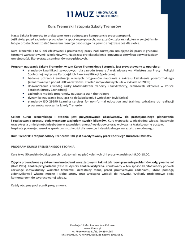Kurs Trenerski I stopnia Szkoły Trenerów Nasza Szkoła Trenerów to praktyczne kursy podnoszące kompetencje pracy z grupami. Jeśli stoisz przed zadaniem prowadzenia spotkań grupowych, warsztatów, zebrań, szkoleń w swojej firmie lub po prostu chcesz zostać trenerem rozwoju osobistego na pewno znajdziesz coś dla siebie. Kurs Trenerski I to 5 dni efektywnej i praktycznej pracy nad rozwojem umiejętności pracy z grupami formami warsztatowymi i szkoleniowymi. Napiszesz projekt szkolenia i otrzymasz certyfikat potwierdzający umiejętności. Skorzystasz z seminariów narzędziowych. Program nauczania Szkoły Trenerów, w tym Kursu Trenerskiego I stopnia, jest przygotowany w oparciu o: standardy kwalifikacji zawodowych dla zawodu trenera / wykładowcy wg Ministerstwa Pracy i Polityki Społecznej, wytyczne Europejskich Ram Kwalifikacji Społecznej badanie potrzeb i ewaluację własnych programów nauczania z zakresu kształcenia pozaformalnego (zrealizowanych ponad 900 warsztatów i szkoleń indywidualnych lub w cyklach od 2009) doświadczenie i wiedzę kadry (doświadczeni trenerzy i facylitatorzy, realizowali szkolenia w Polsce i krajach Europy Zachodniej) zachodnie modele programów nauczania train the trainers dynamikę nauczania bazująca na doświadczeniu i wnioskach (cykl Kolba) standardy ISO 29990 Learning services for non-formal education and training, wdrażane do realizacji programów nauczania Szkoły Trenerów Celem Kursu Trenerskiego I stopnia jest przygotowanie absolwentów do profesjonalnego planowania i realizowania procesu dydaktycznego względem swoich klientów. Kurs wyposaża w niezbędną wiedzę, kształtuje oraz określa umiejętności niezbędne w zawodzie trenera / wykładowcy oraz wpływa na kształtowanie postaw. Inspiruje pokazując szerokie spektrum możliwości dla rozwoju indywidualnego warsztatu zawodowego. Kurs Trenerski I stopnia Szkoły Trenerów PKR jest akredytowany przez Łódzkiego Kuratora Oświaty. PROGRAM KURSU TRENESRKIEGO I STOPNIA Kurs trwa 50 godzin dydaktycznych rozłożonych na pięć kolejnych dni pracy w godzinach 9.00-18.00. Zajęcia prowadzone są aktywnymi metodami warsztatowymi takimi jak rozwiązywanie problemów, odgrywanie ról (Role Play), analiza przypadków (Case study) czy analiza krytyczna. Zbudowany w ten sposób kapitał wiedzy pozwoli rozwinąć indywidualny warsztat trenerski. Uczestnicy staną przed praktycznymi zadaniami, które pomogą zidentyfikować własne mocne i słabe strony oraz wyciągną wnioski do rozwoju. Wykłady problemowe będą komentarzem do wypracowanej wiedzy. Każdy otrzyma podręcznik programowy. Fundacja 11 Muz Innowacje w Kulturze www.11muz.pl ul. Piramowicza 11/13, 90-254 Łódź KRS: 0000324772 NIP: 9820358225 Regon: 100639532 Przez pięć dni Kursu nauczysz się: Dzień 1 Dzień 2 Komunikować się z grupą Dzień 3 Zarządzać dynamiką pracy grupowej Dzień 4 Wybierać i wykorzystywać metody i ćwiczenia szkoleniowe Dzień 5 Sprzedawać szkolenia, budować markę i korzystać z podstaw prawnych, w tym Projektować szkolenia (m.in. warsztaty, seminaria, prezentacje) badać potrzeby grupy docelowej oraz analizować potrzeby szkoleniowe wytyczać cele szkoleniowe i planować adekwatne działania merytoryczne planować harmonogram i budżet szkolenia przygotować dobre materiały szkoleniowe konstruować programy, plany szkoleń dokonywać ewaluacji szkolenia budować dobre relacje z grupą pracować z trudnym uczestnikiem planować prezentację i wystąpienia publiczne badać i oceniać własne kompetencje komunikacyjne budować autorytet w grupie określać role i kompetencje lidera, facylitatora, moderatora we własnej pracy wytyczać cel grupowy i kształtować proces grupowy pracować z trudną grupą i jej oporem wykorzystywać i analizować ćwiczenia szkoleniowe (zestawy treningowe, zbiory ćwiczeń, publikacje) tworzyć curriculum do programów nauczania dobierać metody i ćwiczenia do zaprojektowanych celów szkoleniowych Fundacja 11 Muz Innowacje w Kulturze www.11muz.pl ul. Piramowicza 11/13, 90-254 Łódź KRS: 0000324772 NIP: 9820358225 Regon: 100639532 określać specyfikę sprzedaży szkoleń dla instytucji, biznesu, NGO i szkoleń otwartych wyznaczać jakie działania umożliwiają budowanie marki osobistej poznać funkcjonujące na rynku szkoleniowym modele wraz z zaletami, wadami i ograniczeniami przygotowywać materiały szkoleniowe zgodnie z prawem cytatu chronić i zastrzegać autorskie programy szkoleń i warsztatów CERTYFIKACJA W terminie do dwóch miesięcy absolwenci przygotowują zadanie certyfikacyjne - projekt autorskiego szkolenia lub warsztatów. Szkolenie projektowane jest zgodnie z określonymi rekomendacjami i standardem przekazanym w czasie Kursu Trenerskiego I stopnia. Każdy projekt certyfikacyjny jest oceniany i konsultowany w ramach uczestnictwa w Kursie Trenerskim I stopnia. Dzięki temu przyznając certyfikat możemy poświadczyć uczestnictwo w kursie, jak i umiejętność projektowania szkoleń polegającą na analizowaniu potrzeb szkoleniowych, wytyczaniu celów, opracowaniu strategii ich realizacji i ewaluacji, przygotowaniu budżetu i harmonogramu organizacji szkolenia. Wraz z certyfikatem wydawane jest na podstawie rozporządzenia Ministra Edukacji Narodowej z dnia 11 stycznia 2012 r. w sprawie kształcenia ustawicznego w formach pozaszkolnych zaświadczenie o ukończeniu kursu. DLA KOGO Kurs skierowany jest dla osób które, już pracują lub zamierzają pracować z grupami – dla specjalistów z biznesu, organizacji pozarządowych, instytucji publicznych; trenerów pracujących w zawodzie, którzy chcą zwiększyć i potwierdzić swoje kwalifikacje, wiedzę oraz umiejętności; pracowników instytucji publicznych, animatorów, instruktorów; menadżerów, pracowników HR, koordynatorów zarządzających projektami szkoleniowymi, liderów, mentorów, psychologów, coachów; wykładowców akademickich, doktorów, doktorantów oraz pracowników 