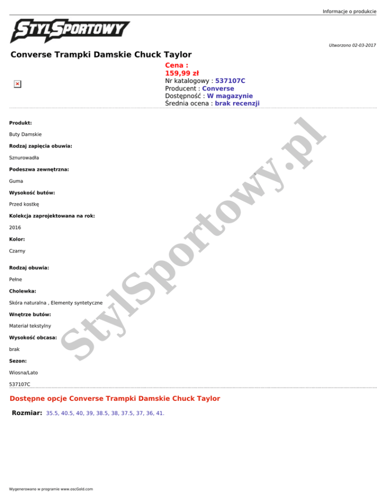 Informacje o produkcie Utworzono 02-03-2017 Converse Trampki Damskie Chuck Taylor Cena : 159,99 zł Nr katalogowy : 537107C Producent : Converse Dostępność : W magazynie Średnia ocena : brak recenzji Produkt: pl Buty Damskie Rodzaj zapięcia obuwia: y. Sznurowadła Podeszwa zewnętrzna: Wysokość butów: Przed kostkę Kolekcja zaprojektowana na rok: 2016 Kolor: Czarny Pełne Cholewka: lS p Rodzaj obuwia: or to w Guma Skóra naturalna , Elementy syntetyczne St y Wnętrze butów: Materiał tekstylny Wysokość obcasa: brak Sezon: Wiosna/Lato 537107C Dostępne opcje Converse Trampki Damskie Chuck Taylor Rozmiar: 35.5, 40.5, 40, 39, 38.5, 38, 37.5, 37, 36, 41. Wygenerowano w programie www.oscGold.com