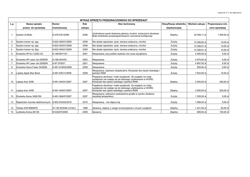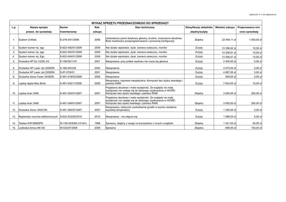 załącznik nr 1 do ogłoszenia WYKAZ SPRZĘTU PRZEZNACZONEGO DO SPRZEDAZY L.p. Nazwa sprzętu przezn. do sprzedaży Numer inwentarzowy Rok Stan techniczny zakupu Klasyfikacja składnika Wartość zakupu zbędny/zużyty Proponowana min. cena sprzedaży 1. System Q-Matic S-278-4/01/2006 2006 Uszkodzony panel dotykowy głowicy, brudna, zniszczona obudowa. Brak możliwości przeprogramowania i ponownej konfiguracji Zbędny 22 940,11 zł 1 000,00 zł 2. System kamer rej. egz. S-622-492/01/2009 2009 Nie działa rejestrator, dysk, kamera wsteczna, monitor Zużyty 13 356,82 zł 10,00 zł 3. System kamer rej. egz. S-622-493/01/2009 2009 Nie działa rejestrator, dysk, kamera wsteczna, monitor Zużyty 13 356,91 zł 10,00 zł 4. System kamer rej. Egz. S-622-494/01/2009 2009 Nie działa rejestrator, dysk, kamera wsteczna, monitor Zużyty 13 356,91 zł 10,00 zł 5. Drukarka HP DJ-1220C A3 S-156/39/11/01 2001 Niesprawna, przy próbie wydruku nie rusza się głowica Zużyty 2 400,00 zł 5,00 zł 6. Drukarka HP Laser Jet 2200DN S-168-45/4/02 2002 Niesprawna Zużyty 4 575,00 zł 5,00 zł 7. Drukarka HP Laser Jet 2200DN S-97-37/6/01 2001 Niesprawna Zużyty 4 697,00 zł 5,00 zł 8. Drukarka Xerox Faser 3435DN S-491-518/03/2009 2009 Niesprawna Zużyty 939,00 zł 5,00 zł 2009 Niesprawny, naprawa nieopłacalna. Komputer bez dysku twardego i pamieci RAM Zużyty 7 634,00 zł 10,00 zł 2007 Popękana obudowa i mała wydajność. Ze względu na małą wydajność nie nadaje się do dalszego użytkowania w WORD. Komputer bez dysku twardego i pamieci RAM Zbędny 3 050,00 zł 200,00 zł 2007 Popękana obudowa i mała wydajność. Ze względu na małą wydajność nie nadaje się do dalszego użytkowania w WORD. Komputer bez dysku twardego i pamieci RAM Zbędny 3 050,00 zł 200,00 zł Zużyty 1 355,00 zł 5,00 zł Zużyty 1 598,20 zł 5,00 zł 9. 10. 11. Laptop Apple Mac Book Laptop Acer 2490 Laptop Acer 2490 S-491-530/11/2009 S-491-354/01/2007 S-491-349/01/2007 12. Drukarka Xerox 3428 DN S-491-384/07/2007 2007 Niesprawna, widoczne uszkodzenie grzałki w wyniku działania wysokiej temperatury 13. Rejestrator rozmów telefonicznych S-622-533/02/2010 2010 Niesprawny - nie włącza się 14. Telefax KXF26800PD W-136-52/9/98 (SWBO) 1998 Sprawny, zbędny z uwagi na korzystanie z innych urządzeń Zbędny 1 421,00 zł 50,00 zł 15. Lodówka Amica AK130 W-532/07/2009 2009 Sprawna Zbędna 699,00 zł 100,00 zł