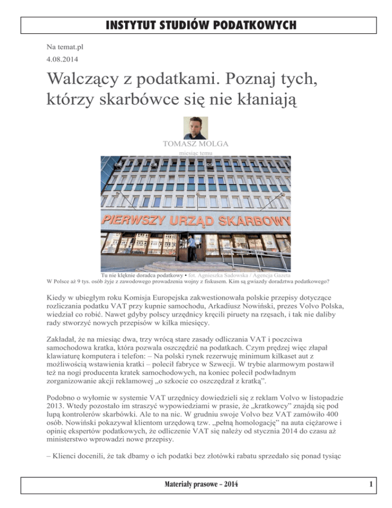 INSTYTUT STUDIÓW PODATKOWYCH Na temat.pl 4.08.2014 Walczący z podatkami. Poznaj tych, którzy skarbówce się nie kłaniają WALCZĄCY Z PODATKAMI. POZNAJ TYCH, KTÓRZY SKARBÓWCE SIĘ NIE KŁANIAJĄ TOMASZ MOLGA miesiąc temu Tu nie klęknie doradca podatkowy • fot. Agnieszka Sadowska / Agencja Gazeta W Polsce aż 9 tys. osób żyje z zawodowego prowadzenia wojny z fiskusem. Kim są gwiazdy doradztwa podatkowego? Kiedy w ubiegłym roku Komisja Europejska zakwestionowała polskie przepisy dotyczące rozliczania podatku VAT przy kupnie samochodu, Arkadiusz Nowiński, prezes Volvo Polska, wiedział co robić. Nawet gdyby polscy urzędnicy kręcili piruety na rzęsach, i tak nie daliby rady stworzyć nowych przepisów w kilka miesięcy. Zakładał, że na miesiąc dwa, trzy wrócą stare zasady odliczania VAT i poczciwa samochodowa kratka, która pozwala oszczędzić na podatkach. Czym prędzej więc złapał klawiaturę komputera i telefon: – Na polski rynek rezerwuję minimum kilkaset aut z możliwością wstawienia kratki – polecił fabryce w Szwecji. W trybie alarmowym postawił też na nogi producenta kratek samochodowych, na koniec polecił podwładnym zorganizowanie akcji reklamowej „o szkocie co oszczędzał z kratką”. Podobno o wyłomie w systemie VAT urzędnicy dowiedzieli się z reklam Volvo w listopadzie 2013. Wtedy pozostało im straszyć wypowiedziami w prasie, że „kratkowcy” znajdą się pod lupą kontrolerów skarbówki. Ale to na nic. W grudniu swoje Volvo bez VAT zamówiło 400 osób. Nowiński pokazywał klientom urzędową tzw. „pełną homologację” na auta ciężarowe i opinię ekspertów podatkowych, że odliczenie VAT się należy od stycznia 2014 do czasu aż ministerstwo wprowadzi nowe przepisy. – Klienci docenili, że tak dbamy o ich podatki bez złotówki rabatu sprzedało się ponad tysiąc Materia³y prasowe – 2014 1 INSTYTUT STUDIÓW PODATKOWYCH aut z kratką, limuzyny i SUVy za 150-250 tys. zł – wylicza jeden z menedżerów Volvo Polska. Dziurę w systemie zatkano dopiero 30 kwietnia 2014. Do tego czasu czasie szwedzka marka wyprzedziła w segmencie aut premium BMW i Audi sprzedając tyle aut co zazwyczaj w pół roku. 9 tysięcy niepokornych To nie pierwszy przypadek, w którym okazuje się, że Polacy uwielbiają takie gry podatkowe. Przez lata banki igrały z systemie proponując lokaty anty-belkowe, w których można było uniknąć podatku od zysków kapitałowych. Kombinuje się w kawiarniach, bo od zawartości mleka w kawie zależy stawka VAT w cenie napoju. Wystarczy zajrzeć do rodowodu spółek z Giełdy Papierów Wartościowych, by przekonać się jak popularne są "patenty cypryjskie" czy "luksemburskie". Kto za tym stoi? Okazuje się, że 9 tys. osób w Polsce żyje i zarabia dzięki walce z systemem podatkowym. W 1991 roku, kiedy uchwalono pierwszą ustawę o PIT, a rok później wprowadzono CIT dla firm, na doradców podatkowych przekwalifikowała się zaledwie garstka księgowych oraz prawników. Prestiż i znaczenie zawodu rosły wraz ze stopniem skomplikowania prawa podatkowego. Po 133 nowelizacjach PIT i podobnej liczbie poprawek do CIT na rynku działa ponad 9 tys. doradców podatkowych. Ustawę o VAT zmieniano ponad tysiąc razy, do tego dochodzi wiele tysięcy tzw. interpretacji podatkowych wydawanych przez szefów Izb Skarbowych. Tak powstał rynek usług doradców podatkowych – przewodników po polu minowym jakim są podatki. To najbardziej doceniana grupa ekspertów w firmach doradczych PwC, KPMG i EY. Biorą od klienta minimum 250 euro za godzinę pracy, więcej niż księgowy i konsultant biznesowy. Dlaczego? – Podatki muszą być ustawiane na bieżąco i z myślą o przyszłych przedsięwzięciach. Żeby się nie okazało, że po fuzji wartej kilka miliardów najbardziej zyska urząd skarbowy inkasując podatek od zysku przy sprzedaży udziałów firmy – mówi prezes spółki notowanej na GPW. Profesor Witold Modzelewski, jeden z najbardziej wpływowych i najlepiej zarabiających doradców podatkowych.•Sławomir Kamiński / Agencja Gazeta Materia³y prasowe – 2014 2 INSTYTUT STUDIÓW PODATKOWYCH Polska też jest rajem – Raje podatkowe to nie tylko palmy na Kajmanach, zamglona wyspa Man czy rozrywkowe Monako. Najbliższy raj podatkowy był w Warszawie – mówi naTemat profesor Witold Modzelewski, założyciel Instytutu Studiów Podatkowych. Opowiada jak ktoś z branży odkrył lukę w systemie podatkowym, którą okazały się spółki komandytowo-akcyjne. Pod pewnymi warunkami ich akcjonariusze byli zwolnieni z podatku dochodowego. Odkąd kilka lat temu potwierdzili to sędziowie Naczelnego Sądu Administracyjnego, na rynku powstały tysiące takich podmiotów. Tak naprawdę część prawa podatkowego stworzono pod dyktando wielkich korporacji. Zatrudniając doradców podatkowych płacą tylko tyle ile sami chcą, a nie tyle ile powinni Najlepsi doradcy podatkowi, autorzy podobnych trików zarabiają 50-80 tys. zł brutto miesięcznie. Często wielokrotnie więcej, bo przyjmuje się, że doradca otrzymuje od 5 do 20 proc. kwoty uratowanej przed fiskusem. Ich klientami stają się przedsiębiorcy i ludzie zamożni, bo to ich najbardziej dotyka rosnąca wrogość systemu podatkowego. Tacy jak Marek Piechocki i Jerzy Lubianiec, założyciele i akcjonariusze LPP, producenta marki Reserved, którzy obniżają firmowe daniny przenosząc własność znaków towarowych do spółek ulokowanych w rajach podatkowych. Na początku tego roku spotkała ich za to publiczna krytyka. Internauci nawoływali do bojkotu ich produktów. Niesłusznie, uważa dr. Janusz Fiszer, doradca podatkowy kancelarii Gessel i Wspólnicy: – Optymalizacja podatkowa to legalne zmniejszenie obciążeń podatkowych. Tak długo, jak dane działanie jest zgodne z prawem, jest dopuszczalne. Nie można tworzyć atmosfery potępienia albo nawoływać do bojkotu firmy albo jej produktów z tego powodu, że postępuje racjonalnie. Na
