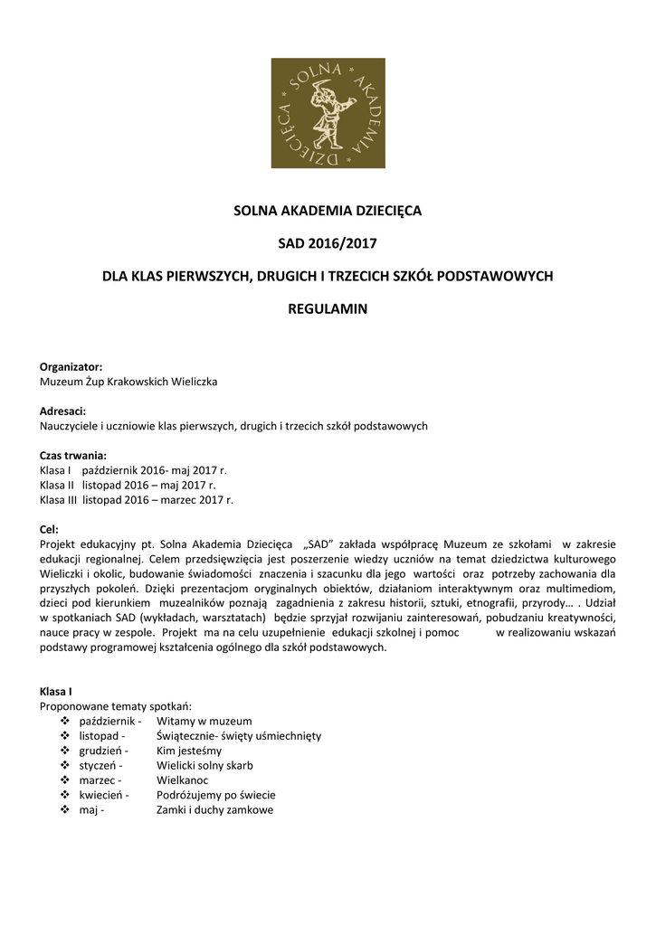 SOLNA AKADEMIA DZIECIĘCA SAD 2016/2017 DLA KLAS PIERWSZYCH, DRUGICH I TRZECICH SZKÓŁ PODSTAWOWYCH REGULAMIN Organizator: Muzeum Żup Krakowskich Wieliczka Adresaci: Nauczyciele i uczniowie klas pierwszych, drugich i trzecich szkół podstawowych Czas trwania: Klasa I październik 2016- maj 2017 r. Klasa II listopad 2016 – maj 2017 r. Klasa III listopad 2016 – marzec 2017 r. Cel: Projekt edukacyjny pt. Solna Akademia Dziecięca „SAD” zakłada współpracę Muzeum ze szkołami w zakresie edukacji regionalnej. Celem przedsięwzięcia jest poszerzenie wiedzy uczniów na temat dziedzictwa kulturowego Wieliczki i okolic, budowanie świadomości znaczenia i szacunku dla jego wartości oraz potrzeby zachowania dla przyszłych pokoleń. Dzięki prezentacjom oryginalnych obiektów, działaniom interaktywnym oraz multimediom, dzieci pod kierunkiem muzealników poznają zagadnienia z zakresu historii, sztuki, etnografii, przyrody… . Udział w spotkaniach SAD (wykładach, warsztatach) będzie sprzyjał rozwijaniu zainteresowań, pobudzaniu kreatywności, nauce pracy w zespole. Projekt ma na celu uzupełnienie edukacji szkolnej i pomoc w realizowaniu wskazań podstawy programowej kształcenia ogólnego dla szkół podstawowych. Klasa I Proponowane tematy spotkań: październik - Witamy w muzeum listopad Świątecznie- święty uśmiechnięty grudzień Kim jesteśmy styczeń Wielicki solny skarb marzec Wielkanoc kwiecień Podróżujemy po świecie maj Zamki i duchy zamkowe Klasa II Proponowane tematy spotkań: listopad Wieliczka – moje miasto grudzień Barbórkowe tradycje styczeń Archeologiczne tajemnice marzec Tropiciele górniczej techniki kwiecień Zamki w moim regionie maj Tajemnice ukryte w obrazach Klasa III Proponowane tematy spotkań listopad Herb naszego miasta styczeń Podziemne żywioły marzec Ginące zawody w Polsce Warunki uczestnictwa: - Zajęcia w Zamku Żupnym lub w ekspozycji muzeum w kopalni będą odbywały się w grupach do 25 osób w ustalonych wcześniej terminach. Ilość miejsc jest ograniczona, o przyjęciu do SAD decyduje kolejność zgłoszeń. - Czas trwania do 60 minut. - Koszt uczestnictwa: w Zamku Żupnym – 3 zł/osoba, w kopalni – 9 zł/osoba. - Każdy słuchacz SAD otrzyma indeks. - Potwierdzeniem udziału studenta w zajęciach będzie podpis prowadzącego. - Słuchacz SAD zobowiązany jest do czynnego udziału w spotkaniach organizowanych przez Muzeum Żup Krakowskich Wieliczka. Udział w Solnej Akademii Dziecięcej jest równoznaczny z wyrażeniem zgody na : - gromadzenie, przetwarzanie i wykorzystanie przez Muzeum Żup Krakowskich Wieliczka danych osobowych uczestników w celach związanych z przyjęciem i udziałem w zajęciach Solnej Akademii Dziecięcej. - wykorzystanie wizerunku uczestników na zdjęciach i filmach wykonanych podczas zajęć Solnej Akademii Dziecięcej do celów informacji i promocji Muzeum Żup Krakowskich Wieliczka. Warunki zaliczenia roku: - obecność klas na wszystkich zajęciach zaplanowanych na rok akademicki - zgłaszanie się na zajęcia z indeksami - aktywny udział w zajęciach - na zajęciach majowych klasy pierwsze oddają wypełnione karty do księgi pamiątkowej Podsumowanie i zakończenie roku Klasy, które spełnią warunki zaliczenia roku zostaną zaproszone na uroczyste zakończenie Solnej Akademii Dziecięcej podczas której otrzymają dyplomy i upominki. Regulamin jest dostępny na www.muzeum.wieliczka.pl Szczegółowe informacje: Dział Edukacji, tel. 12 289 16 33