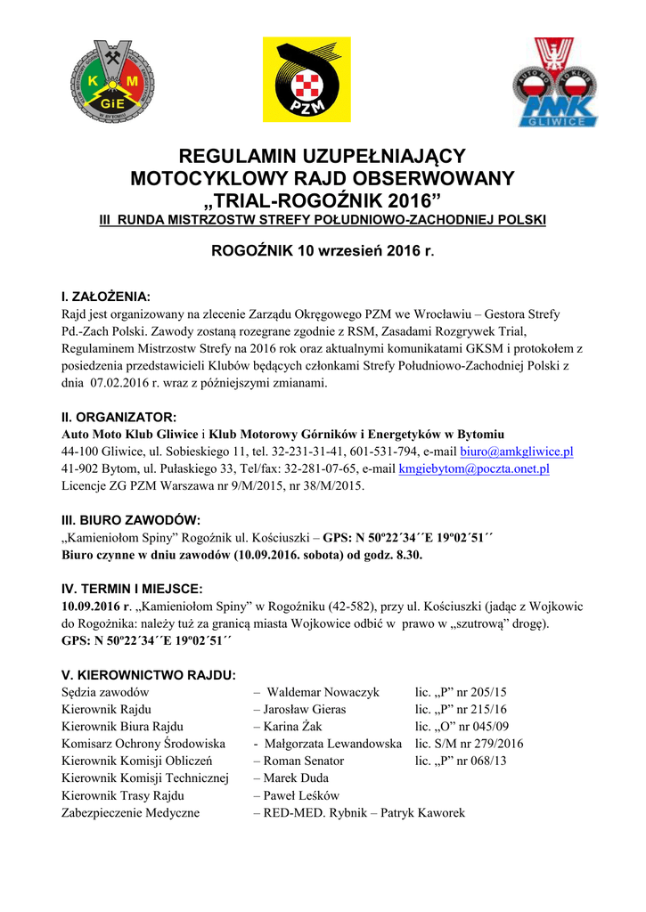 REGULAMIN UZUPEŁNIAJĄCY MOTOCYKLOWY RAJD OBSERWOWANY „TRIAL-ROGOŹNIK 2016” III RUNDA MISTRZOSTW STREFY POŁUDNIOWO-ZACHODNIEJ POLSKI ROGOŹNIK 10 wrzesień 2016 r. I. ZAŁOŻENIA: Rajd jest organizowany na zlecenie Zarządu Okręgowego PZM we Wrocławiu – Gestora Strefy Pd.-Zach Polski. Zawody zostaną rozegrane zgodnie z RSM, Zasadami Rozgrywek Trial, Regulaminem Mistrzostw Strefy na 2016 rok oraz aktualnymi komunikatami GKSM i protokołem z posiedzenia przedstawicieli Klubów będących członkami Strefy Południowo-Zachodniej Polski z dnia 07.02.2016 r. wraz z późniejszymi zmianami. II. ORGANIZATOR: Auto Moto Klub Gliwice i Klub Motorowy Górników i Energetyków w Bytomiu 44-100 Gliwice, ul. Sobieskiego 11, tel. 32-231-31-41, 601-531-794, e-mail [email protected] 41-902 Bytom, ul. Pułaskiego 33, Tel/fax: 32-281-07-65, e-mail [email protected] Licencje ZG PZM Warszawa nr 9/M/2015, nr 38/M/2015. III. BIURO ZAWODÓW: „Kamieniołom Spiny” Rogoźnik ul. Kościuszki – GPS: N 50º22´34´´E 19º02´51´´ Biuro czynne w dniu zawodów (10.09.2016. sobota) od godz. 8.30. IV. TERMIN I MIEJSCE: 10.09.2016 r. „Kamieniołom Spiny” w Rogoźniku (42-582), przy ul. Kościuszki (jadąc z Wojkowic do Rogożnika: należy tuż za granicą miasta Wojkowice odbić w prawo w „szutrową” drogę). GPS: N 50º22´34´´E 19º02´51´´ V. KIEROWNICTWO RAJDU: Sędzia zawodów Kierownik Rajdu Kierownik Biura Rajdu Komisarz Ochrony Środowiska Kierownik Komisji Obliczeń Kierownik Komisji Technicznej Kierownik Trasy Rajdu Zabezpieczenie Medyczne – Waldemar Nowaczyk lic. „P” nr 205/15 – Jarosław Gieras lic. „P” nr 215/16 – Karina Żak lic. „O” nr 045/09 - Małgorzata Lewandowska lic. S/M nr 279/2016 – Roman Senator lic. „P” nr 068/13 – Marek Duda – Paweł Leśków – RED-MED. Rybnik – Patryk Kaworek VI. KONKURENCJE: Indywidualne Mistrzostwa Strefy (IMS) Klubowe Mistrzostwa Strefy (KMS) Indywidualne Zawody TRIAL (IZT) – „Trial- Rogoźnik 2016” VII. KLASYFIKACJA: W ramach konkurencji indywidualnych zawodnicy i uczestnicy rywalizować będą w klasach: Junior, Otwarta, Weteran i Amator. Wszyscy zawodnicy i zawodniczki, z wyjątkiem kl. Amator, muszą legitymować się ważną licencją sportową i aktualnymi badaniami lekarskimi! Klasa Junior: (do 23 lat włącznie) – dla mężczyzn i kobiet z ważnymi licencjami, urodzonych nie później niż w 2006 r. Zawodnicy w wieku od 10 do 12 lat startują na motocyklu o pojemności silnika do 50 cm3. Zawodnicy w wieku od 12 do 16 lat startują na motocyklu o pojemności silnika do 125 ccm. Pozostali zawodnicy startują na dowolnym motocyklu odpowiednim do posiadanych uprawnień. Karta punktowa z napisem „JU”. Klasa Otwarta: dla zawodników i zawodniczek z ważnymi licencjami sportowymi, bez ograniczeń wiekowych, na dowolnym motocyklu odpowiednim do posiadanych uprawnień. Karta punktowa z napisem „OT”. Klasa Weteran: ( od 40 lat włącznie ) – dla zawodników i zawodniczek z ważnymi licencjami sportowymi, urodzonych nie później niż w 1976 r., na dowolnym motocyklu, odpowiednim do posiadanych uprawnień. Karta punktowa z napisem „WE”. Klasa Amator: dla uczestników bez licencji, urodzonych nie później niż w 2006 r. Uczestnicy w wieku od 10 do 12 lat włącznie startują na motocyklach o pojemności silnika do 50 ccm. Uczestnicy w wieku od 13 do 17 lat włącznie startują na motocyklu o pojemności silnika do 125 ccm. Uczestnicy pełnoletni startują na dowolnym motocyklu. W klasie „Amator” nie prowadzi się klasyfikacji generalnej. VIII. TRASA I CZAS JAZDY: Cztery okrążenia po 3 km dla Rajdu Rogoźnik 2016. Jedno okrążenie składa się z 8-miu odcinków obserwowanych ( OJO ). Obowiązujący łączny czas przejazdu wynosi 240 minut ( 4,0 h). Nie wprowadza się limitu czasu na pokonanie pojedynczego odcinka ( OJO ). Organizator przeprowadza pomiar czasu na mecie zawodów i wpisuje czas na karcie punktowej. IX. ODCINKI JAZDY OBSERWOWANEJ (sekcje) – OJO: Sekcja podstawowa dla Grupy „C” – bardzo łatwa Sekcja ograniczona tylko tablicami początku („1”) i końca („K”) sekcji oraz taśmami. Zawodnicy i uczestnicy ( kl. Amator) mogą pokonać OJO dowolnym śladem, również pojechać śladem dla Grupy „A” lub „B”, jednakże uszkodzenie oznaczenia ( w tym strzałek ) dla tych grup będzie traktowane jako błąd za 5 pkt. Numery startowe –czarne cyfry na żółtym tle. Karty drogowe koloru żółtego. Sekcja grupy „B” – łatwa Sekcja ograniczona tablicami początku („1”) i końca („K”) sekcji, taśmami oraz dodatkowymi łatwymi przeszkodami oznaczonymi strzałkami – bramkami w kolorze niebieskim. Zawodnik rywalizujący w grupie „B” musi przejechać wszystkie bramki wyłącznie dla śladu „B”. Numery startowe – czarne cyfry na białym tle z niebieską kwadratowa naklejka na piersi. Karty drogowe w kolorze niebieskim. Sekcja grupy „A” – trudna Sekcja ograniczona tablicami początku („1”) i końca („K”) sekcji, taśmami oraz dodatkowymi trudnymi przeszkodami oznaczonymi strzałkami – bramkami w kolorze czerwonym. Zawodnik rywalizujący w grupie „A” musi przejechać wszystkie bramki wyłącznie dla śladu „A”. Numery startowe – czarne cyfry na białym tle z czerwoną kwadratowa naklejką na piersi. Karty drogowe w kolorze czerwonym. X. KLASYFIKACJA W ZAWODACH 1. Wybór trudności sekcji (Grupy) przez zawodnika następuje na zasadzie dobrowolności za wyjątkiem klasy „Weteran” i „Amator”, które rywalizują wyłącznie na sekcjach Grupy „C”. Wybór Grupy musi być zaznaczony na Karcie zgłoszenia do zawodów. Zawodnik na I miejscu w grupie niższej zajmuje miejsce po ostatnim zawodniku grupy wyższej. Najwyższą Grupą jest Grupa „A”, a najniższą grupa „C”. Za prawidłowe zgłoszenie do zawodów odpowiedzialny jest zawodnik, który podpisuje zgłoszenie i znajomość regulaminów. 2. Warunkiem 