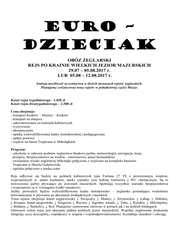 EURO – DZIECIAK OBÓZ ŻEGLARSKI REJS PO KRAINIE WIELKICH JEZIOR MAZURSKICH 29.07 – 05.08.2017 r. LUB 05.08 – 12.08.2017 r. Istnieje możliwość uczestnictwa w dwóch turnusach rejsów żeglarskich. Planujemy zróżnicować trasy rejsów w południowej części Mazur. Koszt rejsu tygodniowego - 1.450 zł Koszt rejsu dwutygodniowego – 2.500 zł Cena obejmuje: - transport Kraków – Mazury – Kraków - transport na miejscu - zakwaterowanie na łodziach kabinowych - wyżywienie - ubezpieczenie - opiekę wykwalifikowanej kadry instruktorskiej i pedagogicznej - opłaty portowe - wejście na basen Tropicana w Mikołajkach Program: - szkolenie w zakresie podstaw żeglarstwa (budowa jachtu, meteorologia, nawigacja, locja, przepisy, bezpieczeństwo na wodzie - ratownictwo, prace bosmańskie) - zwiedzanie wioski żeglarskiej Mikołajki połączone z wejściem na kompleks basenów Tropicana w Hotelu Gołębiewski - ogniska połączone z nauką szant Rejs odbywać się będzie na jachtach kabinowych typu Fortuna 27 TS o przestronnym wnętrzu, wyposażonych w: aneks kuchenny, aneks sypialny oraz kabinę toaletową z WC chemicznym. Są to nowoczesne jachty pływające po jeziorach mazurskich. Spełniają wszystkie warunki bezpieczeństwa i wyposażone są w wymagane środki ratunkowe. Jachty prowadzić będzie wykwalifikowana kadra instruktorsko – żeglarska posiadająca wieloletnie doświadczenie w pływaniu po akwenach śródlądowych i morskich. Trasa rejsów obejmuje kanał węgorzewski, j. Święcajty, j. Mamry, j. Sztynorckie, j. Łabap, j. Dobskie, j. Kisajno, kanał niegociński, j. Niegocin, j. Boczne, j. Jagodne, kanały, j. Tałty, j. Ryńskie, j. Mikołajskie, j. Bełdany, j. Śniardwy, j. Roś. Planujemy cumowanie zarówno w portach jak i na dzikich bindugach. Głównym celem rejsu jest ukazanie piękna polskich jezior mazurskich. Wspólne żeglowanie doskonale integruje, uczy dyscypliny, współpracy w zespole i współodpowiedzialności. Kształtuje charakter i odwagę.