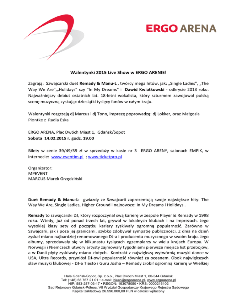 Walentynki 2015 Live Show w ERGO ARENIE! Zagrają: Szwajcarski duet Remady & Manu-L , twórcy mega hitów, jak: „Single Ladies”, „The Way We Are”,„Holidays” czy "In My Dreams" i Dawid Kwiatkowski - odkrycie 2013 roku. Najważniejszy debiut ostatnich lat. 18-letni wokalista, który szturmem zawojował polską scenę muzyczną zyskując dziesiątki tysięcy fanów w całym kraju. Walentynki rozgrzeją dj Marcus i dj Tonn, imprezę poprowadzą: dj Lokker, oraz Małgosia Piontke z Radia Eska ERGO ARENA, Plac Dwóch Miast 1, Gdańsk/Sopot Sobota 14.02.2015 r. godz. 19.00 Bilety w cenie 39/49/59 zł w sprzedaży w kasie nr 3 ERGO ARENY, salonach EMPiK, w internecie: www.eventim.pl ; www.ticketpro.pl Organizator: MPEVENT MARCUS Marek Grzędziński Duet Remady & Manu-L: gwiazdy ze Szwajcarii zaprezentują swoje największe hity: The Way We Are, Single Ladies, Higher Ground i najnowsze: In My Dreams i Holidays . Remady to szwajcarski DJ, który rozpoczynał swą karierę w zespole Player & Remady w 1998 roku. Wtedy, już od ponad trzech lat, grywał w lokalnych klubach i na imprezach. Jego wysokiej klasy sety od początku kariery zyskiwały ogromną popularność. Zarówno w Szwajcarii, jak i poza jej granicami, szybko zdobywał sympatię publiczności. Z dnia na dzień zyskał miano najbardziej renomowanego DJ-a i producenta muzycznego w swoim kraju. Jego albumy, sprzedawały się w kilkunastu tysiącach egzemplarzy w wielu krajach Europy. W Norwegii i Niemczech utwory artysty zajmowały tygodniami pierwsze miejsca list przebojów, a w Danii płyty zyskiwały miano złotych. Kontrakt z największą wytwórnią muzyki dance w USA, Ultra Records, przyniósł DJ-owi popularność również za oceanem. Obok największych sław muzyki klubowej - DJ-a Tiesto i Guru Josha – Remady zrobił ogromną karierę w Wielkiej Hala Gdańsk-Sopot, Sp. z o.o., Plac Dwóch Miast 1, 80-344 Gdańsk Tel: (+48) 58 767 21 01 • e-mail: [email protected], www.ergoarena.pl NIP: 583-287-03-17 • REGON: 193078050 • KRS: 0000216102 Sąd Rejonowy Gdańsk-Północ, VII Wydział Gospodarczy Krajowego Rejestru Sądowego Kapitał zakładowy 26.596.000,00 PLN w całości wpłacony Brytanii. Do jednego z największych hitów artysty należy utwór „Give Me A Sign”, nagrany przy współpracy z Manu-L, wokalistą zespołu Myron. Emanuel Gut lepiej znany pod pseudonimem Manu-L, jest szwajcarskim piosenkarzem i muzykiem. Jest wokalistą i gitarzystą szwajcarskiego pop duetu zespołu Myrona. Duet ten został utworzony w 2003 roku w Bazylei z tekściarzem, gitarzystą i basistą Chrisem Haffner. Zespół ma cztery albumy i wiele singli, a z wykresów wynika, że najbardziej znanym singielem jest "One Step Closer", który dotarł na 9 miejsce w szwajcarskim Hitparade, czyli Oficjalnej liście szwajcarskich przebojów. Od 2010 roku współpracuje z szwajcarskim DJ-em, Remady'm. Dawid Kwiatkowski to odkrycie roku 2013. Swoją przygodę z muzyką zaczął dwa lata temu, uczestnicząc w konkursie „Askana Łowi Talenty’”, gdzie zajął pierwsze miejsce. Odniesiony sukces zainspirował go do kontynuowania muzycznej kariery. W międzyczasie prowadził blogi, od których wszystko się zaczęło. Dawid rozpoczął nagrywanie coverów znanych utworów, które umieszczał portalu YouTube.com. Nagrania te okazały się ogromnym sukcesem, co potwierdzają setki tysięcy wyświetleń oraz pozytywnych komentarzy pod nimi. Od tego momentu Dawid zaczął skupiać wokół siebie dużą liczbę fanów, którzy pokochali go za świetny głos, charakter, wygląd i niespotykaną charyzmę. Publiczne wystąpienia Dawida gromadzą setki i tysiące fanów, którzy są w stanie przejechać dla niego całą Polskę. Dawid, mimo swojego młodego wieku, jest bardzo odpowiedzialnym i pracowitym nastolatkiem. Samodzielnie pracuje przy prowadzeniu swoich blogów, profilu na YouTube, fanpage’a na portalu Facebook (ponad 142 tysięcy kliknięć „lubię to”), do tego osiąga coraz większą liczbę obserwujących na portalach takich jak Twitter oraz Instagram. Co ciekawe artysta jest bardzo mocno związany ze swoimi fanami, którzy mają ogromny wpływ na jego działania i twórczość, co potwierdza fakt ciągłej aktywności na stronie ask.fm. 19 listopada 2013 r. miała premierę debiutancka płyta Dawida pt. 9898. Większość tekstów jest jego autorstwa , a materiał nagrano w dużej części na żywych instrumentach ( m.in. kwartet smyczkowy w utworze 'Teraz boje się'). Mastering płyty robiony był we Francji w studiu, gdzie pracowano przy albumach takich artystów jak David Guetta, Avicii czy Kanye West. Na longplayu znajdują się dwa duety - z Patrykiem Kumorem oraz Jayem Delano oraz utwór autorstwa Eweliny Lisowskiej pt. Na Zawsze. 9893 idealnie odzwierciedla osobowość Dawida, który zaprezentował się na tym albumie w wielu różnych odsłonach. 28 maja 2014 ukazał się drugi album artysty zatytułowany 9893 Akustycznie, zawierający utwory z debiutanckiego wydawnictwa w zupełnie nowych, akustycznych aranżacjach. Hala Gdańsk-Sopot, Sp. z o.o., Plac Dwóch Miast 1, 80-344 Gdańsk Tel: (+48) 58 767 21 01 • e-mail: [email protected], www.ergoarena.pl NIP: 583-287-03-17 • REGON: 193078050 • KRS: 0000216102 Sąd Rejonowy Gdańsk-Północ, VII Wydział Gospodarczy Krajowego Rejestru Sądowego Kapitał zakładowy 26.596.000,00 PLN w całości wpłacony