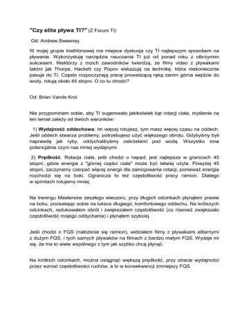 "Czy elita pływa TI?" (Z Forum TI) Od: Andrew Sweeney W mojej grupie triathlonowej ma miejsce dyskusja czy TI najlepszym sposobem na pływanie. Wykorzystuję narzędzia nauczania TI już od ponad roku z olbrzymim sukcesem. Niektórzy z moich zawodników twierdzą, że filmy video z pływakami takimi jak Thorpe, Hackett czy Popov wskazują na technikę, która niekoniecznie pasuje do TI. Często rozpoczynają pracę prowadzącą ręką zanim górna wejdzie do wody, rotują około 45 stopni. O co tu chodzi? Od: Brian Vande Krol Nie przypominam sobie, aby TI sugerowało jakikolwiek kąt rotacji ciała, myślenie na ten temat zależy od dwóch warunków: 1) Wydajność oddechowa. Im więcej rotujesz, tym masz więcej czasu na oddech. Jeśli oddech stwarza problemy, potrzebujesz użyć większego obrotu. Gdybyśmy byli naprawdę jak ryby, oddychalibyśmy oskrzelami pod wodą. Wszystko inne potencjalnie czyni nas mniej wydajnymi. 2) Prędkość. Rotacja ciała, jeśli chodzi o napęd, jest najlepsza w granicach 45 stopni, gdzie energia z "górnej części ciała" może być łatwiej użyta. Powyżej 45 stopni, zaczynamy czerpać więcej energii dla zainicjowania rotacji, ponieważ energia rozchodzi się na boki. Ogranicza to też częstotliwość pracy ramion. Dlatego w sprintach rotujemy mniej. Na treningu Mastersów zeszłego wieczoru, przy długich odcinkach płynąłem prawie na boku, pozwalając sobie na luksus długiego, komfortowego oddechu. Na krótszych odcinkach, redukowałem obrót i zwiększałem częstotliwość (co również zwiększało częstotliwość mojego oddychania) i płynąłem szybciej. Jeśli chodzi o FQS (nałożenie się ramion), widziałem filmy z pływakami elitarnymi z dużym FQS, i tych samych pływaków na filmach z bardzo małym FQS. Wydaje mi się, że ma to wiele wspólnego z tym jak szybko chcą płynąć. Na krótkich odcinkach, można osiągnąć większą prędkość, przy utracie wydajności przez wzrost częstotliwości ruchów, a to w konsekwencji zmniejszy FQS. Od: Angus MacGowan Jest to ciekawy temat, jaki widziałem przewija się przez różne fora. Jedną rzecz, jaką chciałbym poruszyć jest to, że na poziomie olimpijskim pływak, który trenował metodami TI może się wiele nie różnić od pływaka trenującego tradycyjnie. Mamy przecież do czynienia z elitą, oni zawsze mają świetną technikę. Moje doświadczenie z TI podpowiada mi, że podkreśla się w jednakowym stopniu samą technikę, jak i sposób jej zdobycia. Wyjątkową jakością TI jest według mnie jej metodologia; unikalne jest jak rozkłada styl na komponenty i pozwala Tobie zbudować go od nowa przez świadome wykonywanie ćwiczeń i pływanie pełnym stylem. TI to bardziej filozofia nauki w trakcie treningu, niż dyktatu jakiejś techniki. To powiedziawszy: 1) Thorpe był bardzo TI, jeśli chodzi o FQS gdy pływał 400 i 800. Na filmie jego i Hacketta kręconym z góry podczas wyścigu na 800m na Mistrzostwach świata, obydwaj mają wyraźne FQS. Zmieniło się ono nieco u Thorpa, gdy przeszedł do sprintu. Jednak Thorpe bardzo patrzy się przed siebie - nie bardzo TI, ale kiedy jest się jednym na milion, można robić rzeczy, które reszcie z nas nie uszłyby na sucho. 2) Popov, z drugiej strony, na filmach jakie widziałem, wydaje się pływać z ramionami jak wiatrakami, z bardzo małym FQS, ale jego rozluźnienie i cierpliwy chwyt wody są wręcz magiczne. Są to cechy TI, choć nie atrybuty techniki, ale niemniej istotne. 3) Hackett, może nie ma technicznych atrybutów dwóch wyżej wymienionych pływaków, ale ma 198 wzrostu, kolosalną pojemnością płuc (VO2) i niebywałą wolę walki. Cechą wspólną jest to, że wszyscy są otwarci na nauczanie. Każdy z nich poszukuje nowych pomysłów i metod, a nie tylko bazuje na "ciężkiej pracy" (choć to też robią). To poszukiwanie wiedzy jest właśnie tym, o co chodzi w TI. Od: Terry Laughlin Zawsze mile wdziane są pytania dotyczące filozofii TI, a to pytanie w oparciu o filmy światowej klasy pływaków, pojawia się często. Myślę, że oglądając tego typu filmy należy pamiętać o: 1) Są zawsze robione na zawodach, jest bardziej praktyczne zobaczyć, co oni robią na treningach - co stanowi 98% czasu ich pływania. Jeśli miałeś możliwość obejrzenia takich filmów, odniósłbyś inne wrażenie. Oglądałem w sumie Popova trenującego lub rozgrzewającego się przez ok. 5-6 godzin, oglądałem go ścigającego się w sumie przez kilka minut. Na treningach pływał z bardzo dużym FQS, z SPL (ilość ruchów na długości basenu) 24 na 50 metrowym basenie, w porównaniu z SPL 32 w wyścigu na 50-tkę. Tak intensywne utrwalanie wydajnego kroku pływackiego na treningu, pozwalało mu ścigać się na wyższym poziomie efektywności od rywali. Wygrał wiele wyścigów na ostatnich metrach, kiedy wszyscy pozostali zwalniali. Bez obejrzenia filmu jego z treningów lub jego wyścigów w porównaniu z innymi zawodnikami, niemożliwe jest dostrzeżenie tych różnic. Jeśli widzieliście film ze mną podczas wyścigu na wodach otwartych, moglibyście stwierdzić: "Terry wcale nie robi tego, czego uczy", ale gdybyście zobaczyli mnie trenującego, doszlibyście do innych wniosków. Z drugiej strony, gdybyście obejrzeli film znad wody z mojego wyścigu na wodach otwartych (wkrótce na Youtube) i porównali moje pływanie z ludźmi wokół, zobaczylibyście efekt tego jak trenuję. 2) Film, jaki oglądasz jest zawsze pewnym urywkiem, pokazującym jak dany zawodnik pływał w danym momencie. Czego się nie możemy dowiedzieć to tego, czy jest to ich najlepsza technika do jakiej aspirują. Pomimo, że był najlepszym średniodystansowcem ostatnich lat, Thorpe stał się mniejszym zagrożeniem, ponieważ jego rywale uczyli się od niego i naśladowali jego technikę. Wskutek czego ostatnio zaangażował specjalistę do swojego zespołu trenerskiego, do pracy nad jego techniką. Ta osoba to podopieczny Billa Boo