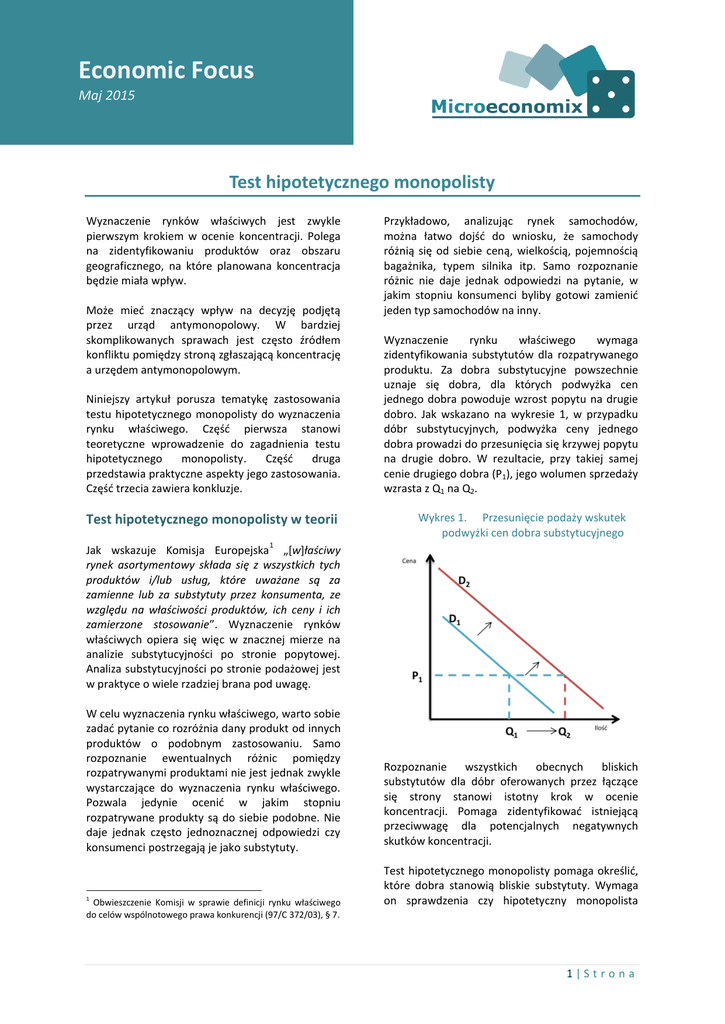 Economic Focus Maj 2015 Test hipotetycznego monopolisty Wyznaczenie rynków właściwych jest zwykle pierwszym krokiem w ocenie koncentracji. Polega na zidentyfikowaniu produktów oraz obszaru geograficznego, na które planowana koncentracja będzie miała wpływ. Może mieć znaczący wpływ na decyzję podjętą przez urząd antymonopolowy. W bardziej skomplikowanych sprawach jest często źródłem konfliktu pomiędzy stroną zgłaszającą koncentrację a urzędem antymonopolowym. Niniejszy artykuł porusza tematykę zastosowania testu hipotetycznego monopolisty do wyznaczenia rynku właściwego. Część pierwsza stanowi teoretyczne wprowadzenie do zagadnienia testu hipotetycznego monopolisty. Część druga przedstawia praktyczne aspekty jego zastosowania. Część trzecia zawiera konkluzje. Test hipotetycznego monopolisty w teorii Przykładowo, analizując rynek samochodów, można łatwo dojść do wniosku, że samochody różnią się od siebie ceną, wielkością, pojemnością bagażnika, typem silnika itp. Samo rozpoznanie różnic nie daje jednak odpowiedzi na pytanie, w jakim stopniu konsumenci byliby gotowi zamienić jeden typ samochodów na inny. Wyznaczenie rynku właściwego wymaga zidentyfikowania substytutów dla rozpatrywanego produktu. Za dobra substytucyjne powszechnie uznaje się dobra, dla których podwyżka cen jednego dobra powoduje wzrost popytu na drugie dobro. Jak wskazano na wykresie 1, w przypadku dóbr substytucyjnych, podwyżka ceny jednego dobra prowadzi do przesunięcia się krzywej popytu na drugie dobro. W rezultacie, przy takiej samej cenie drugiego dobra (P1), jego wolumen sprzedaży wzrasta z Q1 na Q2. Wykres 1. Przesunięcie podaży wskutek podwyżki cen dobra substytucyjnego 1 Jak wskazuje Komisja Europejska „[w]łaściwy rynek asortymentowy składa się z wszystkich tych produktów i/lub usług, które uważane są za zamienne lub za substytuty przez konsumenta, ze względu na właściwości produktów, ich ceny i ich zamierzone stosowanie”. Wyznaczenie rynków właściwych opiera się więc w znacznej mierze na analizie substytucyjności po stronie popytowej. Analiza substytucyjności po stronie podażowej jest w praktyce o wiele rzadziej brana pod uwagę. W celu wyznaczenia rynku właściwego, warto sobie zadać pytanie co rozróżnia dany produkt od innych produktów o podobnym zastosowaniu. Samo rozpoznanie ewentualnych różnic pomiędzy rozpatrywanymi produktami nie jest jednak zwykle wystarczające do wyznaczenia rynku właściwego. Pozwala jedynie ocenić w jakim stopniu rozpatrywane produkty są do siebie podobne. Nie daje jednak często jednoznacznej odpowiedzi czy konsumenci postrzegają je jako substytuty. 1 Obwieszczenie Komisji w sprawie definicji rynku właściwego do celów wspólnotowego prawa konkurencji (97/C 372/03), § 7. Rozpoznanie wszystkich obecnych bliskich substytutów dla dóbr oferowanych przez łączące się strony stanowi istotny krok w ocenie koncentracji. Pomaga zidentyfikować istniejącą przeciwwagę dla potencjalnych negatywnych skutków koncentracji. Test hipotetycznego monopolisty pomaga określić, które dobra stanowią bliskie substytuty. Wymaga on sprawdzenia czy hipotetyczny monopolista 1|S t r o n a byłby w stanie zyskownie podnieść ceny o 5-10% na najmniejszym możliwym rynku. W przypadku uzyskania pozytywnej odpowiedzi, analizowany rynek uznany jest za rynek właściwy. W przypadku uzyskania negatywnej odpowiedzi, rozpatrywany rynek jest rozszerzony o najbliższy znany substytut. Następnie, sprawdzane jest czy hipotetyczny monopolista byłby w stanie podnieść ceny o 5-10% w tym rynku bez poniesienia strat. Wykres 2. Skutek podwyżki cen danego dobra na jego popyt Test polega na dodawaniu kolejnych substytutów do rozpatrywanego rynku aż do momentu znalezienia rynku, w którym hipotetyczny monopolista byłby w stanie zyskownie podnieść ceny o 5-10%. Tak wyznaczony rynek uznany jest za rynek właściwy. Test hipotetycznego monopolisty ma na celu zidentyfikowanie produktów, które są w silnej konkurencji. Brak zyskowności 5-10% podwyżki na analizowanym rynku sugeruje istnienie substytutów niezaliczonych do rynku. Dlatego też najbliższy substytut jest dodawany do rynku i zyskowność 5-10% podwyżki jest ponownie sprawdzana. Test hipotetycznego wymaga zrozumienia popytu występującego na rozpatrywanym rynku. Polega on na ustaleniu czy ewentualna podwyżka cen rozpatrywanych produktów doprowadziłaby do dużej utraty klientów. Utrata ta jest tym większa, im więcej bliskich substytutów nie zostało uwzględnionych w rozpatrywanym rynku. Test hipotetycznego monopolisty sprowadza się do porównania dwóch skutków 5-10% podwyżki cen, zilustrowanych na wykresie 2. W wyniku podwyżki cen z poziomu P1 na poziom P2 następuje spadek popytu z poziomu Q1 na poziom Q2. W rezultacie, mamy do czynienia z dwoma skutkami. Pierwszy skutek jest pozytywny i dotyczy zwiększonej marży na odbytych transakcjach. Zaznaczony on jest jako obszar A na wykresie 2. Drugi skutek jest negatywny i dotyczy utraconych transakcji w wyniku podwyżki cen. Zaznaczony jest jako obszar B na wykresie 2. Jeżeli pierwszy skutek przeważa drugi skutek, rozpatrywany rynek jest uznany za rynek właściwy. W przeciwnym przypadku, stwierdza się, że rynek właściwy jest szerszy od rozpatrywanego rynku. Test hipotetycznego praktyce monopolisty w Bezpośrednie zastosowanie Jak wskazano powyżej, test hipotetycznego monopolisty sprowadza się do sprawdzenia czy zwiększona marża w wyniku 5-10% podwyżki cen kompensuje utracone transakcje. W przypadku, gdy rozpatrywane jest tylko jedno dobro, można 2 posłużyć się następującym wzorem : gdzie T wskazuje o ile zmniejszy się liczba transakcji w wyniku 5% podwyżki cen, a m oznacza marżę. Jeżeli powyższy wzór daje wynik pozytywny, rozpatrywane dobro stanowi odrębny rynek właściwy. W przeciwnym przypadku, należy odpowiednio rozbudować powyższy wzór w cel