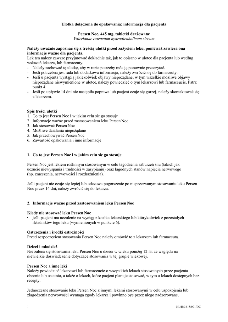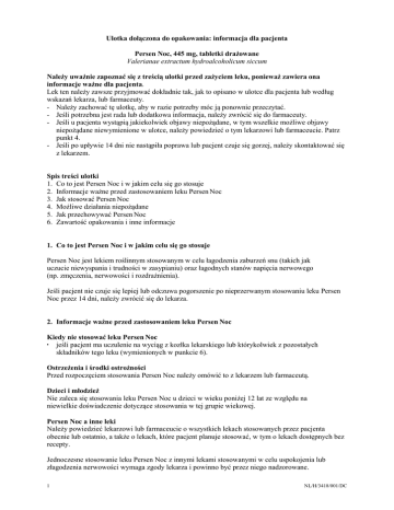 Ulotka dołączona do opakowania: informacja dla pacjenta Persen Noc, 445 mg, tabletki drażowane Valerianae extractum hydroalcoholicum siccum Należy uważnie zapoznać się z treścią ulotki przed zażyciem leku, ponieważ zawiera ona informacje ważne dla pacjenta. Lek ten należy zawsze przyjmować dokładnie tak, jak to opisano w ulotce dla pacjenta lub według wskazań lekarza, lub farmaceuty. - Należy zachować tę ulotkę, aby w razie potrzeby móc ją ponownie przeczytać. - Jeśli potrzebna jest rada lub dodatkowa informacja, należy zwrócić się do farmaceuty. - Jeśli u pacjenta wystąpią jakiekolwiek objawy niepożądane, w tym wszelkie możliwe objawy niepożądane niewymienione w ulotce, należy powiedzieć o tym lekarzowi lub farmaceucie. Patrz punkt 4. - Jeśli po upływie 14 dni nie nastąpiła poprawa lub pacjent czuje się gorzej, należy skontaktować się z lekarzem. Spis treści ulotki 1. Co to jest Persen Noc i w jakim celu się go stosuje 2. Informacje ważne przed zastosowaniem leku Persen Noc 3. Jak stosować Persen Noc 4. Możliwe działania niepożądane 5. Jak przechowywać Persen Noc 6. Zawartość opakowania i inne informacje 1. Co to jest Persen Noc i w jakim celu się go stosuje Persen Noc jest lekiem roślinnym stosowanym w celu łagodzenia zaburzeń snu (takich jak uczucie niewyspania i trudności w zasypianiu) oraz łagodnych stanów napięcia nerwowego (np. zmęczenia, nerwowości i rozdrażnienia). Jeśli pacjent nie czuje się lepiej lub odczuwa pogorszenie po nieprzerwanym stosowaniu leku Persen Noc przez 14 dni, należy zwrócić się do lekarza. 2. Informacje ważne przed zastosowaniem leku Persen Noc Kiedy nie stosować leku Persen Noc jeśli pacjent ma uczulenie na wyciąg z kozłka lekarskiego lub którykolwiek z pozostałych składników tego leku (wymienionych w punkcie 6). Ostrzeżenia i środki ostrożności Przed rozpoczęciem stosowania Persen Noc należy omówić to z lekarzem lub farmaceutą. Dzieci i młodzież Nie zaleca się stosowania leku Persen Noc u dzieci w wieku poniżej 12 lat ze względu na niewielkie doświadczenie dotyczące stosowania w tej grupie wiekowej. Persen Noc a inne leki Należy powiedzieć lekarzowi lub farmaceucie o wszystkich lekach stosowanych przez pacjenta obecnie lub ostatnio, a także o lekach, które pacjent planuje stosować, w tym o lekach dostępnych bez recepty. Jednoczesne stosowanie leku Persen Noc z innymi lekami stosowanymi w celu uspokojenia lub złagodzenia nerwowości wymaga zgody lekarza i powinno być przez niego nadzorowane. 1 NL/H/3418/001/DC Ciąża, karmienie piersią i wpływ na płodność Jeśli kobieta jest w ciąży lub karmi piersią, przypuszcza, że może być w ciąży lub gdy planuje mieć dziecko, powinna poradzić się lekarza lub farmaceuty przed zastosowaniem tego leku. Nie wiadomo, czy związki wchodzące w skład kozłka lekarskiego przenikają do mleka kobiecego. Ze względu na brak wystarczających danych nie zaleca się stosowania leku Persen Noc w okresie ciąży i karmienia piersią. Prowadzenie pojazdów i obsługiwanie maszyn Lek Persen Noc może wpływać na zdolność bezpiecznego prowadzenia pojazdów i obsługiwania maszyn. Pacjenci, u których lek zaburza zdolność wykonywania tych czynności, nie powinni prowadzić pojazdów ani obsługiwać maszyn. Persen Noc zawiera sacharozę Jeżeli stwierdzono u pacjenta nietolerancję niektórych cukrów, należy skontaktować się z lekarzem przed przyjęciem leku. 3. Jak stosować lek Persen Noc Ten lek należy zawsze stosować dokładnie tak, jak to opisano w ulotce dla pacjenta lub według zaleceń lekarza lub farmaceuty. W razie wątpliwości należy zwrócić się do lekarza lub farmaceuty. Młodzież w wieku powyżej 12 lat, dorośli i osoby w podeszłym wieku Zalecana dawka: łagodne stany napięcia nerwowego: 1 tabletka do 3 razy na dobę zaburzenia snu: 1 tabletka na pół do jednej godziny przed położeniem się spać. Jeśli to konieczne, można przyjąć dodatkową dawkę wcześniej wieczorem. Maksymalnie w ciągu doby można przyjąć 4 tabletki. Sposób stosowania Tabletki należy połykać popijając wystarczającą ilością płynu (najlepiej szklanką chłodnej wody). Tabletki są drażowane i należy je połykać w całości (tzn. bez przełamywania lub żucia) ze względu na nieprzyjemny zapach i smak wyciągu z kozłka. Czas trwania leczenia Działanie leku następuje stopniowo, dlatego nie należy go stosować w celu uzyskania natychmiastowej poprawy w łagodnym napięciu nerwowym lub zaburzeniach snu. Najlepsze efekty leczenia uzyskuje się stosując tabletki nieprzerwanie przez 2 do 4 tygodni. Stosowanie u dzieci Nie zaleca się stosowania tego leku u dzieci w wieku poniżej 12 lat ze względu na brak danych. Przyjęcie większej niż zalecana dawki leku Persen Noc W razie przyjęcia dawki większej niż zalecana, należy zwrócić się do lekarza lub farmaceuty. Przyjęcie zbyt dużej ilości tabletek (10 tabletek lub więcej) może wywołać uczucie zmęczenia, skurcze w jamie brzusznej, ucisk w klatce piersiowej, uczucie oszołomienia, drżenie rąk lub rozszerzenie źrenic. Objawy te ustępują zazwyczaj w ciągu 24 godzin. Pominięcie przyjęcia leku Persen Noc Pominięcie dawki leku nie ma znaczenia. W razie pominięcia dawki następną należy przyjąć o zwykłej porze. 2 NL/H/3418/001/DC Nie należy stosować dawki podwójnej w celu uzupełnienia pominiętej dawki. Przerwanie stosowania leku Persen Noc Stosowanie leku można przerwać w dowolnym momencie. W razie jakichkolwiek dalszych wątpliwości związanych ze stosowaniem tego leku, należy zwrócić się do lekarza lub farmaceuty. 4. Możliwe działania niepożądane Jak każdy lek, lek ten może powodować działania niepożądane, chociaż nie u każdego one wystąpią. Zgłaszano następujące działania niepożądane, choć ich częstości nie można określić na podstawie dostępnych danych: nudności, skurcze w jamie 