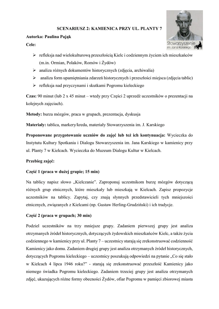 SCENARIUSZ 2: KAMIENICA PRZY UL. PLANTY 7 Autorka: Paulina Pająk Cele: refleksja nad wielokulturową przeszłością Kielc i codziennym życiem ich mieszkańców (m.in. Ormian, Polaków, Romów i Żydów) analiza różnych dokumentów historycznych (zdjęcia, archiwalia) analiza form upamiętniania zdarzeń historycznych i przeszłości miejsca (zdjęcia tablic) refleksja nad przyczynami i skutkami Pogromu kieleckiego Czas: 90 minut (lub 2 x 45 minut – wtedy przy Części 2 uprzedź uczestników o prezentacji na kolejnych zajęciach). Metody: burza mózgów, praca w grupach, prezentacja, dyskusja Materiały: tablica, markery/kreda, materiały Stowarzyszenia im. J. Karskiego Proponowane przygotowanie uczniów do zajęć lub też ich kontynuacja: Wycieczka do Instytutu Kultury Spotkania i Dialogu Stowarzyszenia im. Jana Karskiego w kamienicy przy ul. Planty 7 w Kielcach. Wycieczka do Muzeum Dialogu Kultur w Kielcach. Przebieg zajęć: Część 1 (praca w dużej grupie; 15 min) Na tablicy napisz słowo „Kielczanie”. Zaproponuj uczestnikom burzę mózgów dotyczącą różnych grup etnicznych, które mieszkały lub mieszkają w Kielcach. Zapisz propozycje uczestników na tablicy. Zapytaj, czy znają słynnych przedstawicieli tych mniejszości etnicznych, związanych z Kielcami (np. Gustaw Herling-Grudziński) i ich tradycje. Część 2 (praca w grupach; 30 min) Podziel uczestników na trzy mniejsze grupy. Zadaniem pierwszej grupy jest analiza otrzymanych źródeł historycznych, dotyczących żydowskich mieszkańców Kielc, a także życia codziennego w kamienicy przy ul. Planty 7 – uczestnicy starają się zrekonstruować codzienność Kamienicy jako domu. Zadaniem drugiej grupy jest analiza otrzymanych źródeł historycznych, dotyczących Pogromu kieleckiego – uczestnicy poszukują odpowiedzi na pytanie „Co się stało w Kielcach 4 lipca 1946 roku?” - starają się zrekonstruować przeszłość Kamienicy jako niemego świadka Pogromu kieleckiego. Zadaniem trzeciej grupy jest analiza otrzymanych zdjęć, ukazujących różne formy obecności Żydów, ofiar Pogromu w pamięci zbiorowej miasta – starają się zrekonstruować teraźniejszość Kamienicy jako miejsca odzyskanej pamięci. Grupy mają 30 minut na przedyskutowanie tych kwestii i zapisanie ich na kartach „Dom”, „Świadek Pogromu”, „Miejsce odzyskanej pamięci”. Materiały dla każdej grupy są obszerne – uczestnicy muszą podzielić między siebie teksty i zdjęcia, a potem wspólnie dokonać syntezy i sformułować wnioski. Sprzyja to współpracy i zaangażowaniu wszystkich uczniów. Ważne jest Twoje wsparcie – na bieżąco wyjaśniaj trudne terminy i niejasności. Część 3 (prezentacje; 30 min) Kolejno każda grupa prezentuje inny wymiar kamienicy przy ul. Planty 7 (1.Dom – 2.Świadek Pogromu – 3.Miejsce odzyskanej pamięci). Każda prezentacja trwa 15 minut. Część 4 Omówienie ćwiczenia i ewaluacja (dyskusja; 15 min) Przykładowe pytania: Czego dowiedzieliście się o przeszłości Kielc? Co Was zaskoczyło? Materiały Stowarzyszenia im. Jana Karskiego dla uczestników: 1. GRUPA 1: DOM DOM KAMIENICA PRZY UL. PLANTY 7 - Jak żyli na co dzień żydowscy mieszkańcy Kielc? - Jakie trudności mieli mieszkańcy Kamienicy? Jak je rozwiązywali? Materiały: [Pdf Scenariusz2 Gr1 Dom] 1. Zdjęcia i dokumenty przedstawiające codzienność żydowskich mieszkańców Kielc. 2. Różne dokumenty historyczne, ukazujące życie mieszkańców Kamienicy przy ul. Planty 7. 3. „Żydzi w Kielcach” Marek Maciągowski (Ludzie ludziom, Stowarzyszenie im. Jana Karskiego, Kielce 2009). GRUPA 2: ŚWIADEK POGROMU GRUPA 2: ŚWIADEK POGROMU KAMIENICA PRZY UL. PLANTY 7 - Co stało się w Kielcach 4 lipca 1946 roku? Materiały: 1. „Pogrom Żydów w Kielcach 4 VII 1946” dr hab. Bożeny Szaynok z Uniwersytetu Wrocławskiego (Ludzie ludziom, Stowarzyszenie im. Jana Karskiego, Kielce 2009). 2. Zdjęcia i dokumenty, ukazujące Pogrom kielecki. [Pdf Scenariusz2 Gr2 Pogrom] GRUPA 3: MIEJSCE ODZYSKANEJ PAMIĘCI GRUPA 3: MIEJSCE ODZYSKANEJ PAMIĘCI KAMIENICA PRZY UL. PLANTY 7 - Jak przywracano pamięć o Pogromie kieleckim? - Czym różnią się narracje na tablicach upamiętniających ofiary Pogromu? Materiały: 1. Zdjęcia przedstawiające tablice, upamiętniające ofiary Pogromu. [Pdf Scenariusz2 Gr3 Pamięć] 2. Chodzi „tylko” o naprawianie świata... Rozmowa z Bogdanem Białkiem. „Słowo Żydowskie" 07/2011