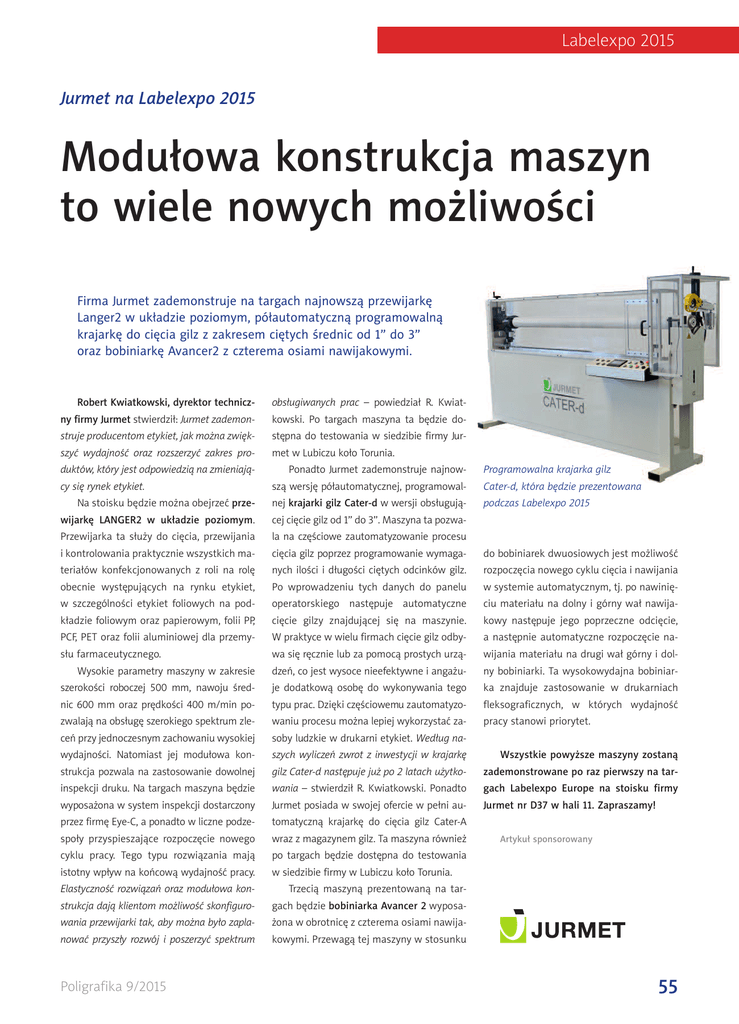 Labelexpo 2015 Jurmet na Labelexpo 2015 Modułowa konstrukcja maszyn to wiele nowych możliwości Firma Jurmet zademonstruje na targach najnowszą przewijarkę Langer2 w układzie poziomym, półautomatyczną programowalną krajarkę do cięcia gilz z zakresem ciętych średnic od 1” do 3” oraz bobiniarkę Avancer2 z czterema osiami nawijakowymi. Robert Kwiatkowski, dyrektor technicz- obsługiwanych prac – powiedział R. Kwiat- ny firmy Jurmet stwierdził: Jurmet zademon- kowski. Po targach maszyna ta będzie do- struje producentom etykiet, jak można zwięk- stępna do testowania w siedzibie firmy Jur- szyć wydajność oraz rozszerzyć zakres pro- met w Lubiczu koło Torunia. duktów, który jest odpowiedzią na zmieniający się rynek etykiet. Ponadto Jurmet zademonstruje najnow- Programowalna krajarka gilz szą wersję półautomatycznej, programowal- Cater-d, która będzie prezentowana Na stoisku będzie można obejrzeć prze- nej krajarki gilz Cater-d w wersji obsługują- podczas Labelexpo 2015 wijarkę LANGER2 w układzie poziomym. cej cięcie gilz od 1” do 3”. Maszyna ta pozwa- Przewijarka ta służy do cięcia, przewijania la na częściowe zautomatyzowanie procesu i kontrolowania praktycznie wszystkich ma- cięcia gilz poprzez programowanie wymaga- do bobiniarek dwuosiowych jest możliwość teriałów konfekcjonowanych z roli na rolę nych ilości i długości ciętych odcinków gilz. rozpoczęcia nowego cyklu cięcia i nawijania obecnie występujących na rynku etykiet, Po wprowadzeniu tych danych do panelu w systemie automatycznym, tj. po nawinię- w szczególności etykiet foliowych na pod- operatorskiego następuje automatyczne ciu materiału na dolny i górny wał nawija- kładzie foliowym oraz papierowym, folii PP, cięcie gilzy znajdującej się na maszynie. kowy następuje jego poprzeczne odcięcie, PCF, PET oraz folii aluminiowej dla przemy- W praktyce w wielu firmach cięcie gilz odby- a następnie automatyczne rozpoczęcie na- słu farmaceutycznego. wa się ręcznie lub za pomocą prostych urzą- wijania materiału na drugi wał górny i dol- Wysokie parametry maszyny w zakresie dzeń, co jest wysoce nieefektywne i angażu- ny bobiniarki. Ta wysokowydajna bobiniar- szerokości roboczej 500 mm, nawoju śred- je dodatkową osobę do wykonywania tego ka znajduje zastosowanie w drukarniach nic 600 mm oraz prędkości 400 m/min po- typu prac. Dzięki częściowemu zautomatyzo- fleksograficznych, w których wydajność zwalają na obsługę szerokiego spektrum zle- waniu procesu można lepiej wykorzystać za- pracy stanowi priorytet. ceń przy jednoczesnym zachowaniu wysokiej soby ludzkie w drukarni etykiet. Według na- wydajności. Natomiast jej modułowa kon- szych wyliczeń zwrot z inwestycji w krajarkę Wszystkie powyższe maszyny zostaną strukcja pozwala na zastosowanie dowolnej gilz Cater-d następuje już po 2 latach użytko- zademonstrowane po raz pierwszy na tar- inspekcji druku. Na targach maszyna będzie wania – stwierdził R. Kwiatkowski. Ponadto gach Labelexpo Europe na stoisku firmy wyposażona w system inspekcji dostarczony Jurmet posiada w swojej ofercie w pełni au- Jurmet nr D37 w hali 11. Zapraszamy! przez firmę Eye-C, a ponadto w liczne podze- tomatyczną krajarkę do cięcia gilz Cater-A społy przyspieszające rozpoczęcie nowego wraz z magazynem gilz. Ta maszyna również cyklu pracy. Tego typu rozwiązania mają po targach będzie dostępna do testowania istotny wpływ na końcową wydajność pracy. w siedzibie firmy w Lubiczu koło Torunia. Elastyczność rozwiązań oraz modułowa kon- Trzecią maszyną prezentowaną na tar- strukcja dają klientom możliwość skonfiguro- gach będzie bobiniarka Avancer 2 wyposa- wania przewijarki tak, aby można było zapla- żona w obrotnicę z czterema osiami nawija- nować przyszły rozwój i poszerzyć spektrum kowymi. Przewagą tej maszyny w stosunku Poligrafika 9/2015 Artykuł sponsorowany 55