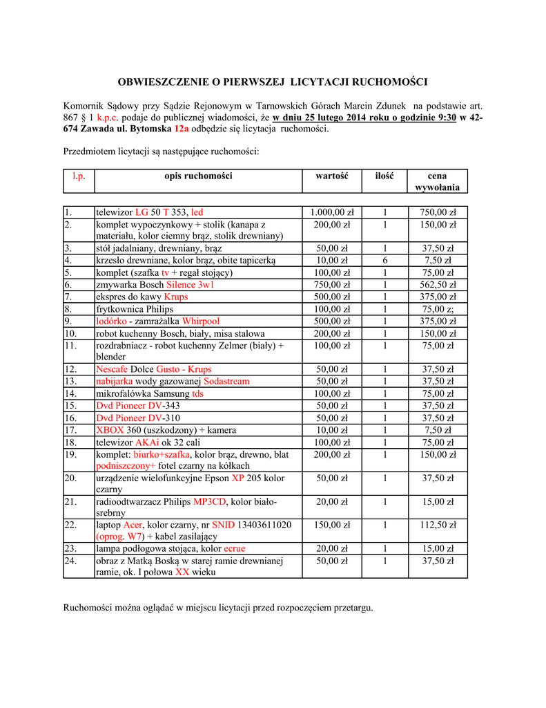 OBWIESZCZENIE O PIERWSZEJ LICYTACJI RUCHOMOŚCI Komornik Sądowy przy Sądzie Rejonowym w Tarnowskich Górach Marcin Zdunek na podstawie art. 867 § 1 k.p.c. podaje do publicznej wiadomości, że w dniu 25 lutego 2014 roku o godzinie 9:30 w 42674 Zawada ul. Bytomska 12a odbędzie się licytacja ruchomości. Przedmiotem licytacji są następujące ruchomości: l.p. 1. 2. 3. 4. 5. 6. 7. 8. 9. 10. 11. 12. 13. 14. 15. 16. 17. 18. 19. 20. 21. 22. 23. 24. opis ruchomości telewizor LG 50 T 353, led komplet wypoczynkowy + stolik (kanapa z materiału, kolor ciemny brąz, stolik drewniany) stół jadalniany, drewniany, brąz krzesło drewniane, kolor brąz, obite tapicerką komplet (szafka tv + regał stojący) zmywarka Bosch Silence 3w1 ekspres do kawy Krups frytkownica Philips lodórko - zamrażalka Whirpool robot kuchenny Bosch, biały, misa stalowa rozdrabniacz - robot kuchenny Zelmer (biały) + blender Nescafe Dolce Gusto - Krups nabijarka wody gazowanej Sodastream mikrofalówka Samsung tds Dvd Pioneer DV-343 Dvd Pioneer DV-310 XBOX 360 (uszkodzony) + kamera telewizor AKAi ok 32 cali komplet: biurko+szafka, kolor brąz, drewno, blat podniszczony+ fotel czarny na kółkach urządzenie wielofunkcyjne Epson XP 205 kolor czarny radioodtwarzacz Philips MP3CD, kolor białosrebrny laptop Acer, kolor czarny, nr SNID 13403611020 (oprog. W7) + kabel zasilający lampa podłogowa stojąca, kolor ecrue obraz z Matką Boską w starej ramie drewnianej ramie, ok. I połowa XX wieku wartość ilość cena wywołania 1.000,00 zł 200,00 zł 1 1 750,00 zł 150,00 zł 50,00 zł 10,00 zł 100,00 zł 750,00 zł 500,00 zł 100,00 zł 500,00 zł 200,00 zł 100,00 zł 1 6 1 1 1 1 1 1 1 37,50 zł 7,50 zł 75,00 zł 562,50 zł 375,00 zł 75,00 z; 375,00 zł 150,00 zł 75,00 zł 50,00 zł 50,00 zł 100,00 zł 50,00 zł 50,00 zł 10,00 zł 100,00 zł 200,00 zł 1 1 1 1 1 1 1 1 37,50 zł 37,50 zł 75,00 zł 37,50 zł 37,50 zł 7,50 zł 75,00 zł 150,00 zł 50,00 zł 1 37,50 zł 20,00 zł 1 15,00 zł 150,00 zł 1 112,50 zł 20,00 zł 50,00 zł 1 1 15,00 zł 37,50 zł Ruchomości można oglądać w miejscu licytacji przed rozpoczęciem przetargu.