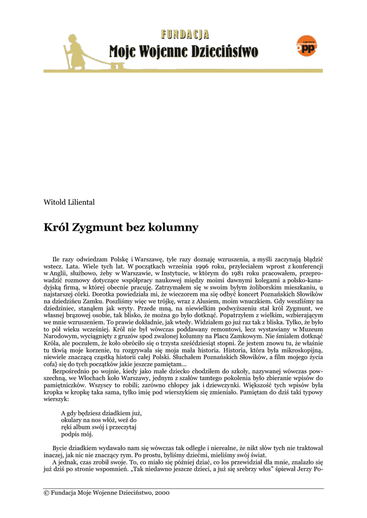 Witold Liliental Król Zygmunt bez kolumny Ile razy odwiedzam Polskę i Warszawę, tyle razy doznaję wzruszenia, a myśli zaczynają błądzić wstecz. Lata. Wiele tych lat. W początkach września 1996 roku, przyleciałem wprost z konferencji w Anglii, służbowo, żeby w Warszawie, w Instytucie, w którym do 1981 roku pracowałem, przeprowadzić rozmowy dotyczące współpracy naukowej między moimi dawnymi kolegami a polsko-kanadyjską firmą, w której obecnie pracuję. Zatrzymałem się w swoim byłym żoliborskim mieszkaniu, u najstarszej córki. Dorotka powiedziała mi, że wieczorem ma się odbyć koncert Poznańskich Słowików na dziedzińcu Zamku. Poszliśmy więc we trójkę, wraz z Alusiem, moim wnuczkiem. Gdy weszliśmy na dziedziniec, stanąłem jak wryty. Przede mną, na niewielkim podwyższeniu stał król Zygmunt, we własnej brązowej osobie, tak blisko, że można go było dotknąć. Popatrzyłem z wielkim, wzbierającym we mnie wzruszeniem. To prawie dokładnie, jak wtedy. Widziałem go już raz tak z bliska. Tylko, że było to pół wieku wcześniej. Król nie był wówczas poddawany remontowi, lecz wystawiany w Muzeum Narodowym, wyciągnięty z gruzów spod zwalonej kolumny na Placu Zamkowym. Nie śmiałem dotknąć Króla, ale poczułem, że koło obróciło się o trzysta sześćdziesiąt stopni. Że jestem znowu tu, że właśnie tu tkwią moje korzenie, tu rozgrywała się moja mała historia. Historia, która była mikroskopijną, niewiele znaczącą cząstką historii całej Polski. Słuchałem Poznańskich Słowików, a film mojego życia cofa} się do tych początków jakie jeszcze pamiętam... Bezpośrednio po wojnie, kiedy jako małe dziecko chodziłem do szkoły, nazywanej wówczas powszechną, we Włochach koło Warszawy, jednym z szałów tamtego pokolenia było zbieranie wpisów do pamiętniczków. Wszyscy to robili; zarówno chłopcy jak i dziewczynki. Większość tych wpisów była kropka w kropkę taka sama, tylko imię pod wierszykiem się zmieniało. Pamiętam do dziś taki typowy wierszyk: A gdy będziesz dziadkiem już, okulary na nos włóż, weź do ręki album swój i przeczytaj podpis mój. Bycie dziadkiem wydawało nam się wówczas tak odległe i nierealne, że nikt słów tych nie traktował inaczej, jak nic nie znaczący rym. Po prostu, byliśmy dziećmi, mieliśmy swój świat. A jednak, czas zrobił swoje. To, co miało się później dziać, co los przewidział dla mnie, znalazło się już dziś po stronie wspomnień. „Tak niedawno jeszcze dzieci, a już się srebrzy włos” śpiewał Jerzy Po- © Fundacja Moje Wojenne Dzieciństwo, 2000 Witold Liliental, Król Zygmunt bez kolumny 2 łomski. Dziadkiem jestem od dziesięciu lat, od kilku miesięcy mam już drugiego wnuczka. Bez okularów nie przeczytam żadnego tekstu, a włosy, mocno przerzedzone, straciły dawną czerń i mogłyby, od biedy, służyć za kamuflaż na śniegu, (No, powiedzmy, takim lekko przybrudzonym). Zdążyłem już mieszkać nie tylko w Polsce, zobaczyć i przeżyć niejedno. Wiele dni, nocy i zdarzeń dawno poszło w niepamięć. Ale wspomnienia, właśnie te najdawniejsze, wydają się być najtrwalsze. Już do końca życia zostaną ze mną. Przekazywałem je niegdyś starszym córkom, opowiadam czasami swojej najmłodszej, czternastoletniej Claudii, urodzonej w Ameryce i mówiącej biegle po polsku; opowiem jeszcze, być może, wnukom. Nie były one znowu aż tak dramatyczne. Choć czas był podły, byłem zbyt mały, żeby w pełni zrozumieć grozę wojny i okupacji. Ale widocznie, atmosfera tamtych dni wywarła piętno na tyle silne, że obrazy z najwcześniejszych lat żywe są i ostre, jakby widziane wczoraj. Urodziłem się na osiem miesięcy przed wybuchem wojny. Od kiedy pamiętam, od kiedy datuje się moja świadomość, uczony byłem co wieczór każdy pacierz kończyć słowami: „... i daj Boziu, żeby tatuś wrócił”. Wiem, chociaż o tym dowiedziałem się już o wiele lat później, że moja Matka nie przestała kazać mi się modlić nawet wówczas, gdy znalazła nazwisko ojca na liście katyńskiej, drukowanej przez niemiecką gadzinówkę „Nowy Kurier Warszawski”. Na każde Boże Narodzenie i na kolejne Święta Wielkanocne, dzieliłem się opłatkiem, bądź jajeczkiem, z fotografią mężczyzny w mundurze oficerskim. Zdjęcie, mocno sfatygowane i ze śladami po tym dzieleniu się zachowało się i mam je do dziś. Wychowałem się z mamą, którą nazywałem Matusią, ale przy obcych miałem nazywać „chrzestną”. Moją piastunkę miałem przy obcych ludziach nazywać „Mamusią”. Nie tłumaczono mi dlaczego, ja nie pytałem. Wszystkie dzieci na podwórku wiedziały i rozumiały, że o różnych sprawach nie wolno głośno mówić, więc nie dziwiło mnie nic. Dopiero w kilka lat po wojnie Matka wyjawiła mi nasze prawdziwe nazwisko i wytłumaczyła, że chociaż jesteśmy i czujemy się Polakami, chociaż moi rodzice byli chrzczeni wiele lat przed moim przyjściem na świat, Niemcy i tak kazaliby nam iść do Getta, a tam niechybnie zginęlibyśmy. Dlatego dobrzy ludzie pomogli nam dostać lewe papiery i przeżyć. Wiedziałem, że Matusia uczy na czymś, co nazywała „tajnymi kompletami”. Słowa te nie były może w pełni zrozumiałe, ale tyle wiedziałem, że nie wolno o tym głośno mówić. Przychodziły do niej starsze dziewczynki, uczyły się różnych rzeczy, dla mnie całkiem niezrozumiałych, ale fascynujących. W wieku niecałych pięciu lat, siedząc pod stołem w rogu pokoju i przysłuchując się mimo woli lekcjom, nauczyłem się na pamięć „O roku ów, kto ciebie widział w naszym kraju”. Choć nic z tego nie rozumiałem, było tam mnóstwo o wojnie i o żołnierzach, co dobrze pasowało do mojej wizji świata. Żołnierze byli wszędzie. W szarozielonych mundurach. Kazano mi się ich wystrzegać, jak ognia. Uczono, żeby trzymać się od nich z daleka. Matusia prowadziła lekcje nie tylko w