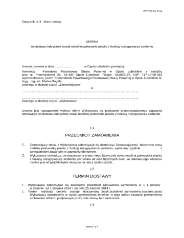 PTT.237.02.2014 Załącznik nr 3 - Wzór umowy UMOWA na dostawę fabrycznie nowej mobilnej pakowarki piasku z funkcją rozsypywacza sorbentu Umowa zawarta w dniu ………………………. w Opolu Lubelskim pomiędzy: Komendą Powiatową Państwowej Straży Pożarnej w Opolu Lubelskim z siedzibą przy ul. Przemysłowej 25, 24-300 Opole Lubelskie, Regon: 431029197, NIP: 717-15-50-544 reprezentowaną przez Komendanta Powiatowego Państwowej Straży Pożarnej w Opolu Lubelskim st. bryg. mgr inż. Marka Gogóła zwanego w dalszej części „Zamawiającym” a ........................................................................................................................................ ......................................................................................................................................... zwanego w dalszej części „Wykonawcą” Umowa jest następstwem wyboru oferty Wykonawcy na podstawie przeprowadzonego zapytania ofertowego na dostawę fabrycznie nowej mobilnej pakowarki piasku z funkcją rozsypywacza sorbentu. §1 PRZEDMIOT ZAMÓWIENIA 1. 2. Zamawiający zleca, a Wykonawca zobowiązuje się dostarczyć Zamawiającemu fabrycznie nową mobilną pakowarkę piasku z funkcją rozsypywacza sorbentu, wykonaną zgodnie z wymaganiami zawartymi w zapytaniu ofertowym. Wykonawca oświadcza, że dostarczona przez niego fabrycznie nowa mobilna pakowarka piasku z funkcją rozsypywacza sorbentu jest wolna od wad fizycznych oraz, że stanowi jego własność i wolna jest od jakichkolwiek obciążeń na rzecz osób trzecich. §2 TERMIN DOSTAWY 1. 2. Wykonawca zobowiązuje się dostarczyć przedmiot zamówienia wymieniony w § 1 umowy w terminie od 1 sierpnia 2014 r. do dnia 25 sierpnia 2014 r. Termin realizacji umowy zostaje dotrzymany jeżeli przedmiot zamówienia zostanie przez Wykonawcę dostarczony w wyżej wymienionym terminie, a jego odbiór zostanie potwierdzony protokółem odbioru podpisanym przez obie strony bez zastrzeżeń. §3 Strona 1 z 4 PTT.237.02.2014 WYNAGRODZENIE 1. Za realizację przedmiotu zamówienia Zamawiający zapłaci Wykonawcy wynagrodzenie w wysokości: Wartość brutto przedmiotu zamówienia wynosi …………….. , ….. zł. (słownie złotych ……………………………………………….. ……/100). Stawka VAT: 8 % Przedmiot zamówienia jest objęty stawką VAT w wysokości 8 % na podstawie Ustawy z dnia 11 marca 2004 r. ( Dz. U. Nr 54, poz. 535) o podatku od towarów i usług przeznaczonych na cele ochrony przeciwpożarowej (129/1) Kwota VAT: ……………., ….. zł. Wartość netto przedmiotu zamówienia wynosi ………………, ….. zł. (słownie złotych : ………………………………. …../100). 2. Zapłata wynagrodzenia nastąpi w terminie 30 dni od dnia doręczenia Zamawiającemu faktury VAT wystawionej po dostarczeniu przedmiotu zamówienia na podstawie protokołu odbioru podpisanego przez obie strony bez zastrzeżeń. §4 ODBIÓR PRZEDMIOTU ZAMÓWIENIA 1. 2. 3. Odbiór przedmiotu zamówienia odbędzie się w siedzibie Zamawiającego najpóźniej w terminie określonym w § 2 ust 1 niniejszej umowy. Z czynności odbioru zostanie sporządzony protokół odbioru. Dniem odbioru będzie dzień podpisania przez obie strony protokołu odbioru przedmiotu zamówienia bez zastrzeżeń. §5 GWARANCJA I SERWIS PRZEDMIOTU ZAMÓWIENIA 1. 2. Wykonawca udziela Zamawiającemu gwarancji na przedmiot zamówienia. Okres gwarancji wynosi: Gwarancja 1. 3. /ilość miesięcy / ………… W okresie gwarancji naprawy przedmiotu zamówienia wykonywane będą bezpłatnie w terminie do 14 dni od daty dostarczenia przedmiotu zamówienia do serwisu. §6 Strona 2 z 4 PTT.237.02.2014 KARY UMOWNE Wykonawca zapłaci Zamawiającemu kary umowne: 1. Za zwłokę w dostawie określonego w umowie przedmiotu zamówienia w wysokości 1% wartości brutto przedmiotu zamówienia, za każdy dzień zwłoki licząc od dnia następnego po upływie terminu ustalonego w § 2 ust 1 umowy. 2. Z tytułu odstąpienia od umowy z przyczyn zależnych od Wykonawcy w wysokości 20% wartości brutto przedmiotu zamówienia. 3. Za niewykonanie naprawy przedmiotu zamówienia w terminie określonym w § 5 ust. 3 niniejszej umowy w wysokości 1% wartości brutto przedmiotu zamówienia, za każdy dzień zwłoki. §7 DOKUMENTACJA TECHNICZNA Do przedmiotu zamówienia Wykonawca zobowiązuje się dołączyć niezbędną dokumentację: − świadectwo homologacji przyczepy, − aktualne świadectwo dopuszczenia wydane przez Państwowy Instytut Badawczy CNBOP. − książka gwarancyjna w języku polskim, − instrukcja obsługi w języku polskim. §8 ODSTĄPIENIE OD UMOWY 1. 2. 3. 4. Jeżeli opóźnienie wydania przedmiotu zamówienia przekroczy 7 dni Zamawiający ma prawo odstąpić od umowy. W takim przypadku Zamawiający nie będzie zobowiązany zwrócić Wykonawcy kosztów, jakie Wykonawca poniósł w związku z realizacją przedmiotu zamówienia. Zamawiający ma prawo odstąpić od umowy gdy zostanie ogłoszona upadłość lub likwidacja firmy Wykonawcy. Zamawiający ma prawo odstąpić od umowy gdy zostanie wydany nakaz zajęcia majątku Wykonawcy. Odstąpienie od umowy następuje przez złożenie oświadczenia drugiej stronie i wymaga, pod rygorem nieważności, formy pisemnej. §9 ROZSTRZYGANIE SPORÓW 1. 2. W przypadku powstania sporu na tle realizacji niniejszej umowy rozstrzygnięcie poddaje się pod jurysdykcję sądu powszechnego właściwego dla siedziby Zamawiającego. W sprawach nie uregulowanych niniejszą umową zastosowanie mają przepisy Kodeksu cywilnego, Kodeksu postępowania cywilnego, ustawy-Prawo zamówień publicznych. § 10 POSTANOWIENIA KOŃCOWE 1. Zmiana umowy wymaga zachowania formy pisemnej pod rygorem nieważności. Strona 3 z 4 PTT.237.02.2014 2. 3. Umowa wchodzi w życie w dniu jej podpisania przez obie strony. Umowę sporządzono w dwóch jednobrzmiących egzemplarzach, po jednym dla każdej strony. WYKONAWCA ZAMAWIAJĄCY 