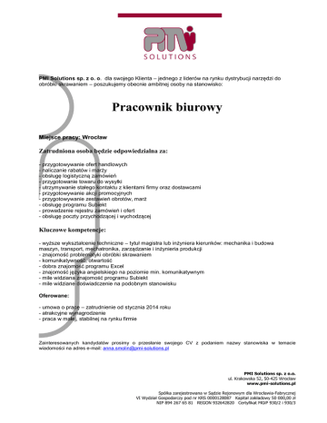PMI Solutions sp. z o. o. dla swojego Klienta – jednego z liderów na rynku dystrybucji narzędzi do obróbki skrawaniem – poszukujemy obecnie ambitnej osoby na stanowisko: Pracownik biurowy Miejsce pracy: Wrocław Zatrudniona osoba będzie odpowiedzialna za: - przygotowywanie ofert handlowych - naliczanie rabatów i marży - obsługę logistyczną zamówień - przygotowanie towaru do wysyłki - utrzymywanie stałego kontaktu z klientami firmy oraz dostawcami - przygotowywanie akcji promocyjnych - przygotowywanie zestawień obrotów, marż - obsługę programu Subiekt - prowadzenie rejestru zamówień i ofert - obsługę poczty przychodzącej i wychodzącej Kluczowe kompetencje: - wyższe wykształcenie techniczne – tytuł magistra lub inżyniera kierunków: mechanika i budowa maszyn, transport, mechatronika, zarządzanie i inżynieria produkcji - znajomość problematyki obróbki skrawaniem - komunikatywność, otwartość - dobra znajomość programu Excel - znajomość języka angielskiego na poziomie min. komunikatywnym - mile widziana znajomość programu Subiekt - mile widziane doświadczenie na podobnym stanowisku Oferowane: - umowa o pracę – zatrudnienie od stycznia 2014 roku - atrakcyjne wynagrodzenie - praca w małej, stabilnej na rynku firmie Zainteresowanych kandydatów prosimy o przesłanie swojego CV z podaniem nazwy stanowiska w temacie wiadomości na adres e-mail: [email protected] PMI Solutions sp. z o.o. ul. Krakowska 52, 50-425 Wrocław www.pmi-solutions.pl Spółka zarejestrowana w Sądzie Rejonowym dla Wrocławia-Fabrycznej VI Wydział Gospodarczy pod nr KRS 0000128087 Kapitał zakładowy 50 000,00 zł NIP 894 267 65 81 REGON 932642820 Certyfikat MGiP 930/2 i 930/3