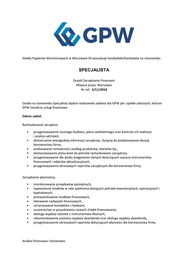 Giełda Papierów Wartościowych w Warszawie SA poszukuje kandydatki/kandydata na stanowisko: SPECJALISTA Zespół Zarządzania Finansami Miejsce pracy: Warszawa Nr ref.: S/11/2016 Osoba na stanowisku Specjalisty będzie realizowała zadania dla GPW jak i spółek zależnych, którym GPW świadczy usługi finansowe. Zakres zadań: Rachunkowość zarządcza • • • • • • przygotowywanie rocznego budżetu, planu wieloletniego oraz kontrola ich realizacji i analiza odchyleń, dostarczanie wiarygodnej informacji zarządczej, służącej do podejmowania decyzji kierownictwu firmy, analizowanie rentowności według produktów, klientów itp., dostosowywanie planu kont do potrzeb rachunkowości zarządczej, przygotowywanie dla działu księgowości danych dotyczących wyceny instrumentów finansowych i odpisów aktualizacyjnych, przygotowywanie okresowych raportów zarządczych dla kierownictwa firmy. Zarządzanie płynnością • • • • • • • • • monitorowanie przepływów pieniężnych, zapewnienie środków w celu spełnienia bieżących potrzeb inwestycyjnych, operacyjnych i kapitałowych, przewalutowanie środków finansowych, lokowanie nadwyżek finansowych, utrzymywanie kontaktów z bankami, uczestnictwo w pozyskiwaniu nowych źródeł finansowania, obsługa wypłaty odsetek z instrumentów dłużnych, rekomendowanie poziomu wypłaty dywidendy oraz obsługa wypłaty dywidendy, przygotowywanie okresowych raportów dotyczących płynności dla kierownictwa firmy. Analiza finansowa i biznesowa formułowanie planów strategicznych i długoterminowych biznesowych, analiza wyników biznesowych, analiza konkurencji i trendów rynkowych, analiza możliwości i skutków zamian cen usług, analiza możliwości redukcji kosztów, przygotowywanie raportów okresowych GPW jako spółki publicznej, przygotowywanie dodatkowych analiz i sprawozdań wymaganych przez kierownictwo. Oczekujemy: co najmniej 4 letniego doświadczenia na stanowisku specjalisty ds. kontrolingu lub w firmie audytorskiej, wiedzy z obszaru analizy finansowej, rachunkowości finansowej i zarządczej, dobrej znajomości języka angielskiego, znajomości MS Excel i Access na poziomie średniozaawansowanym. Mile widziane: znajomość rynku kapitałowego, znajomość VBA - średnio-zaawansowany (budowa funkcji, makr itp. w Excel i Access), znajomość SQL - średnio-zaawansowany (pisanie zapytań, funkcji w bazie danych Oracle) lub SQL Server, mySQL, znajomość nierelacyjnych baz danych (tzw. NoSQL), tworzenie aplikacji automatyzujących przetwarzanie danych (np. C#, .NET), Oferujemy: współpracę w oparciu o umowę o pracę, ciekawą pracę w środowisku rynku kapitałowego, możliwość rozwoju zawodowego, atrakcyjne szkolenia oraz bogaty pakiet kafeteryjny . Osoby zainteresowane prosimy o przesyłanie aplikacji ( CV oraz List Motywacyjny) na adres [email protected] z podanym w tytule maila nr ref.: S/11/2016. Do aplikacji prosimy dołączyć klauzulę: "Wyrażam zgodę na przetwarzanie moich danych osobowych przez Giełdę Papierów Wartościowych w Warszawie SA , z siedzibą przy ul. Książęcej 4 w Warszawie 00-498 dla potrzeb niezbędnych do realizacji procesu rekrutacji prowadzonego obecnie lub w przyszłości, zgodnie z przepisami ustawy z dnia 29.08.1997 o ochronie danych osobowych (tj. Dz. U. 2015 r., poz. 2135). Przyjmuję do wiadomości, że przysługuje mi prawo wglądu do treści moich danych oraz ich poprawiania". Uprzejmie informujemy, że skontaktujemy się z wybranymi kandydatkami/kandydatami.