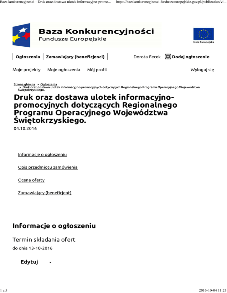 Baza konkurencyjności - Druk oraz dostawa ulotek informacyjno-promo... 1z5 Ogłoszenia Moje projekty Zamawiający (bene cjenci) Moje ogłoszenia https://bazakonkurencyjnosci.funduszeeuropejskie.gov.pl/publication/vi... Dorota Fecek Dodaj ogłoszenie Mój pro l Wyloguj się Strona główna > Ogłoszenia > Druk oraz dostawa ulotek informacyjno-promocyjnych dotyczących Regionalnego Programu Operacyjnego Województwa Świętokrzyskiego. Druk oraz dostawa ulotek informacyjnopromocyjnych dotyczących Regionalnego Programu Operacyjnego Województwa Świętokrzyskiego. 04.10.2016 Informacje o ogłoszeniu Opis przedmiotu zamówienia Ocena oferty Zamawiający (bene cjent) Informacje o ogłoszeniu Termin składania ofert do dnia 13-10-2016 Edytuj 2016-10-04 11:23 Baza konkurencyjności - Druk oraz dostawa ulotek informacyjno-promo... 2z5 https://bazakonkurencyjnosci.funduszeeuropejskie.gov.pl/publication/vi... Nazwa zamawiającego WOJEWÓDZKI URZĄD PRACY W KIELCACH Numer ogłoszenia 1008183 Status ogłoszenia Aktualne Treść ogłoszenia została zmieniona Druk oraz dostawa ulotek informacyjno-promocyjnych dotyczących Regionalnego Programu Operacyjnego Województwa Świętokrzyskiego. Miejsce i sposób składania ofert Oferty należy składać do dnia 13.10.2016 r. godz. 15.30. Wykonawca może złożyć ofertę: w formie pisemnej (papierowej) w siedzibie Zamawiającego albo przesłać na adres: Wojewódzki Urząd Pracy w Kielcach ul. Witosa 86 - Kancelaria, 25-561 Kielce. W przypadku składania oferty osobiście lub wysłania oferty pocztą albo kurierem, Zamawiający informuje, że kancelaria Wojewódzkiego Urzędu Pracy w Kielcach jest czynna od poniedziałku do piątku w godz. 7.30 – 15.30. Osoba do kontaktu w sprawie ogłoszenia Dorota Fecek Nr telefonu osoby upoważnionej do kontaktu w sprawie ogłoszenia 41 364 16 22 Skrócony opis przedmiotu zamówienia Druk oraz dostawa 90 tysięcy ulotek informacyjno-promocyjnych dotyczących Regionalnego Programu Operacyjnego Województwa Świętokrzyskiego. Szczegółowy opis przedmiotu zamówienia znajduje się w Załączniku nr 1 do Zapytania ofertowego. Nazwa i kody stosowane we Wspólnym Słowniku Zamówień (CPV): 22140000-3 - Ulotki. Rodzaj zamówienia: dostawa. Kategoria ogłoszenia Dostawy Podkategoria ogłoszenia Druk Miejsce realizacji zamówienia Województwo: świętokrzyskie Powiat: Kielce Miejscowość: Kielce 2016-10-04 11:23 Baza konkurencyjności - Druk oraz dostawa ulotek informacyjno-promo... 3z5 https://bazakonkurencyjnosci.funduszeeuropejskie.gov.pl/publication/vi... Opis przedmiotu zamówienia Cel zamówienia Uzyskanie/otrzymanie ulotek informacyjno-promocyjnych zgodnych z opisem zamówienia. Przedmiot zamówienia Przedmiotem zamówienia jest druk oraz dostawa ulotek informacyjno-promocyjnych dotyczących Regionalnego Programu Operacyjnego Województwa Świętokrzyskiego. Kod CPV 22140000-3 Nazwa kodu CPV Ulotki Harmonogram realizacji zamówienia Nie przewiduje się podziału realizacji na terminy. Terminem końcowym realizacji zamówienia jest termin określony w ofercie. Załączniki Oświadczenie o braku powiązań kapitałowych lub osobowych i innych Wzór umowy Wzór formularza oferty Opis przedmiotu Zamówienia Zapytanie ofertowe Pytania i wyjaśnienia Brak pytań i wyjaśnień Lista dokumentów/oświadczeń wymaganych od Wykonawcy 1. Aktualny odpis z właściwego rejestru lub centralnej ewidencji i informacji o działalności gospodarczej, z którego wynika upoważnienie do podpisania oferty(wystawionego nie wcześniej niż 6 miesięcy przed upływem terminu składania ofert) lub pełnomocnictwo do reprezentowania Wykonawcy, o ile ofertę składa pełnomocnik (Dokumenty należy złożyć w formie oryginału lub kopii poświadczonej za zgodność z oryginałem przez Wykonawcę; pełnomocnictwa w formie oryginału lub kopii poświadczonej notarialnie „za zgodność z oryginałem”). 2. Oświadczenie o powiązaniach kapitałowych lub osobowych i innych w formie oryginału. Ocena oferty Kryteria oceny i opis sposobu przyznawania punktacji 1. Zamawiający w pierwszej kolejności oceni, czy Wykonawcy, którzy złożyli oferty, nie podlegają 2016-10-04 11:23 Baza konkurencyjności - Druk oraz dostawa ulotek informacyjno-promo... 4z5 https://bazakonkurencyjnosci.funduszeeuropejskie.gov.pl/publication/vi... wykluczeniu z postępowania, a następnie oceni, czy oferty nie podlegają odrzuceniu. 2. Zamawiający dokona wyboru najkorzystniejszej oferty, spośród ofert spełniających wymagania zawarte w zapytaniu, z zastosowaniem następującego kryterium oceny: cena – 100% a) Zamawiający dokona oceny ofert przyznając punkty przyjmując zasadę, że 1% - 1 punkt. Cena oferty najtańszej ------------------------------ x 100 = liczba punktów Cena oferty badanej b) Końcowy wynik powyższego działania zostanie zaokrąglony do dwóch miejsc po przecinku. c) Za najkorzystniejszą zostanie uznana oferta z największą liczbą punktów. Wykluczenia W przypadku braku złożenia oświadczenia o powiązaniach kapitałowych lub osobowych i innych, Wykonawca zobowiązany zostanie do jednokrotnego uzupełnienia. Brak uzupełnienia skutkował będzie wykluczeniem Wykonawcy. Zamawiający (bene cjent) Nazwa WOJEWÓDZKI URZĄD PRACY W KIELCACH Adres Wincentego Witosa 86 25-561 Kielce świętokrzyskie , Kielce Numer telefonu 41 3641625 Fax 413641666 NIP 9591457717 Tytuł projektu Działania Informacyjne i promocyjne RPOWŚ Numer projektu RPSW.11.03.00-26-0008/16-00 2016-10-04 11:23 Baza konkurencyjności - Druk oraz dostawa ulotek informacyjno-promo... 5z5 https://bazakonkurencyjnosci.funduszeeuropejskie.gov.pl/publication/vi... Liczba wyświetleń: 1 Ministerstwo Rozwoju Pl. Trzech Krzyży 3/5 Regulamin Jak znaleźć 00-507 Warszawa O Bazie ogłoszenie pn. - pt. 8.15-16.15 Konkurencyjności Jak dodać ogłoszenie tel.: 22 273 70 00 Polityka prywatności Kontakt Wsparcie techniczne: Dostępna strona Mapa strony [email protected] FAQ tel.: 2