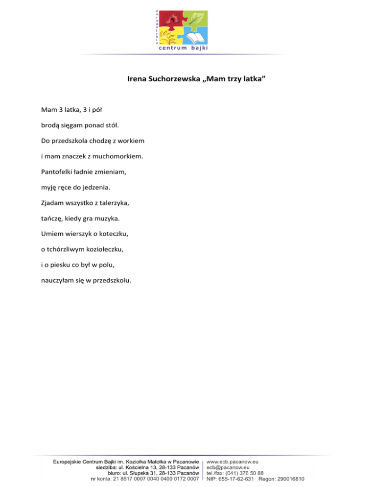 Irena Suchorzewska „Mam trzy latka” Mam 3 latka, 3 i pół brodą sięgam ponad stół. Do przedszkola chodzę z workiem i mam znaczek z muchomorkiem. Pantofelki ładnie zmieniam, myję ręce do jedzenia. Zjadam wszystko z talerzyka, taoczę, kiedy gra muzyka. Umiem wierszyk o koteczku, o tchórzliwym koziołeczku, i o piesku co był w polu, nauczyłam się w przedszkolu.