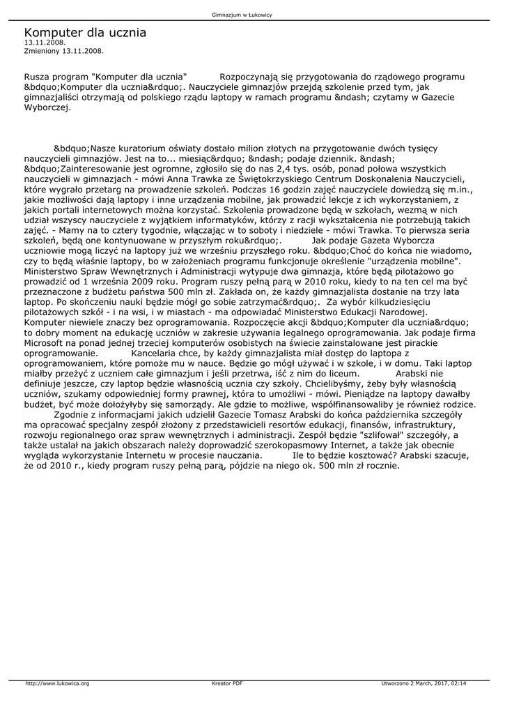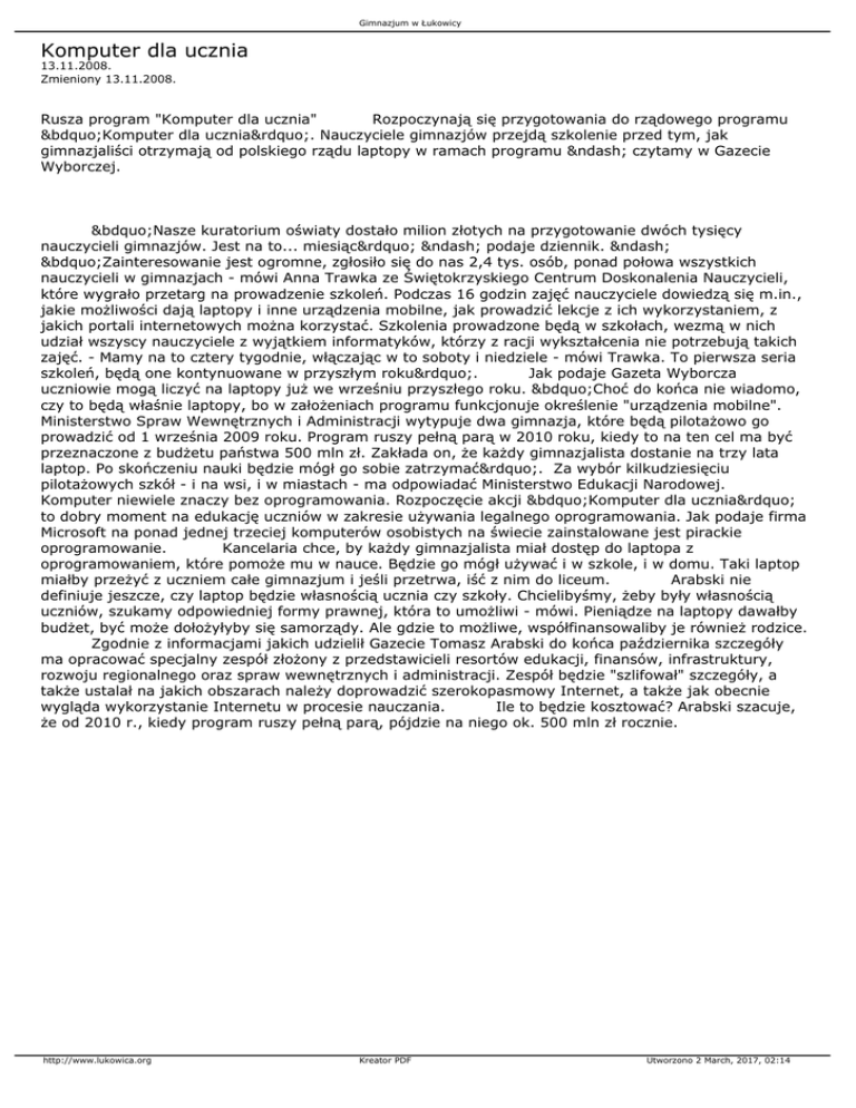 Gimnazjum w Łukowicy Komputer dla ucznia 13.11.2008. Zmieniony 13.11.2008. Rusza program "Komputer dla ucznia" Rozpoczynają się przygotowania do rządowego programu „Komputer dla ucznia”. Nauczyciele gimnazjów przejdą szkolenie przed tym, jak gimnazjaliści otrzymają od polskiego rządu laptopy w ramach programu – czytamy w Gazecie Wyborczej. „Nasze kuratorium oświaty dostało milion złotych na przygotowanie dwóch tysięcy nauczycieli gimnazjów. Jest na to... miesiąc” – podaje dziennik. – „Zainteresowanie jest ogromne, zgłosiło się do nas 2,4 tys. osób, ponad połowa wszystkich nauczycieli w gimnazjach - mówi Anna Trawka ze Świętokrzyskiego Centrum Doskonalenia Nauczycieli, które wygrało przetarg na prowadzenie szkoleń. Podczas 16 godzin zajęć nauczyciele dowiedzą się m.in., jakie możliwości dają laptopy i inne urządzenia mobilne, jak prowadzić lekcje z ich wykorzystaniem, z jakich portali internetowych można korzystać. Szkolenia prowadzone będą w szkołach, wezmą w nich udział wszyscy nauczyciele z wyjątkiem informatyków, którzy z racji wykształcenia nie potrzebują takich zajęć. - Mamy na to cztery tygodnie, włączając w to soboty i niedziele - mówi Trawka. To pierwsza seria szkoleń, będą one kontynuowane w przyszłym roku”. Jak podaje Gazeta Wyborcza uczniowie mogą liczyć na laptopy już we wrześniu przyszłego roku. „Choć do końca nie wiadomo, czy to będą właśnie laptopy, bo w założeniach programu funkcjonuje określenie "urządzenia mobilne". Ministerstwo Spraw Wewnętrznych i Administracji wytypuje dwa gimnazja, które będą pilotażowo go prowadzić od 1 września 2009 roku. Program ruszy pełną parą w 2010 roku, kiedy to na ten cel ma być przeznaczone z budżetu państwa 500 mln zł. Zakłada on, że każdy gimnazjalista dostanie na trzy lata laptop. Po skończeniu nauki będzie mógł go sobie zatrzymać”. Za wybór kilkudziesięciu pilotażowych szkół - i na wsi, i w miastach - ma odpowiadać Ministerstwo Edukacji Narodowej. Komputer niewiele znaczy bez oprogramowania. Rozpoczęcie akcji „Komputer dla ucznia” to dobry moment na edukację uczniów w zakresie używania legalnego oprogramowania. Jak podaje firma Microsoft na ponad jednej trzeciej komputerów osobistych na świecie zainstalowane jest pirackie oprogramowanie. Kancelaria chce, by każdy gimnazjalista miał dostęp do laptopa z oprogramowaniem, które pomoże mu w nauce. Będzie go mógł używać i w szkole, i w domu. Taki laptop miałby przeżyć z uczniem całe gimnazjum i jeśli przetrwa, iść z nim do liceum. Arabski nie definiuje jeszcze, czy laptop będzie własnością ucznia czy szkoły. Chcielibyśmy, żeby były własnością uczniów, szukamy odpowiedniej formy prawnej, która to umożliwi - mówi. Pieniądze na laptopy dawałby budżet, być może dołożyłyby się samorządy. Ale gdzie to możliwe, współfinansowaliby je również rodzice. Zgodnie z informacjami jakich udzielił Gazecie Tomasz Arabski do końca października szczegóły ma opracować specjalny zespół złożony z przedstawicieli resortów edukacji, finansów, infrastruktury, rozwoju regionalnego oraz spraw wewnętrznych i administracji. Zespół będzie "szlifował" szczegóły, a także ustalał na jakich obszarach należy doprowadzić szerokopasmowy Internet, a także jak obecnie wygląda wykorzystanie Internetu w procesie nauczania. Ile to będzie kosztować? Arabski szacuje, że od 2010 r., kiedy program ruszy pełną parą, pójdzie na niego ok. 500 mln zł rocznie. http://www.lukowica.org Kreator PDF Utworzono 2 March, 2017, 02:14
