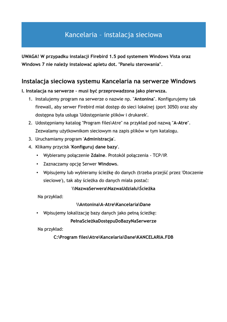Kancelaria – instalacja sieciowa UWAGA! W przypadku instalacji Firebird 1.5 pod systemem Windows Vista oraz Windows 7 nie należy instalować apletu dot. "Panelu sterowania". Instalacja sieciowa systemu Kancelaria na serwerze Windows I. Instalacja na serwerze – musi być przeprowadzona jako pierwsza. 1. Instalujemy program na serwerze o nazwie np. "Antonina". Konfigurujemy tak firewall, aby serwer Firebird miał dostęp do sieci lokalnej (port 3050) oraz aby dostępna była usługa 'Udostępnianie plików i drukarek'. 2. Udostępniamy katalog "Program files\Atre" na przykład pod nazwą "A-Atre". Zezwalamy użytkownikom sieciowym na zapis plików w tym katalogu. 3. Uruchamiamy program 'Administracja'. 4. Klikamy przycisk 'Konfiguruj dane bazy'. • Wybieramy połączenie Zdalne. Protokół połączenia - TCP/IP. • Zaznaczamy opcję Serwer Windows. • Wpisujemy lub wybieramy ścieżkę do danych (trzeba przejść przez 'Otoczenie sieciowe'), tak aby ścieżka do danych miała postać: \\NazwaSerwera\NazwaUdziału\Ścieżka Na przykład: \\Antonina\A-Atre\Kancelaria\Dane • Wpisujemy lokalizację bazy danych jako pełną ścieżkę: PełnaScieżkaDostępuDoBazyNaSerwerze Na przykład: C:\Program files\Atre\Kancelaria\Dane\KANCELARIA.FDB 5. Klikamy Testuj połączenie. Jeśli połączenie z bazą zostanie nawiązane poprawnie, klikamy Zapisz, aby zapamiętać wybrane ustawienia. 6. Możemy teraz uruchomić program Kancelaria, aby ustawić wspólne dla wszystkich użytkowników ścieżki do dokumentów, wzorców, poczty i kopii zapasowych. Ścieżki te muszą mieć postać taką, jak ścieżka do danych. Na przykład: \\Antonina\A-Atre\Kancelaria\Dokumenty \\Antonina\A-Atre\Kancelaria\Wzorce \\Antonina\A-Atre\Kancelaria\Poczta \\Antonina\A-Atre\Kancelaria\Kancelaria_kopie II. Instalacja na końcówce. 1. Uruchamiamy instalator na końcówce. 2. Uruchamiamy program 'Administracja' na końcówce. 3. Konfigurujemy połączenie z bazą tak samo jak na serwerze. Wszystkie opcje i ścieżki muszą wyglądać tak, jak opisano powyżej. 4. Testujemy połączenie i jeśli zostało nawiązane poprawnie, zapisujemy dane. 5. Uruchamiamy program Kancelaria i określamy ścieżki dostępu do dokumentów, wzorców, poczty i kopii zapasowych. Ścieżki te muszą mieć postać taką, jak zadeklarowano to na serwerze. Tylko wtedy użytkownicy będą mogli korzystać ze wspólnych danych zgromadzonych w bazie i zapisanych w katalogach. Instalacja sieciowa systemu Kancelaria na serwerze Linux 1. Należy zainstalować Firebird SuperServer na serwerze Linuxa (korzystając z pakietów ".rpm" lub "tar.gz"). Aktualnie są to pliki: http://prdownloads.sourceforge.net/firebird/FirebirdSS-1.5.2.4731-0.i686.rpm http://prdownloads.sourceforge.net/firebird/FirebirdSS-1.5.2.4731-0.i686.tar.gz Adres strony domowej Firebird, z której można pobrać aktualne pliki: http://www.firebirdsql.org. 2. W czasie instalacji skrypt instalacyjny pakietu założy w systemie: użytkownika firebird oraz grupę firebird. Serwer bazy danych domyślnie będzie uruchamiany z uprawnieniami tego użytkownika. 3. Katalogiem domowym użytkownika firebird jest podkatalog /firebird (np. w dystrybucji Fedora Core 3 w katalogu opt/firebird), gdzie zainstalowany zostanie serwer bazy danych. Skrypt instalacyjny zmienia również domyślne hasło wbudowanego konta superużytkownika bazy Firebird – SYSDBA na hasło wylosowane – skrypt zapisuje je dla informacji administratora w pliku /firebird/SYSDBA.password, uaktualniany jest również skrypt /etc/rc.d/init.d/firebird, który podczas startu systemu uruchamia serwer bazy danych. Do zmiany hasła superużytkownika służy skrypt /firebird/bin/changeDBAPassword.sh. Należy je zmienić na masterkey. 4. Administrator powinien utworzyć na serwerze katalog, w którym znajdą się plik bazy danych Kancelaria.fdb oraz pozostałe dane - dokumenty, wzorce, itd. Najlepiej, gdyby był to katalog /Atre/Kancelaria. Katalog musi znajdować się na dysku lokalnym serwera, a jego właścicielem powinien być użytkownik firebird z prawami do odczytu, zapisu i wykonywania. 5. Program instalujemy z końcówki Windowsowej, jako miejsce lokalizacji bazy i katalogów z danymi wskazując ścieżki na serwerze Linux. 6. Po instalacji programu konfigurujemy katalogi i pliki utworzone przez program tak, aby użytkownicy zalogowani na końcówkach mieli dostęp do odczytu i zapisu plików dokumentów, wzorców, itd. 7. Testujemy połączenie ręcznie. Można to zrobić korzystając z programu "isql" konsoli bazy Firebird. W tym celu należy wydać polecenie /firebird/bin/isql -u SYSDBA -p masterkey localhost:/Kancelaria/Dane/Kancelaria.fdb. Jeśli poprawnie zainstalowano i skonfigurowano bazę danych oraz uprawnienia, powinien pojawić się znak zachęty SQL>. Jeśli natomiast wyświetlony został komunikat o błędzie, to albo źle zostały skonfigurowane prawa dostępu do bazy albo trzeba doinstalować dodatkowe pakiety (“inetd”, „xinetd” ) i je uruchomić. Pamiętać należy, że dopóki z bazą danych nie będzie można połączyć się ręcznie, na pewno nie będzie to możliwe z poziomu programu. 8. Instalujemy program na pozostałych końcówkach. 9. Uruchamiamy program 'Administracja' na każdej końcówce. 10.Klikamy przycisk 'Konfiguruj dane bazy'. • Wybieramy połączenie Zdalne. Protokół połączenia - TCP/IP. • Zaznaczamy opcję Serwer Linux. • Wpisujemy lub wybieramy ścieżkę do danych (trzeba przejść przez 'Otoczenie sieciowe'), tak aby ścieżka do danych miała postać: \\NazwaSerwera\NazwaUdziału\Ścieżka Na przykład: \\Antonina\A-Atre\Kancelaria\Dane • Wpisujemy lokalizację bazy danych jako pełną ścieżkę: PełnaScieżkaDostępuDoBazyNaSerwerze Na przykład: /Atre/Kancelaria/Dane/Kancelaria.fdb 11. Na każdej końcówce uruchamiamy program Kancelaria, aby ustawić ścieżki do dokumentów, wzorców, poczty i kopii zapasowych. Ścieżki te muszą mieć postać taką, ja