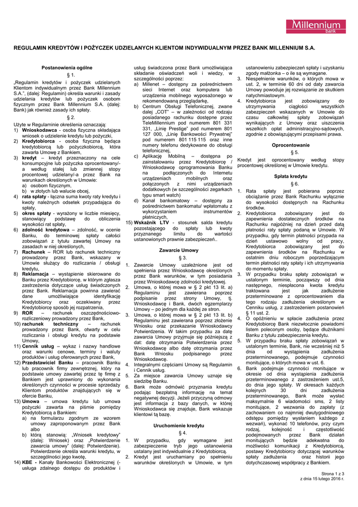 REGULAMIN KREDYTÓW I POŻYCZEK UDZIELANYCH KLIENTOM INDYWIDUALNYM PRZEZ BANK MILLENNIUM S.A. Postanowienia ogólne § 1. „Regulamin kredytów i pożyczek udzielanych Klientom indywidualnym przez Bank Millennium S.A.”, (dalej: Regulamin) określa warunki i zasady udzielania kredytów lub pożyczek osobom fizycznym przez Bank Millennium S.A. (dalej: Bank) jak również zasady ich spłaty. § 2. Użyte w Regulaminie określenia oznaczają: 1) Wnioskodawca - osoba fizyczna składająca wniosek o udzielenie kredytu lub pożyczki, 2) Kredytobiorca - osoba fizyczna będąca kredytobiorcą lub pożyczkobiorcą, która zawarła Umowę z Bankiem, 3) kredyt – kredyt przeznaczony na cele konsumpcyjne lub pożyczka oprocentowany/a według stałej lub zmiennej stopy procentowej udzielany/-a przez Bank na warunkach określonych w Umowie: a) osobom fizycznym, b) w złotych lub walucie obcej, 4) rata spłaty - łączna suma kwoty raty kredytu i kwoty należnych odsetek przypadająca do spłaty, 5) okres spłaty - wyrażony w liczbie miesięcy, stanowiący podstawę do obliczenia wysokości rat spłaty, 6) zdolność kredytowa – zdolność, w ocenie Banku, do terminowej spłaty całości zobowiązań z tytułu zawartej Umowy na zasadach w niej określonych, 7) Rachunek – ROR lub rachunek techniczny prowadzony przez Bank, wskazany w Umowie służący do rozliczania / obsługi kredytu, 8) Reklamacja – wystąpienie skierowane do Banku przez Kredytobiorcę, w którym zgłasza zastrzeżenia dotyczące usług świadczonych przez Bank. Reklamacja powinna zawierać dane umożliwiające identyfikację Kredytobiorcy oraz oczekiwany przez Kredytobiorcę sposób jej rozpatrzenia, 9) ROR – rachunek oszczędnościoworozliczeniowy prowadzony przez Bank, 10) rachunek techniczny – rachunek prowadzony przez Bank, otwarty w celu rozliczania i obsługi kredytu na podstawie Umowy, 11) Cennik usług – wykaz i nazwy handlowe oraz warunki cenowe, terminy i waluty produktów i usług oferowanych przez Bank, 12) Przedstawiciel Banku – pracownik Banku lub pracownik firmy zewnętrznej, który na podstawie umowy zawartej przez tę firmę z Bankiem jest uprawniony do wykonania określonych czynności w procesie sprzedaży Klientom produktów znajdujących się w ofercie Banku, 13) Umowa – umowa kredytu lub umowa pożyczki zawarta na piśmie pomiędzy Kredytobiorcą a Bankiem: a) na formularzu zgodnym ze wzorem umowy zaproponowanym przez Bank albo b) którą stanowią: „Wniosek kredytowy” (dalej: Wniosek) oraz „Potwierdzenie zawarcia umowy” (dalej: Potwierdzenie). Potwierdzenie określa warunki kredytu, w szczególności jego kwotę, 14) KBE - Kanały Bankowości Elektronicznej (usługa zdalnego dostępu do produktów i usług świadczona przez Bank umożliwiająca składanie oświadczeń woli i wiedzy, w szczególności poprzez: a) Millenet – dostępny za pośrednictwem sieci Internet oraz komputera lub urządzenia mobilnego wyposażonego w rekomendowaną przeglądarkę, b) Centrum Obsługi Telefonicznej, zwane dalej „COT” – w zależności od rodzaju posiadanego rachunku dostępne przez TeleMillennium pod numerem 801 331 331, „Linię Prestige” pod numerem 801 127 000, „Linię Bankowości Prywatnej” pod numerem 801 115 115 oraz inne numery telefonu dedykowane do obsługi telefonicznej, c) Aplikację Mobilną – dostępna po zainstalowaniu przez Kredytobiorcę / Wnioskodawcę oprogramowania Banku na podłączonych do Internetu urządzeniach mobilnych oraz połączonych z nimi urządzeniach dodatkowych (w szczególności zegarkach typu smart watch) d) Kanał bankomatowy – dostępny za pośrednictwem bankomatu/ wpłatomatu z wykorzystaniem instrumentów płatniczych, 15) Wskaźnik LTV - stosunek salda kredytu pozostającego do spłaty lub kwoty przyznanego limitu do wartości ustanowionych prawnie zabezpieczeń.. Zawarcie Umowy § 3. 1. Zawarcie Umowy uzależnione jest od spełnienia przez Wnioskodawcę określonych przez Bank warunków, w tym posiadania przez Wnioskodawcę zdolności kredytowej. 2. Umowa, o której mowa w § 2 pkt 13 lit. a) Regulaminu jest zawierana poprzez podpisanie przez strony Umowy, tj. Wnioskodawcę i Bank, dwóch egzemplarzy Umowy – po jednym dla każdej ze stron. 3. Umowa, o której mowa w § 2 pkt 13 lit. b) Regulaminu jest zawierana poprzez złożenie Wniosku oraz przekazanie Wnioskodawcy Potwierdzenia. W takim przypadku za datę zawarcia Umowy przyjmuje się późniejszą z dat: datę otrzymania Potwierdzenia przez Wnioskodawcę albo datę otrzymania przez Bank Wniosku podpisanego przez Wnioskodawcę. 4. Integralnymi częściami Umowy są Regulamin i Cennik usług. 5. Za miejsce zawarcia Umowy uznaje się siedzibę Banku. 6. Bank może odmówić przyznania kredytu podając bezpłatną informację na temat negatywnej decyzji. Jeżeli przyczyną odmowy jest informacja z bazy danych, w której Wnioskodawca się znajduje, Bank wskazuje klientowi tą bazę. Uruchomienie kredytu § 4. 1. W przypadku, gdy wymagane jest zabezpieczenie tryb jego ustanowienia ustalany jest indywidualnie z Kredytobiorcą. 2. Kredyt jest uruchamiany po spełnieniu warunków określonych w Umowie, w tym ustanowieniu zabezpieczeń spłaty i uzyskaniu zgody małżonka – o ile są wymagane. 3. Niespełnienie warunków, o których mowa w ust. 2, w terminie 60 dni od daty zawarcia Umowy powoduje jej rozwiązanie ze skutkiem natychmiastowym. 4. Kredytobiorca jest zobowiązany do utrzymywania ciągłości wszystkich zabezpieczeń wskazanych w Umowie do czasu całkowitej spłaty zobowiązań wynikających z Umowy oraz uiszczenia wszelkich opłat administracyjno-sądowych, zgodnie z obowiązującymi przepisami prawa. Oprocentowanie § 5. Kredyt jest oprocentowany według stopy procentowej określonej w Umowie kredytu. Spłata kredytu § 6. 1. Rata spłaty jest pobierana poprzez obciążanie przez Bank Rachunku wyłącznie do wysokości dostępnych na Rachunku środków. 2. Kredytobiorca zobowi